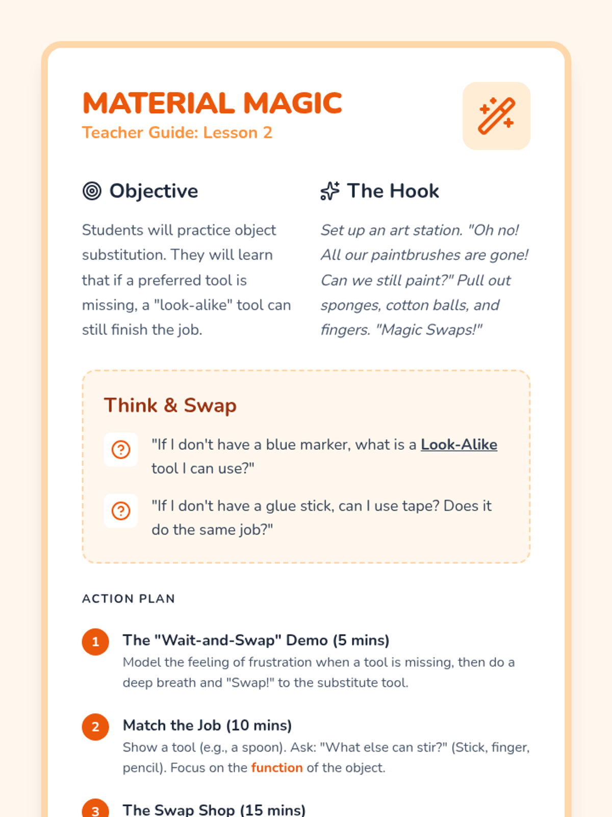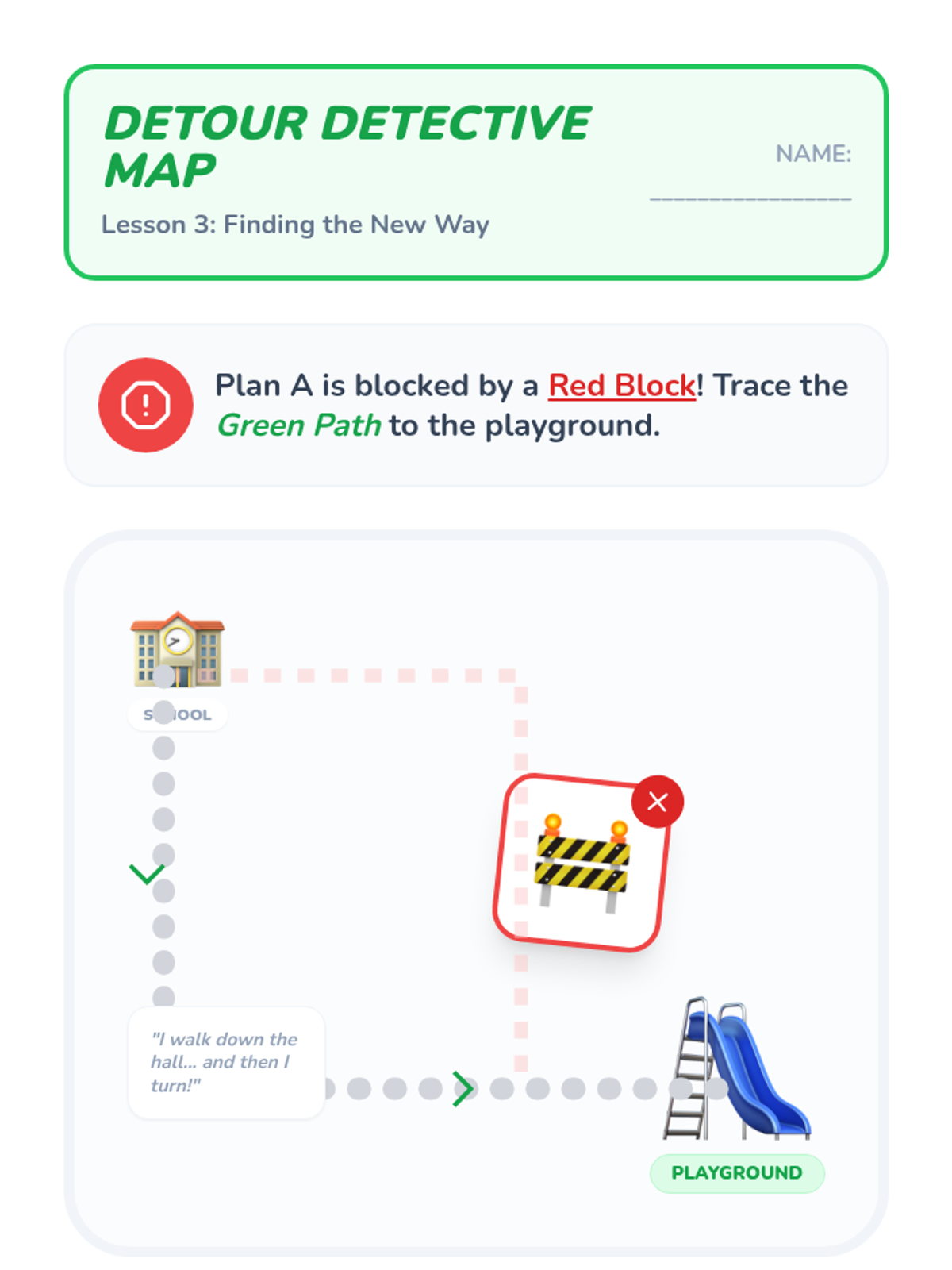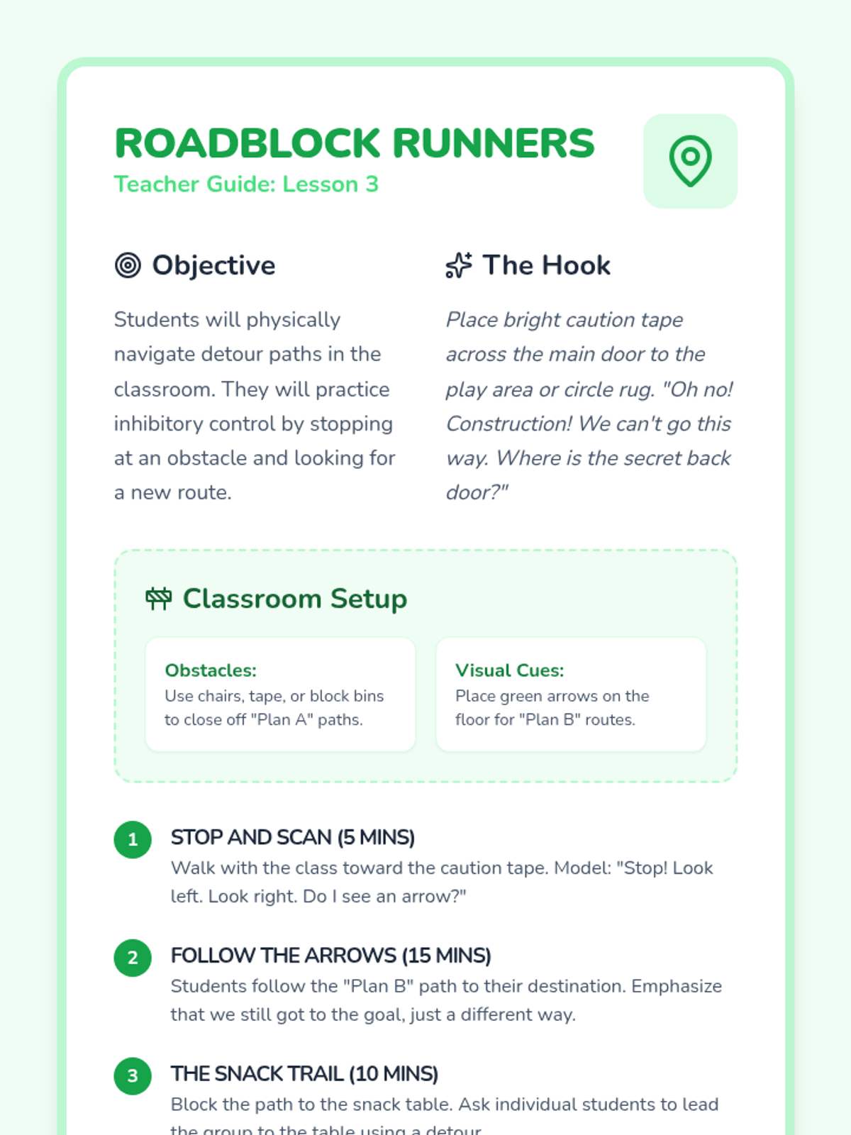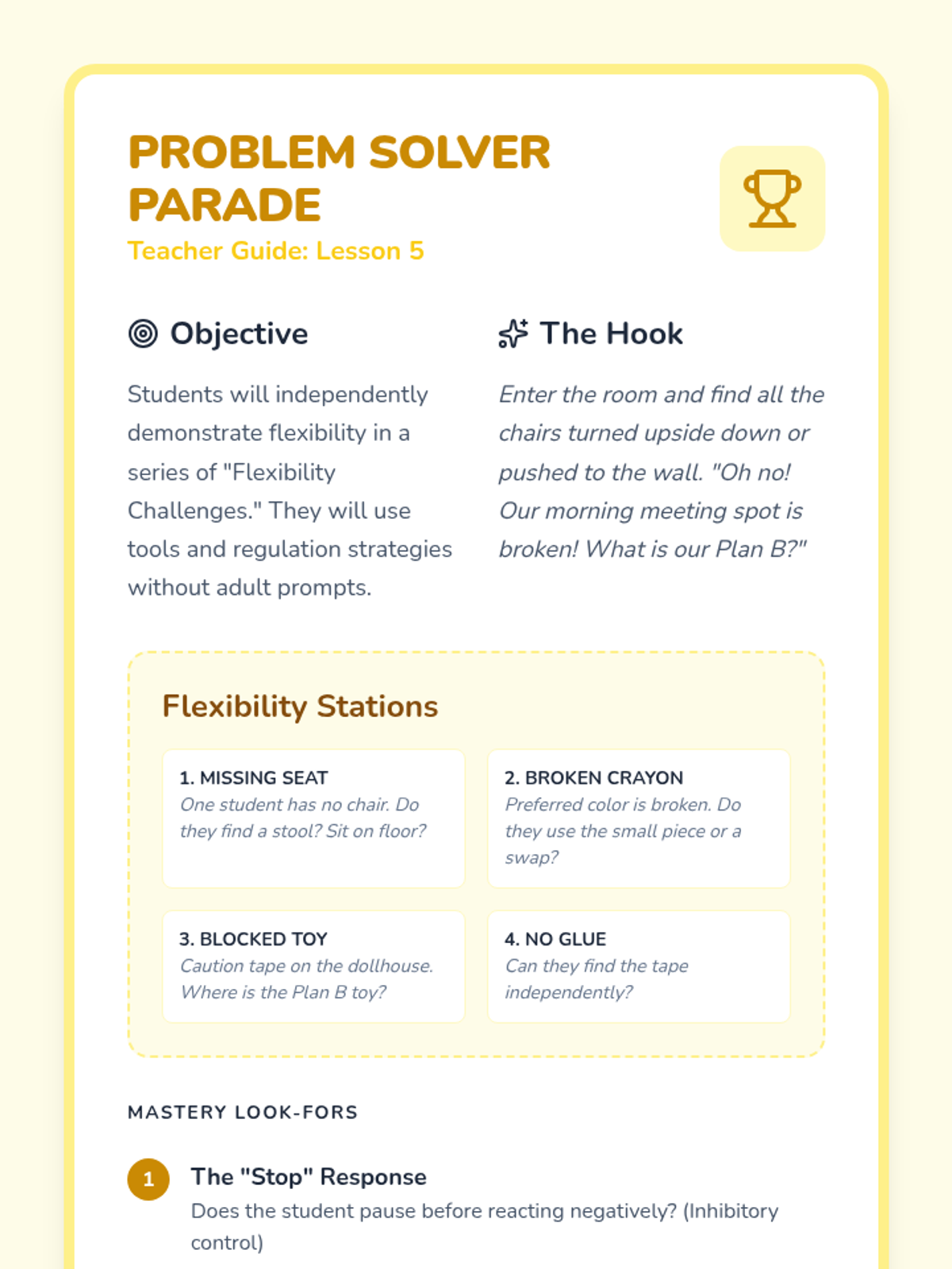 This sequence helps Pre-K students develop cognitive flexibility and executive function. Students learn to navigate disruptions, substitute tools, and manage emotions when plans change, building a 'Plan B' toolkit for classroom success.