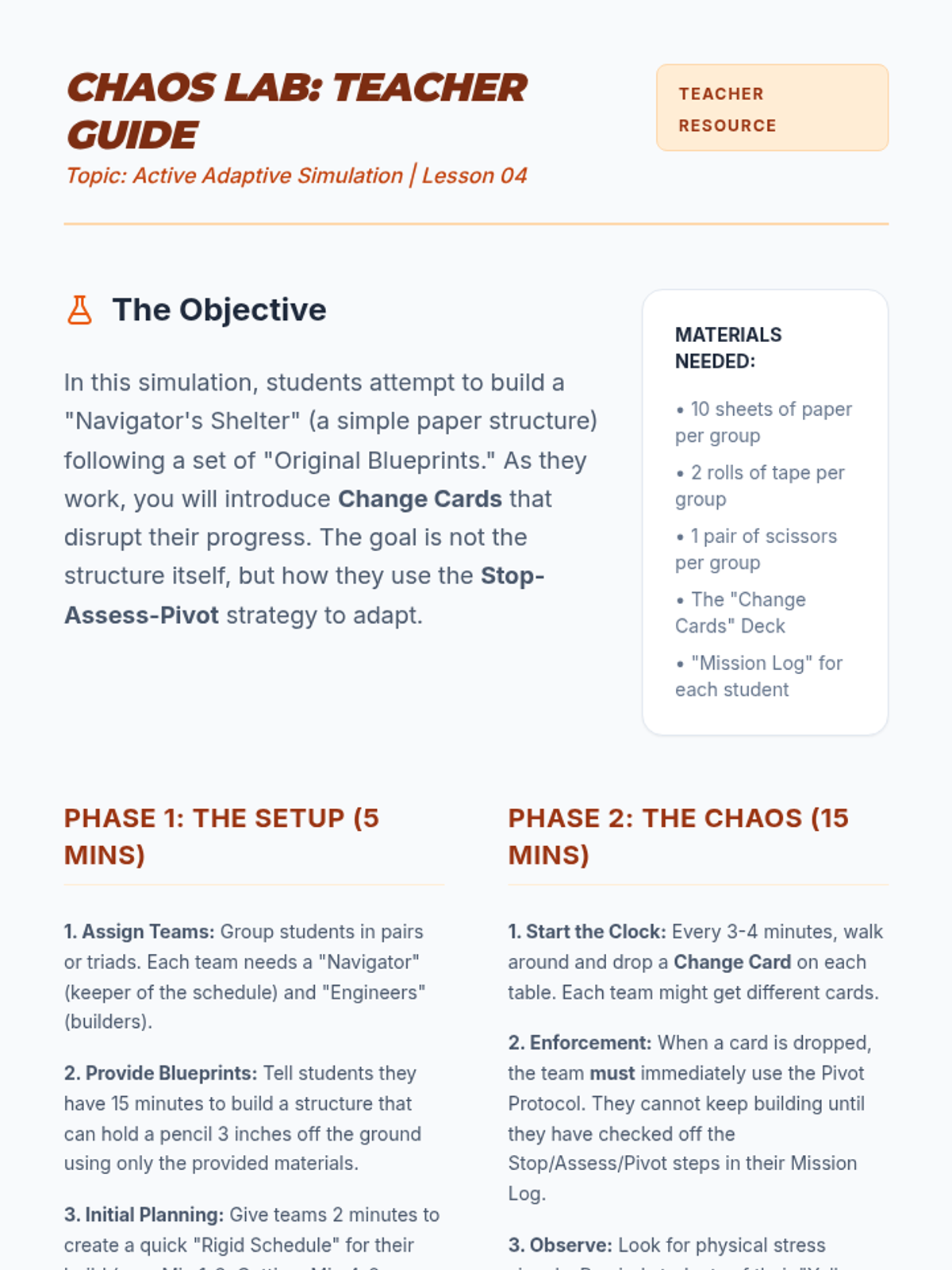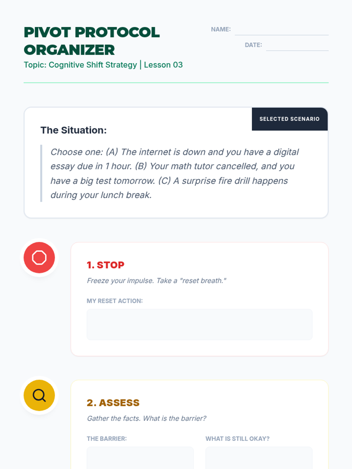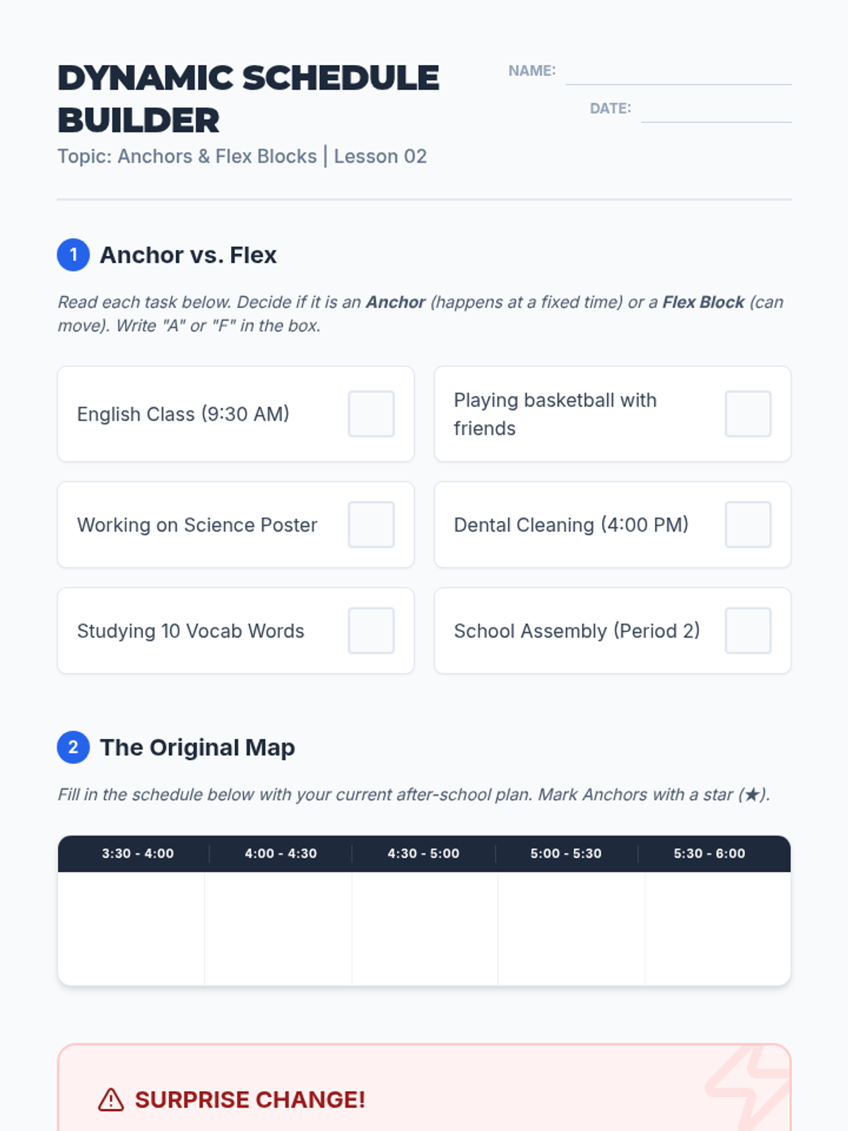 A five-lesson sequence for 8th-grade students focused on building cognitive flexibility and adaptive task management skills to handle unexpected changes in routines and schedules.
