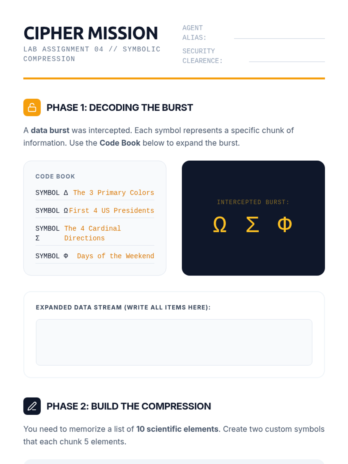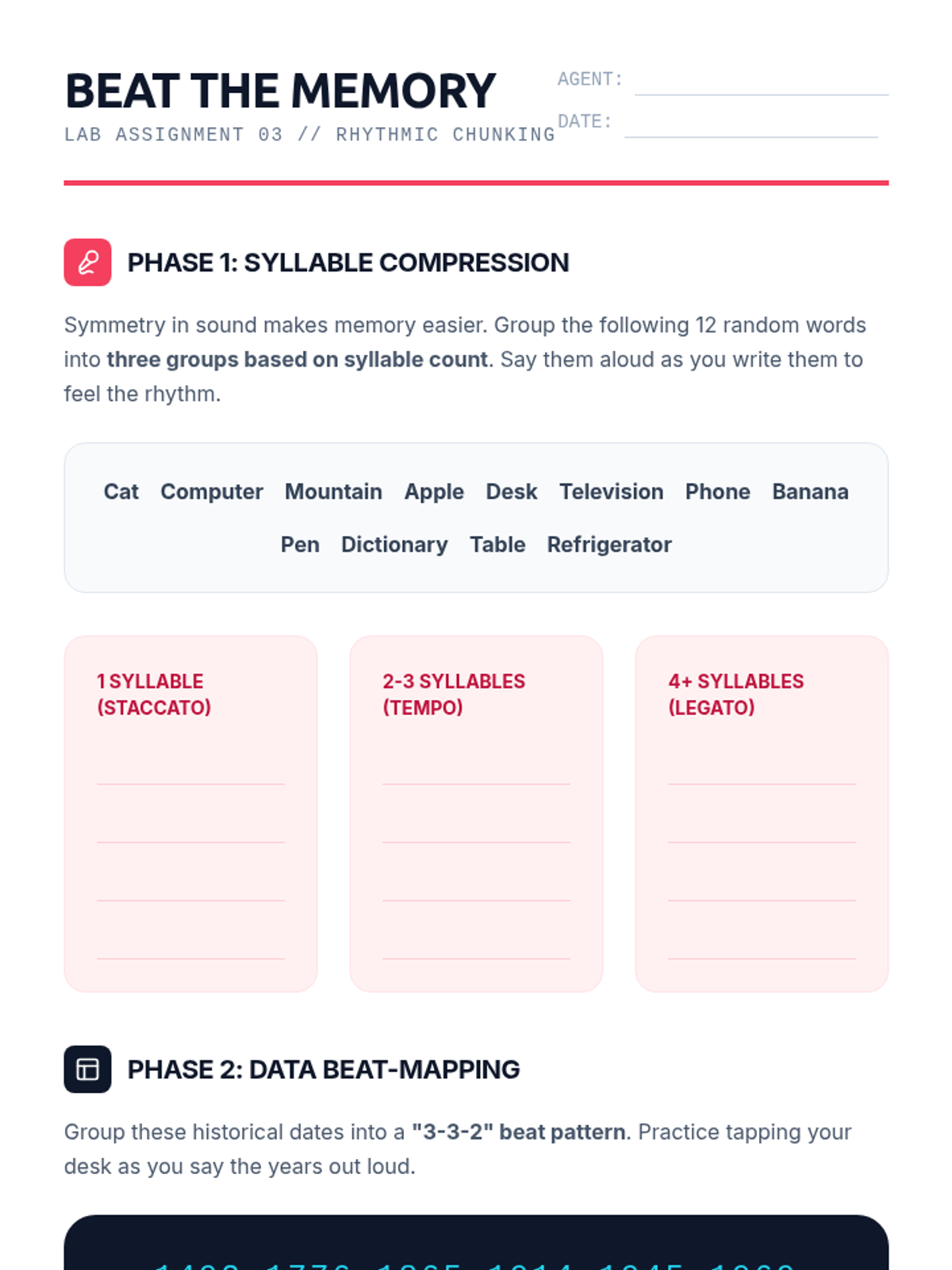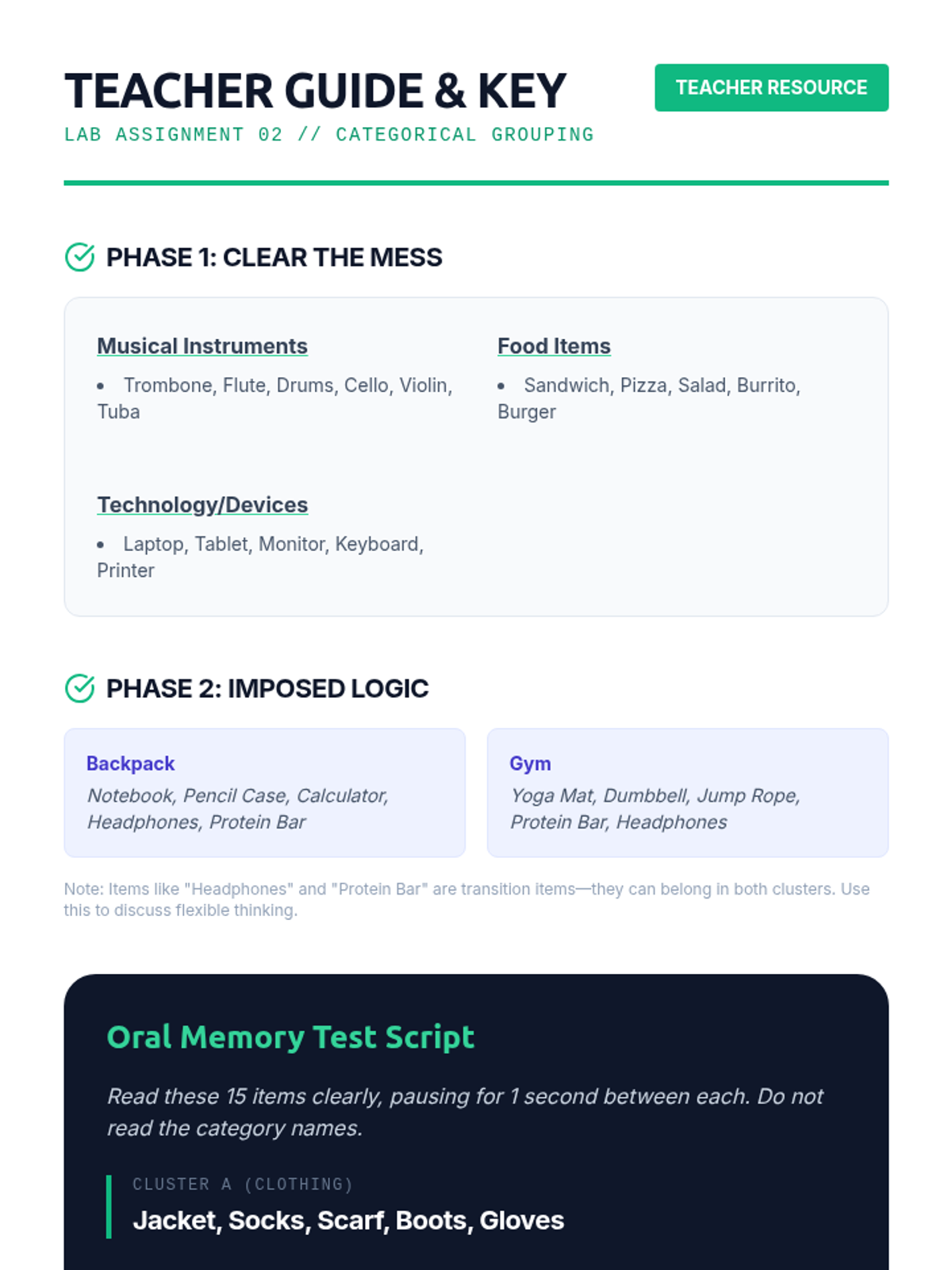A specialized cognitive training sequence for 11th-grade students to master working memory strategies. Through pattern recognition, categorical clustering, and spatial visualization, students learn to 'chunk' information, effectively expanding their mental processing capacity.