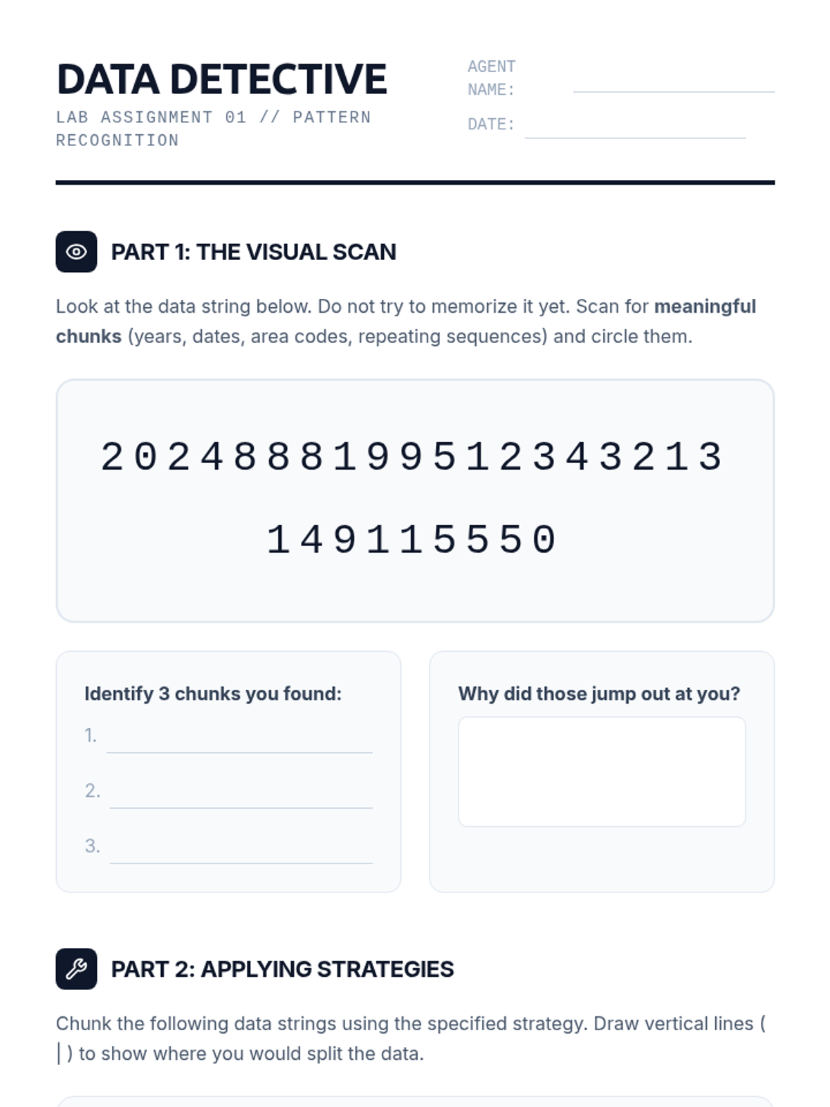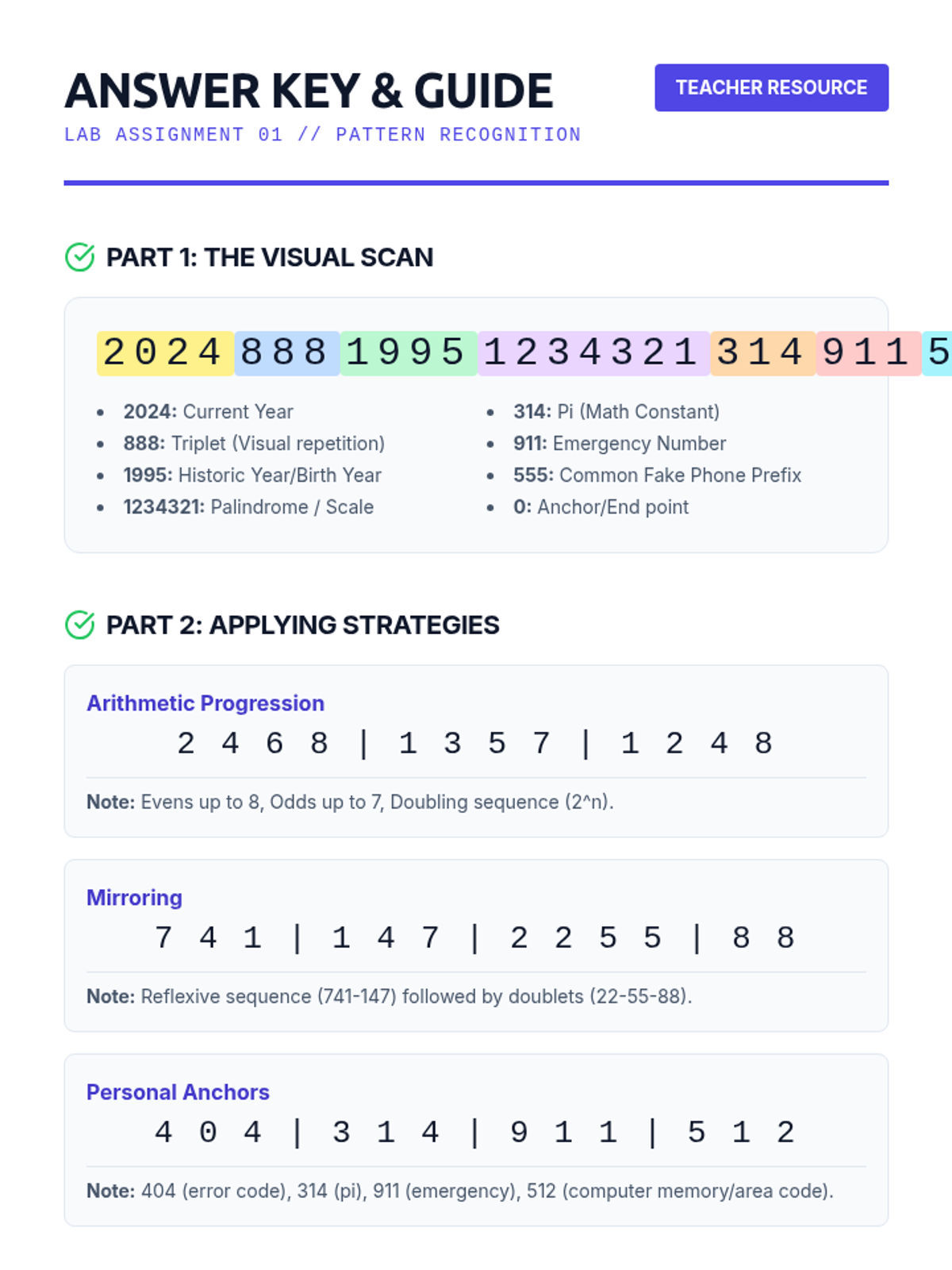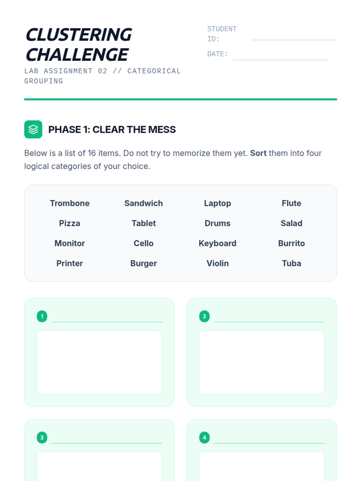 A specialized cognitive training sequence for 11th-grade students to master working memory strategies. Through pattern recognition, categorical clustering, and spatial visualization, students learn to 'chunk' information, effectively expanding their mental processing capacity.