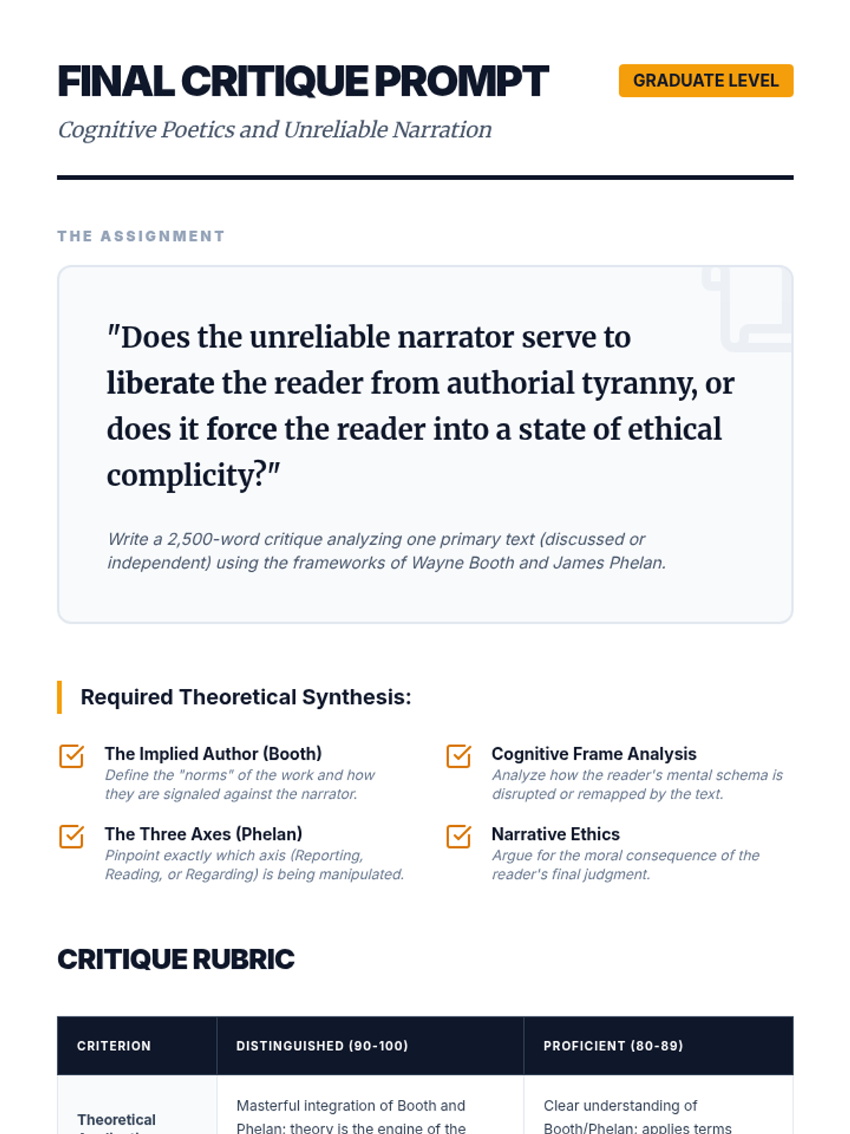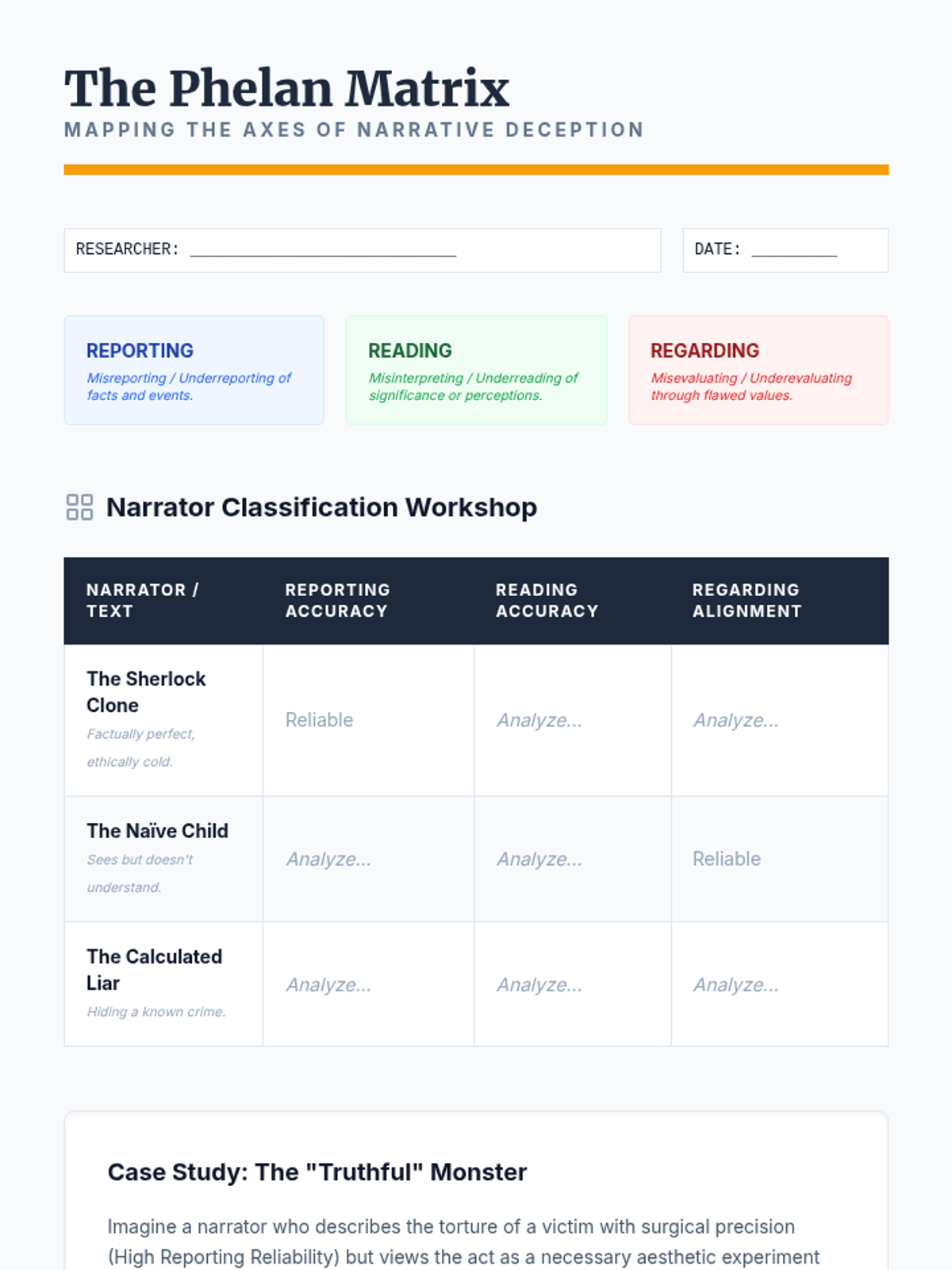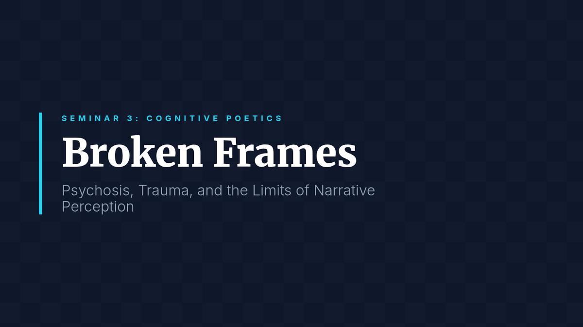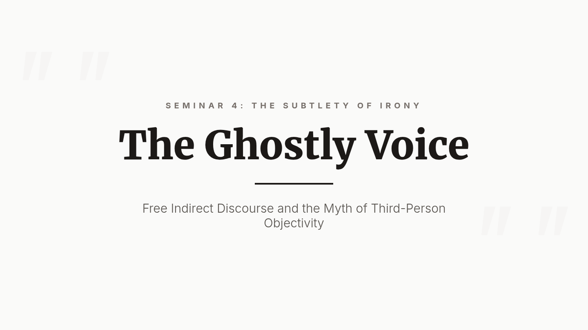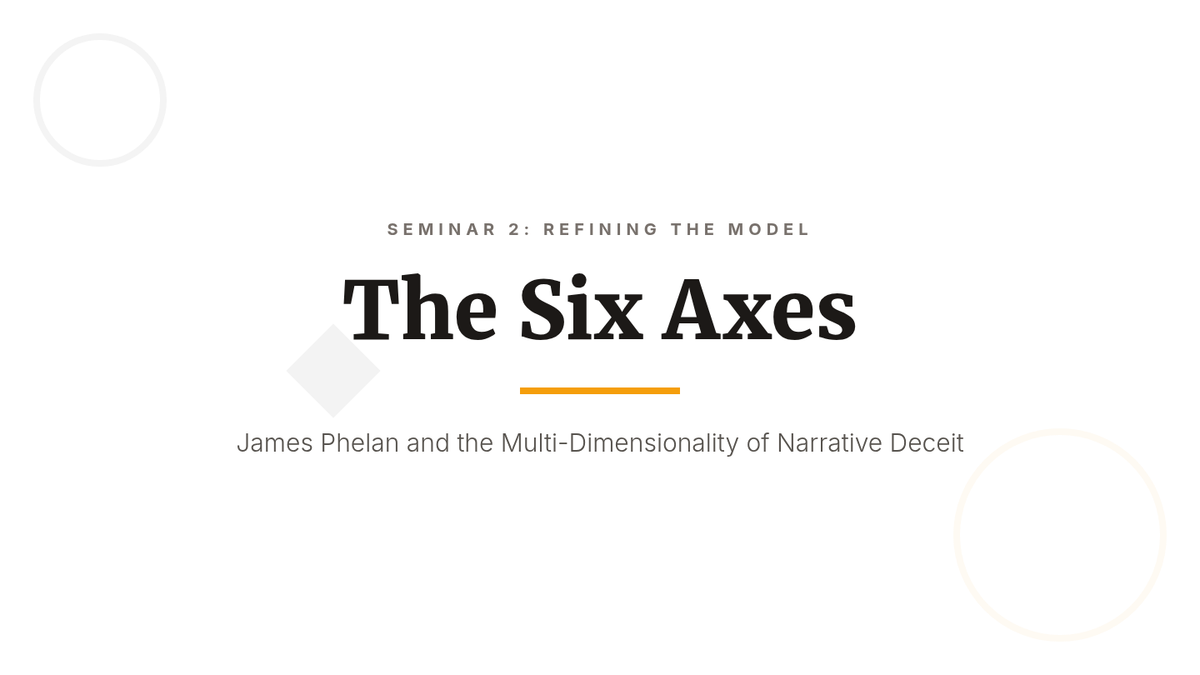A graduate-level exploration of narrative theory, focusing on the mechanisms of unreliable narration through the lenses of Wayne Booth and James Phelan. Students examine the rhetorical, psychological, and ethical dimensions of stories where the teller cannot be trusted.