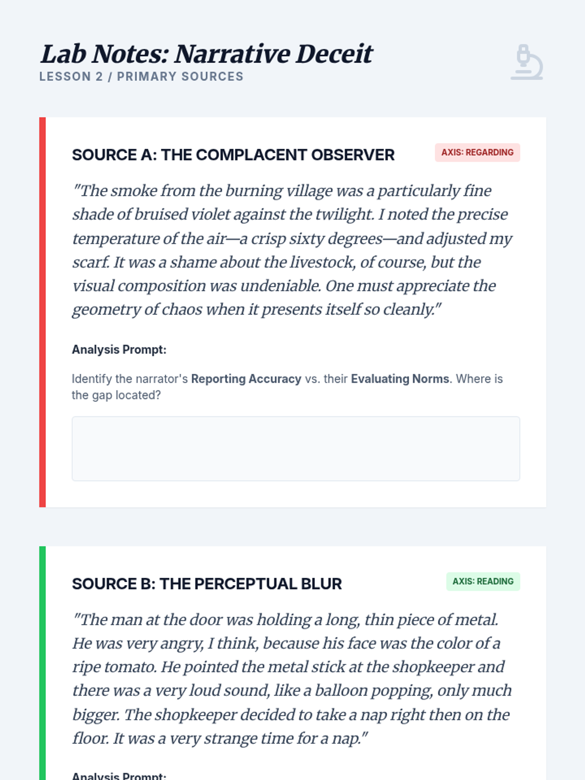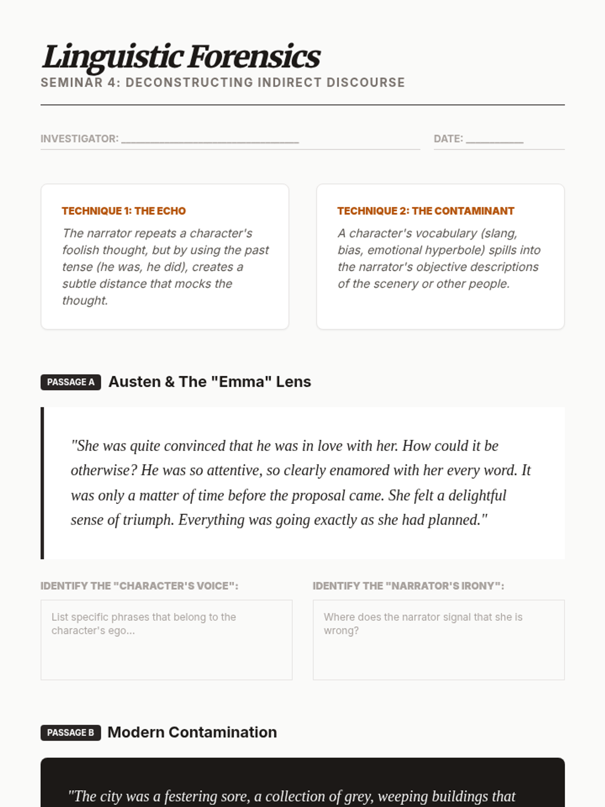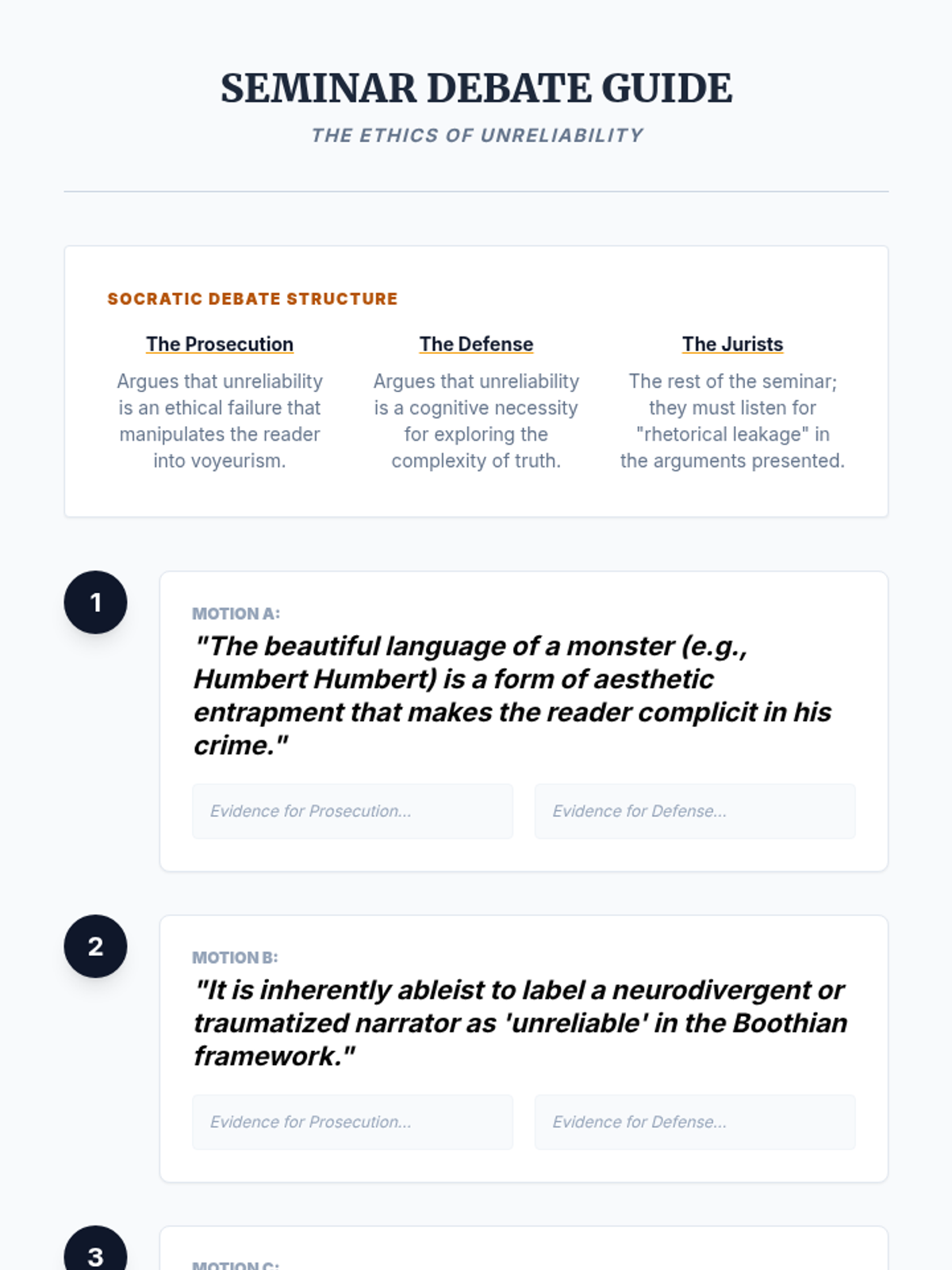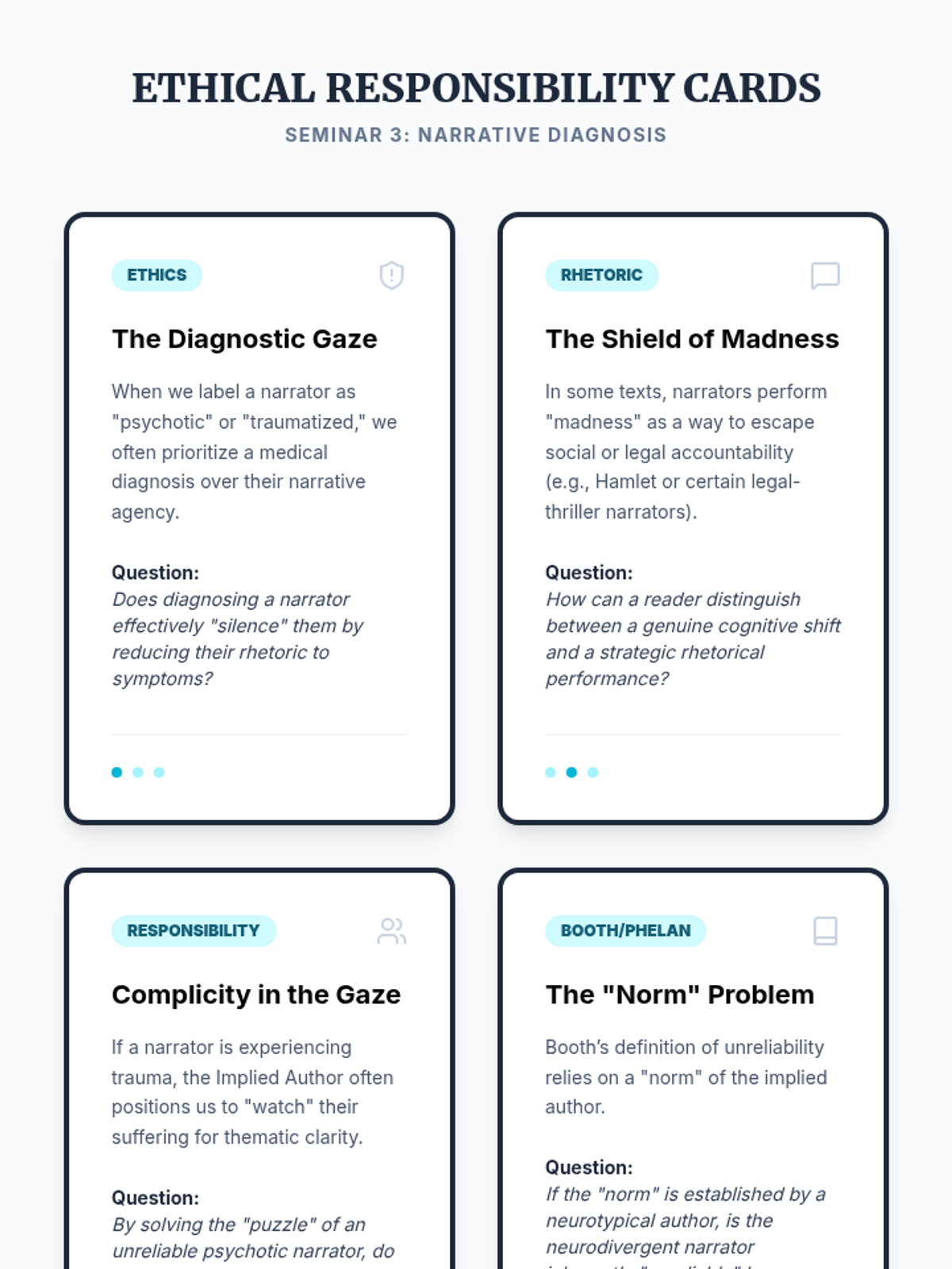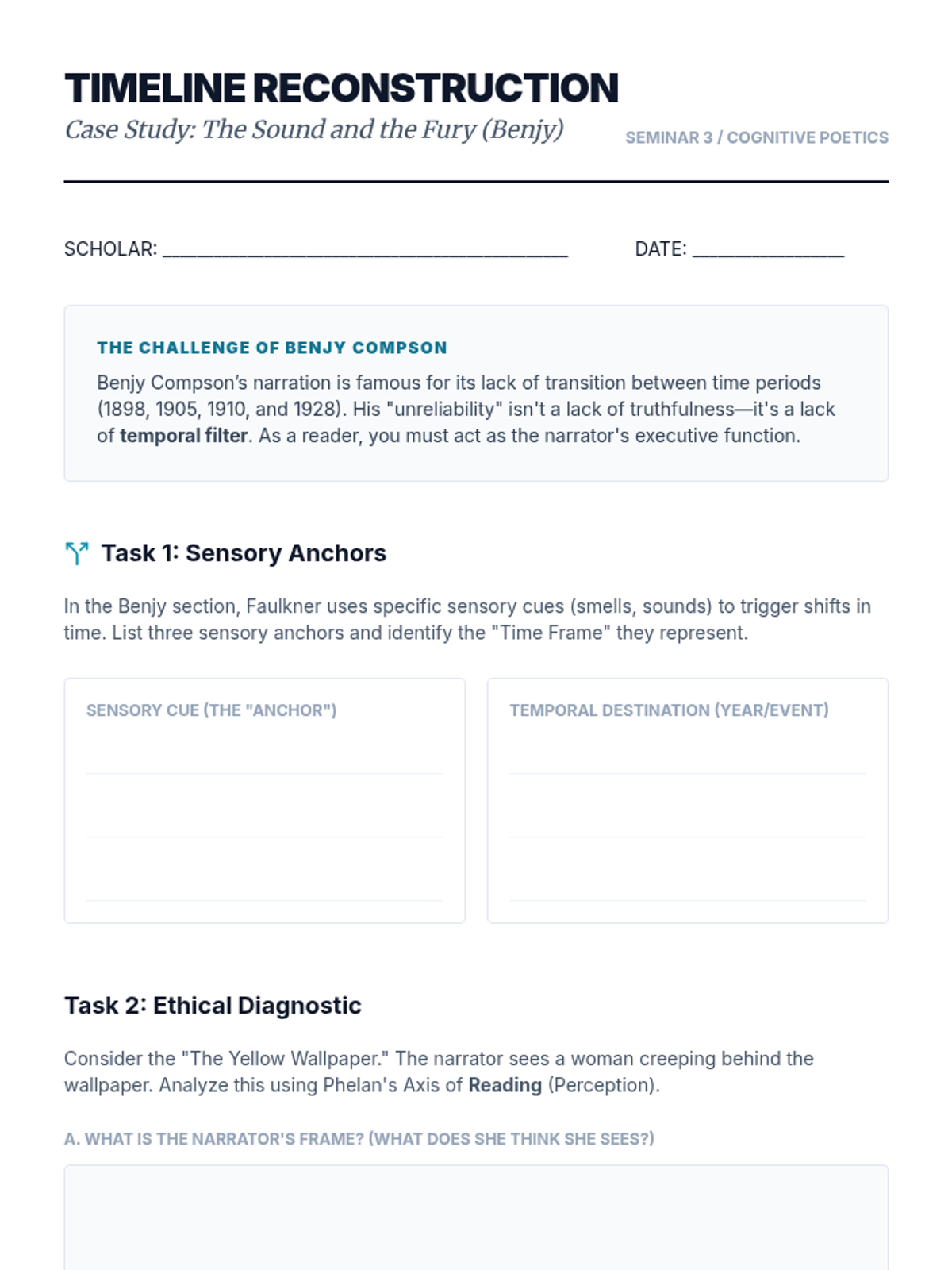A graduate-level exploration of narrative theory, focusing on the mechanisms of unreliable narration through the lenses of Wayne Booth and James Phelan. Students examine the rhetorical, psychological, and ethical dimensions of stories where the teller cannot be trusted.