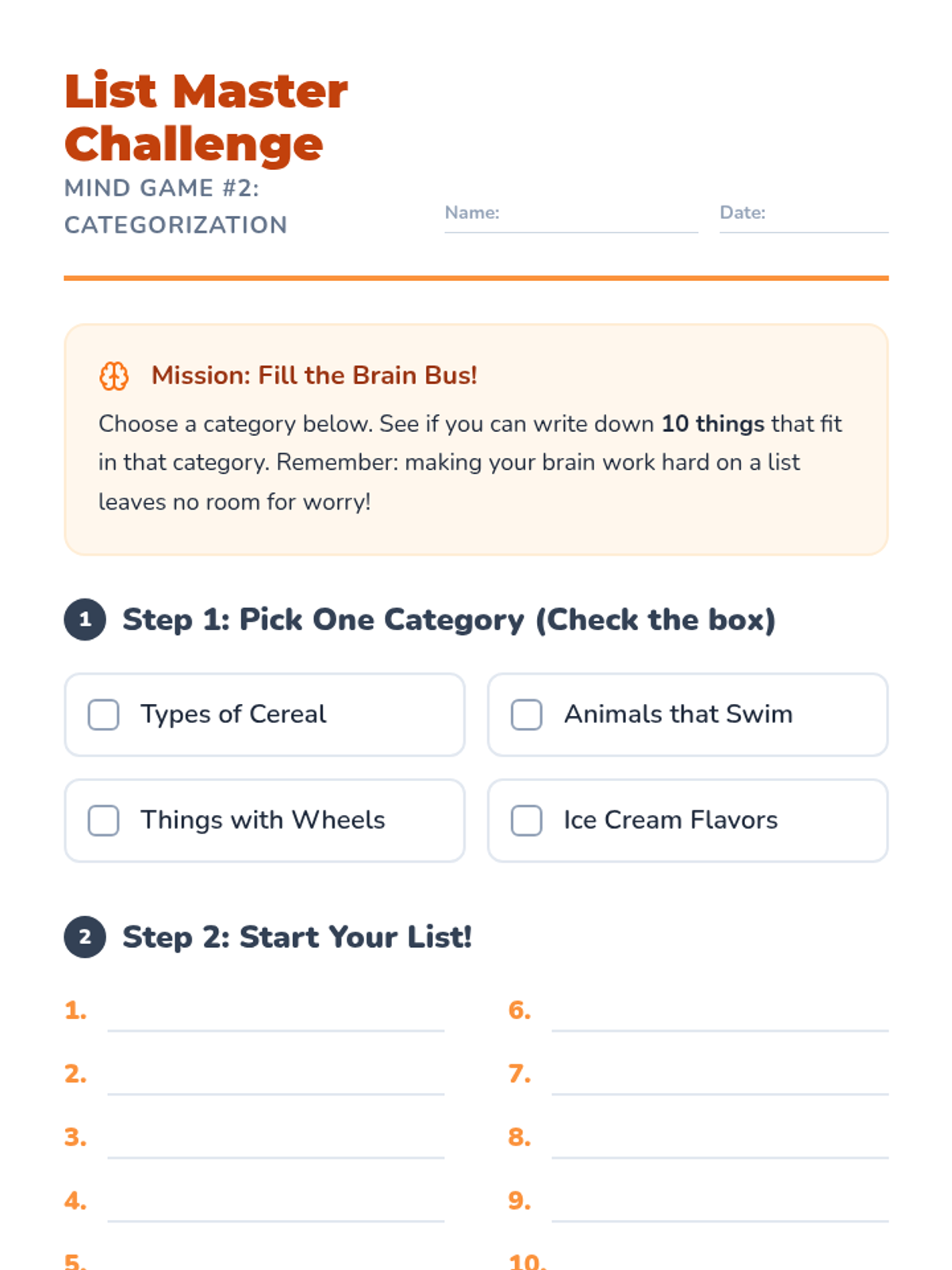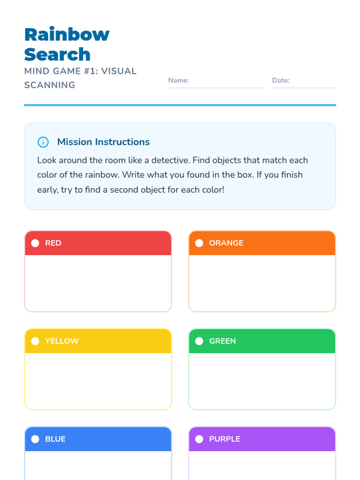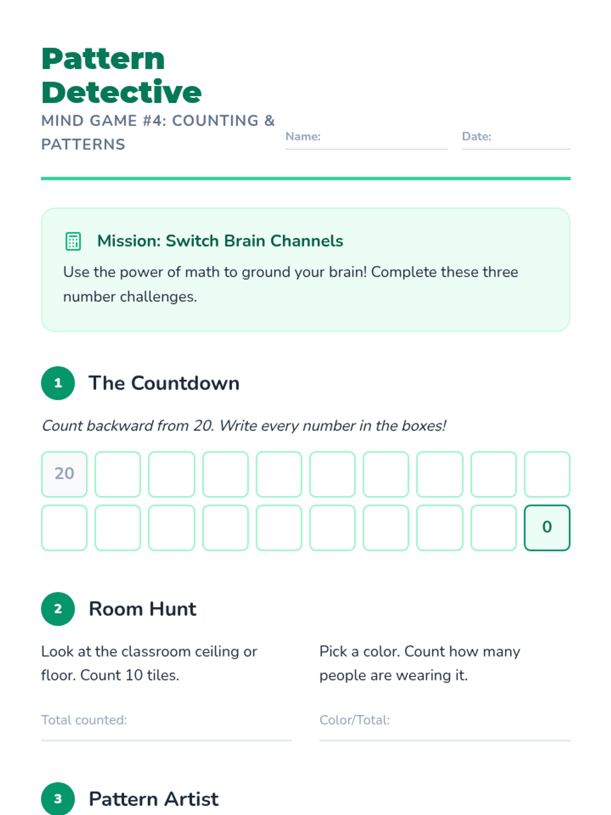 A comprehensive 2nd-grade sequence focusing on cognitive redirection strategies to manage anxiety. Students learn mental games like rainbow searching, categorization, and pattern recognition to help ground themselves in the present moment.
