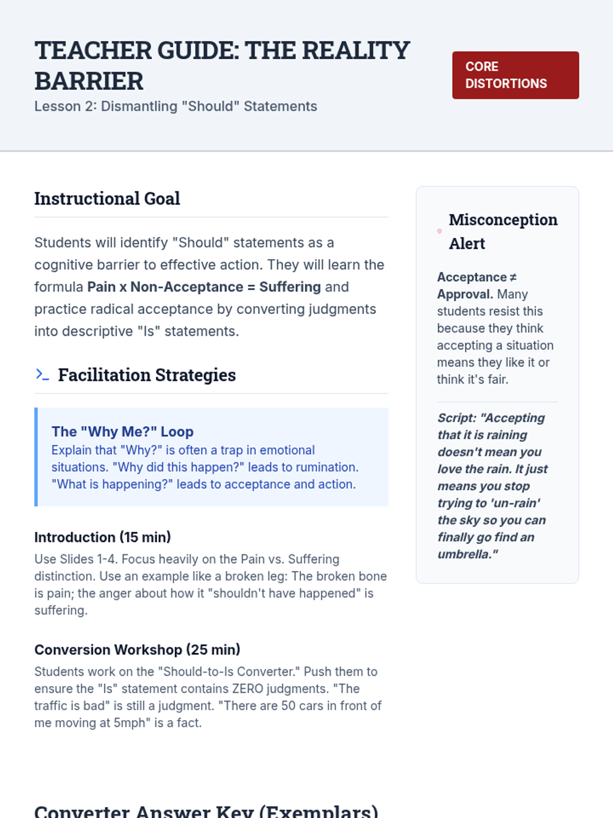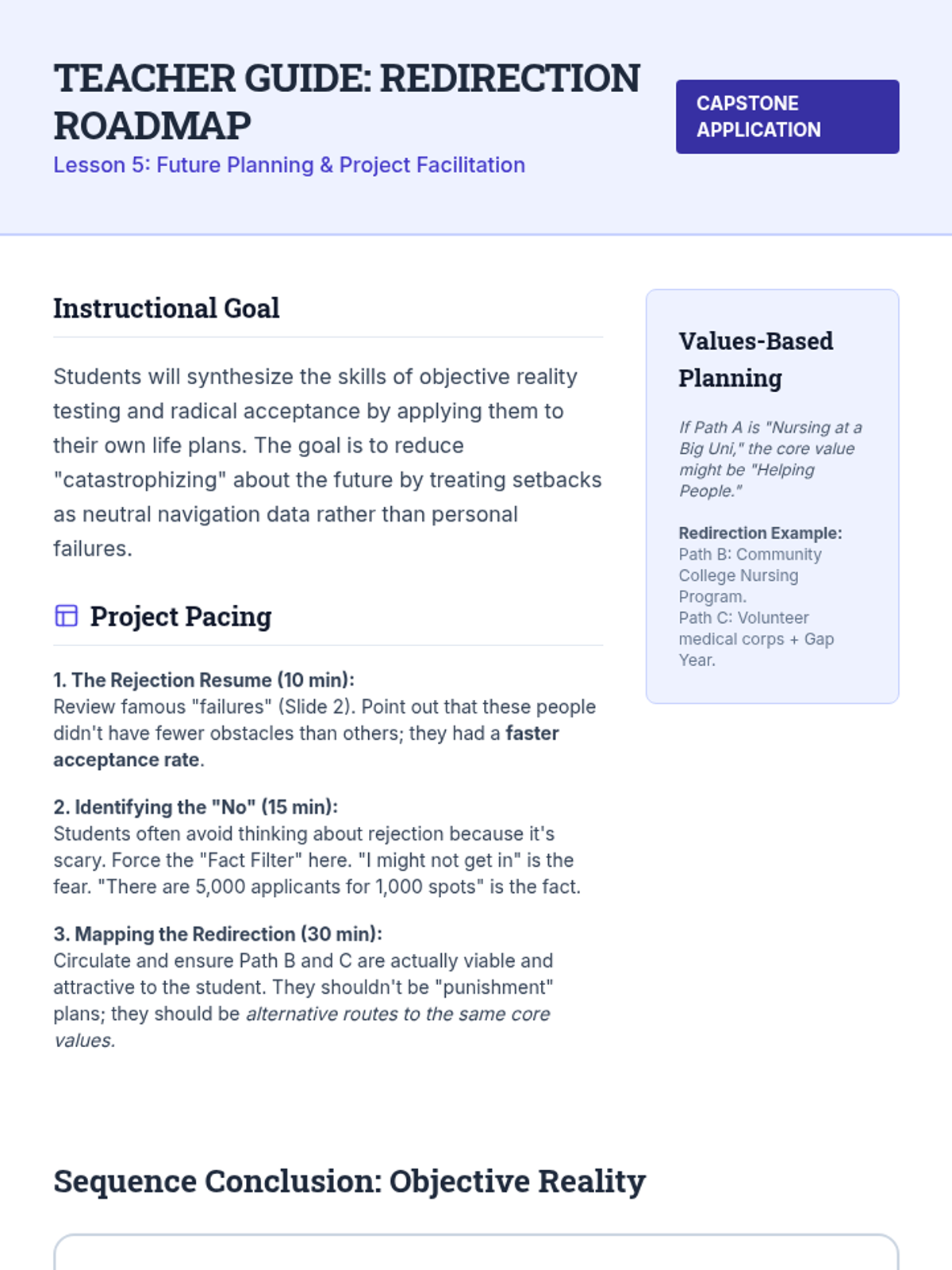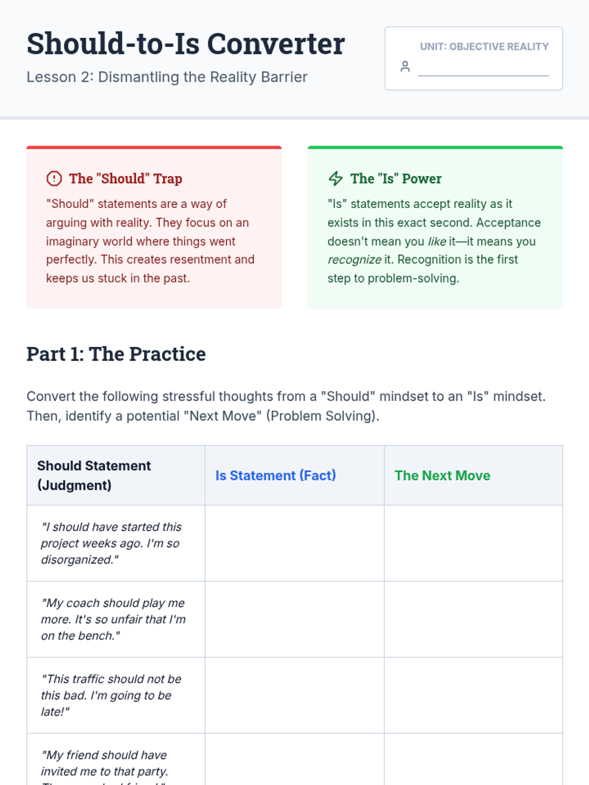 An 11th-grade sequence exploring radical acceptance through cognitive reframing. Students learn to distinguish facts from judgments, dismantle 'should' statements, and apply resilience strategies to interpersonal relationships and future planning.