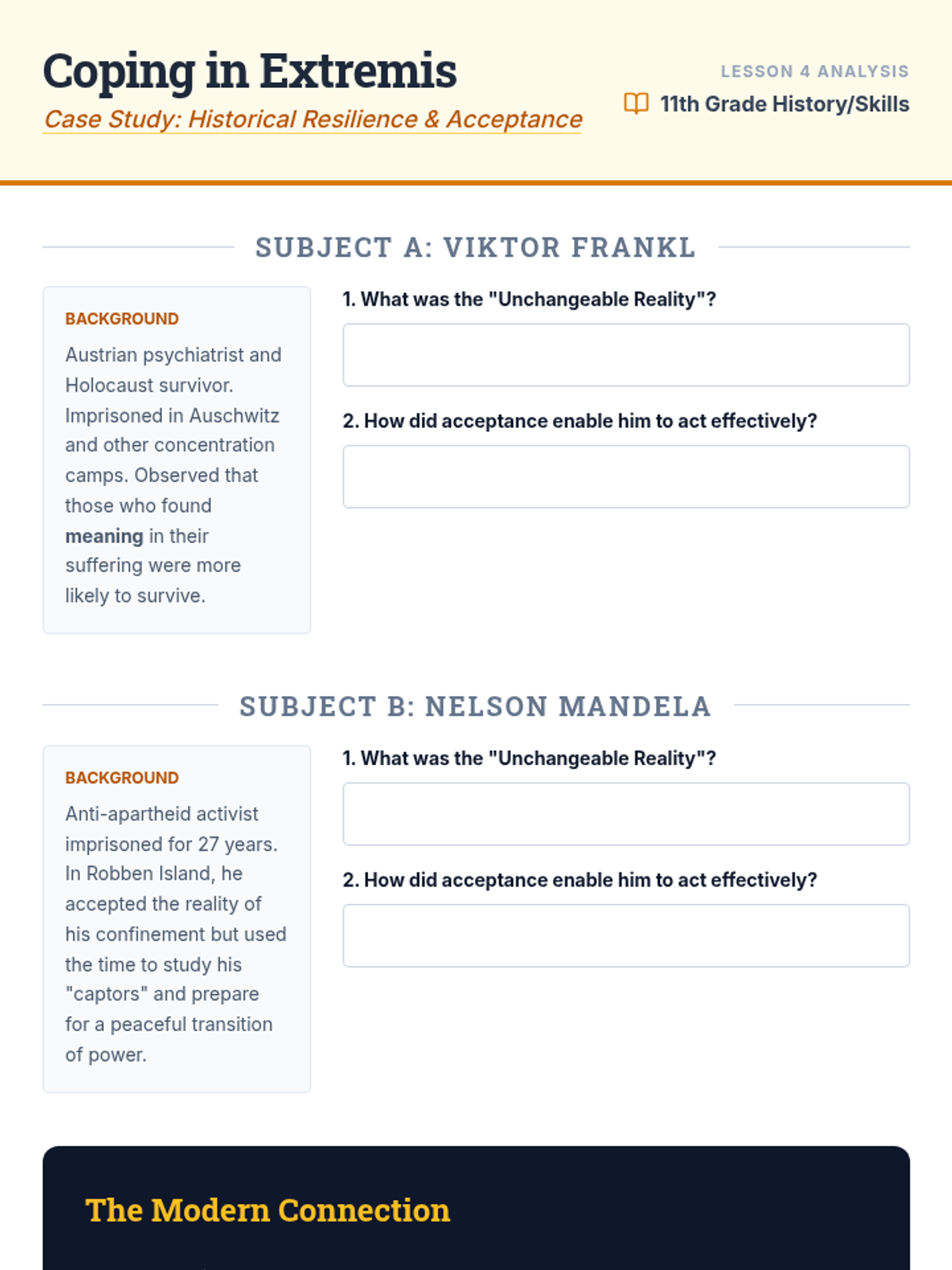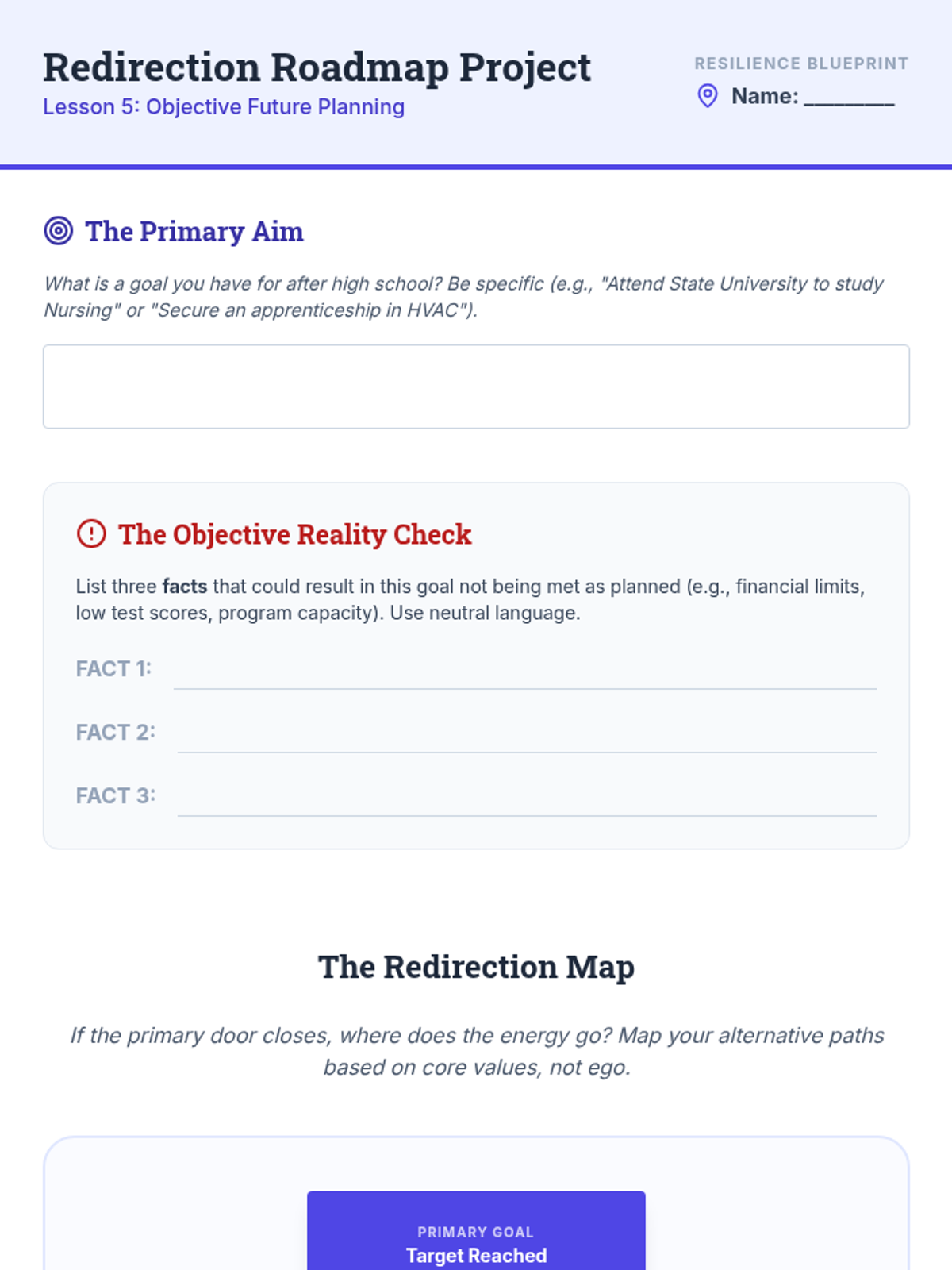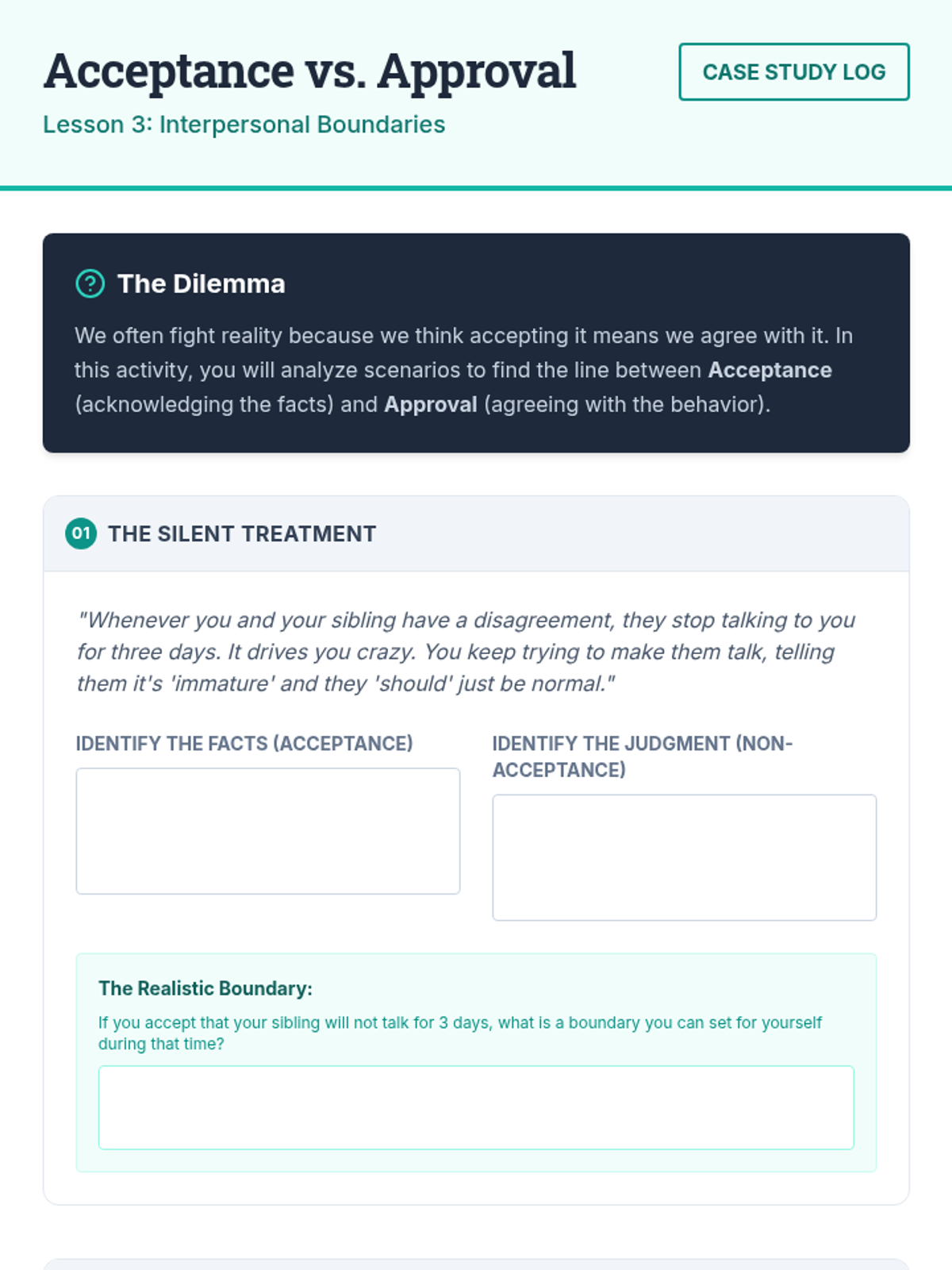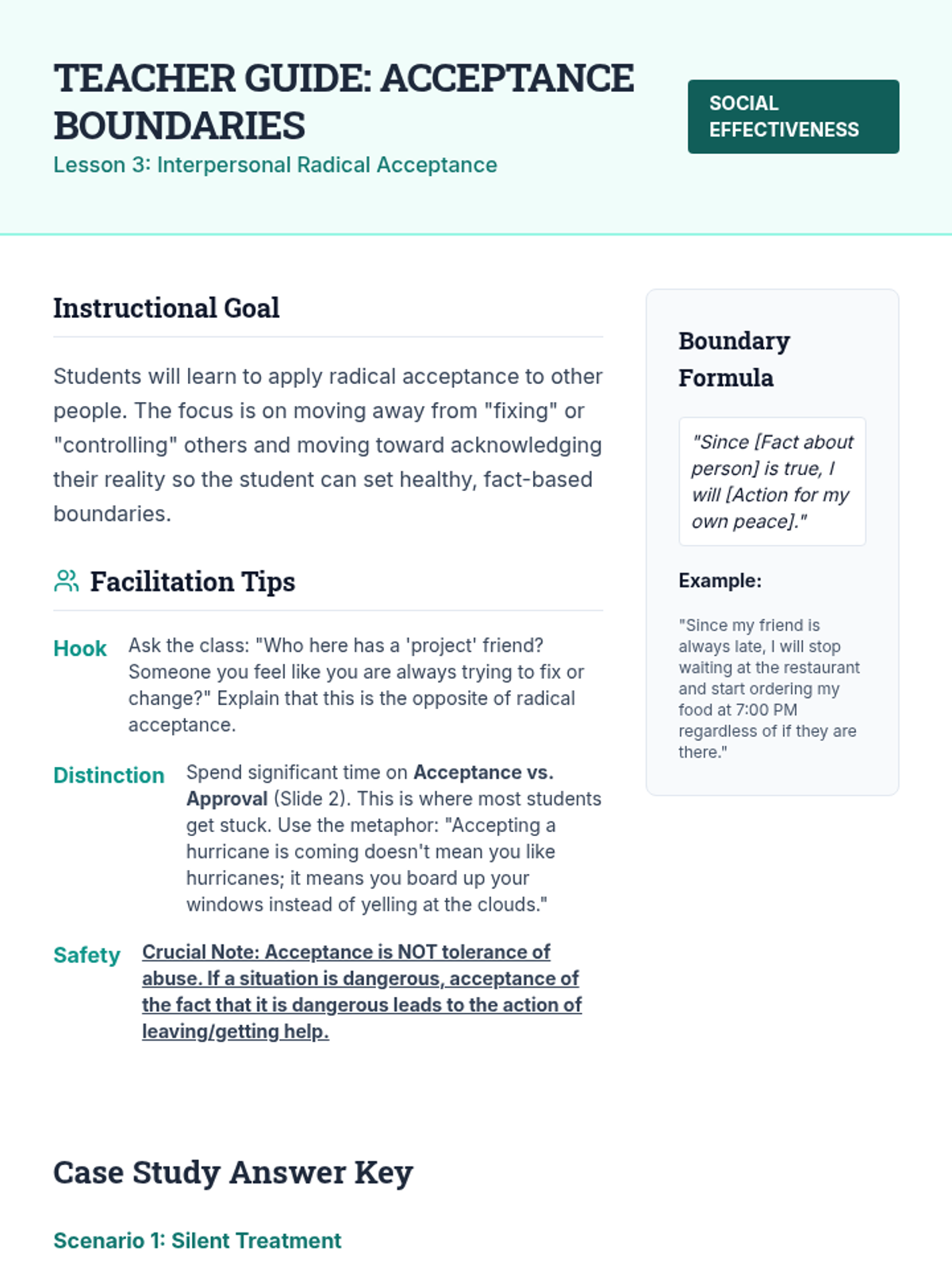 An 11th-grade sequence exploring radical acceptance through cognitive reframing. Students learn to distinguish facts from judgments, dismantle 'should' statements, and apply resilience strategies to interpersonal relationships and future planning.