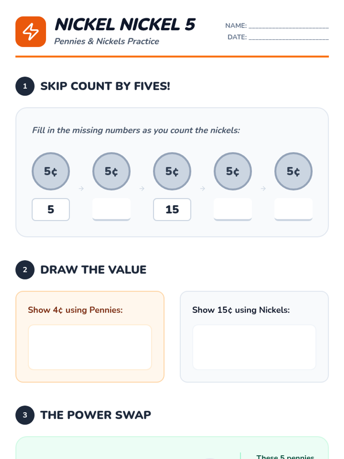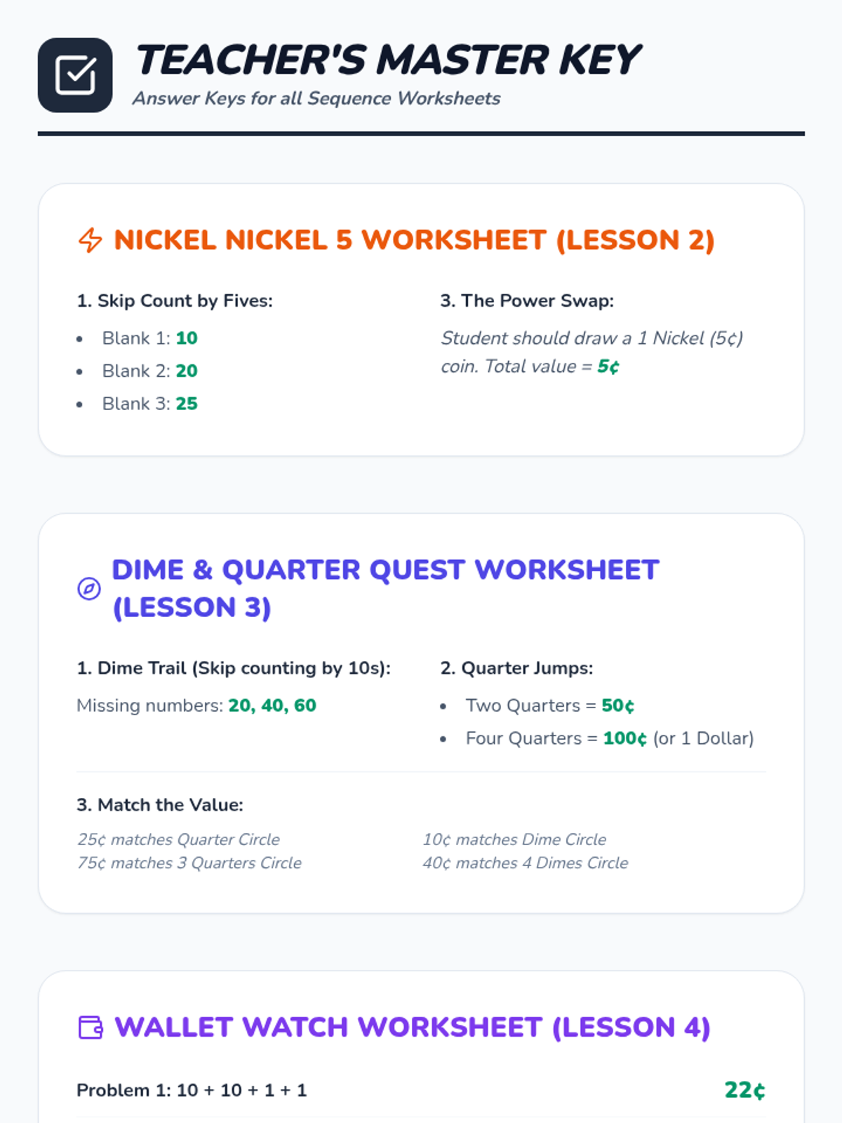 A 1st Grade math sequence focused on identifying coins, understanding their values, and applying skip-counting skills to sum mixed collections in a classroom market simulation.