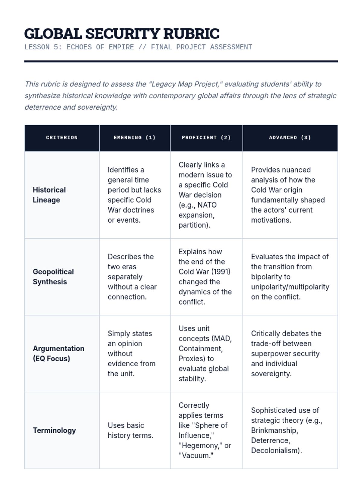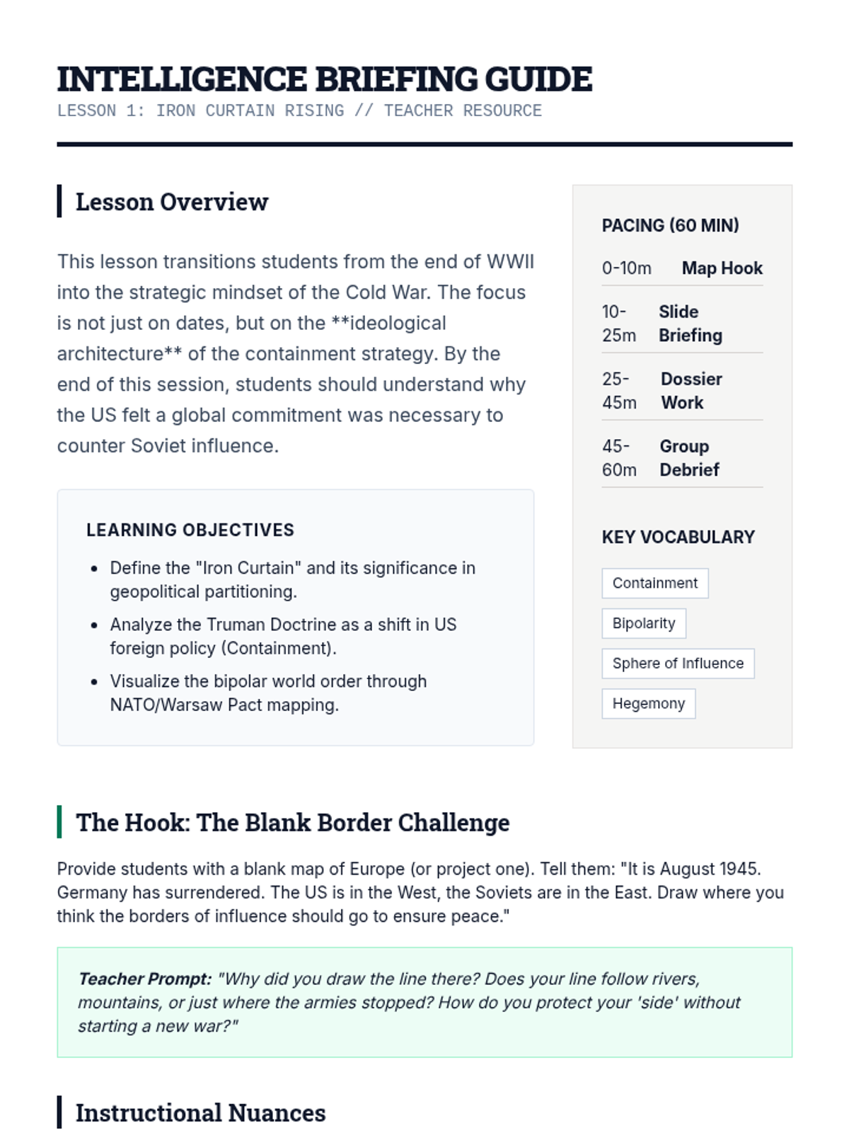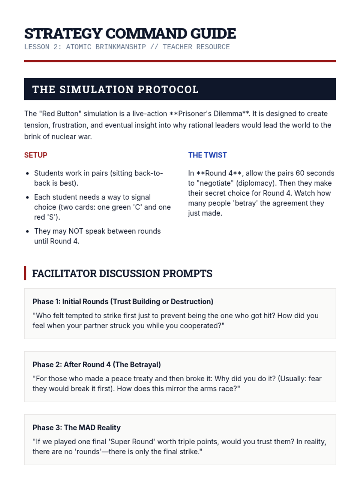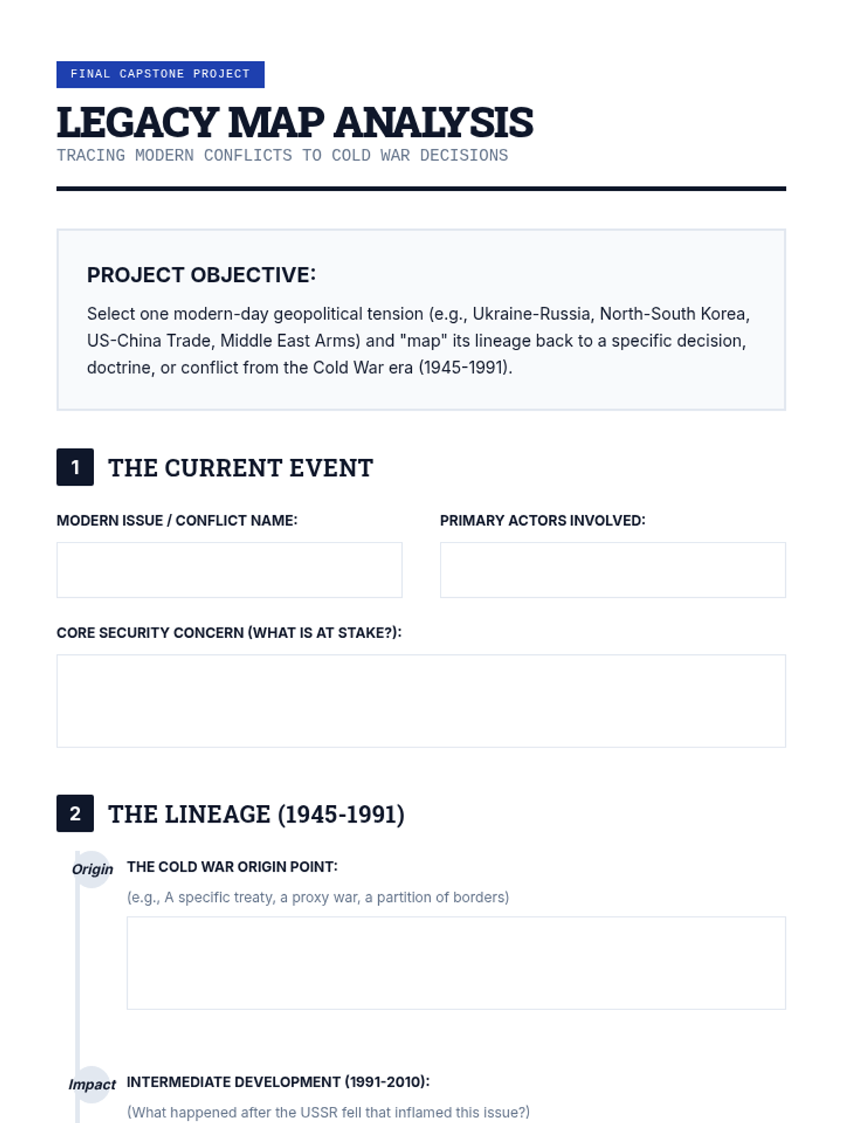 A high-school sequence exploring the strategic, ideological, and geopolitical dimensions of the Cold War. Students analyze primary sources, engage in game-theory simulations, and evaluate the legacy of the bipolar world order on modern global security.