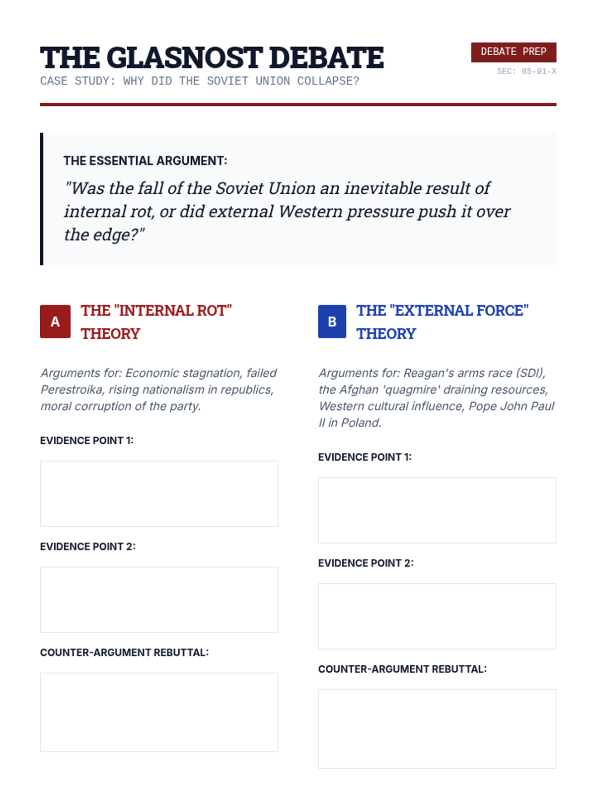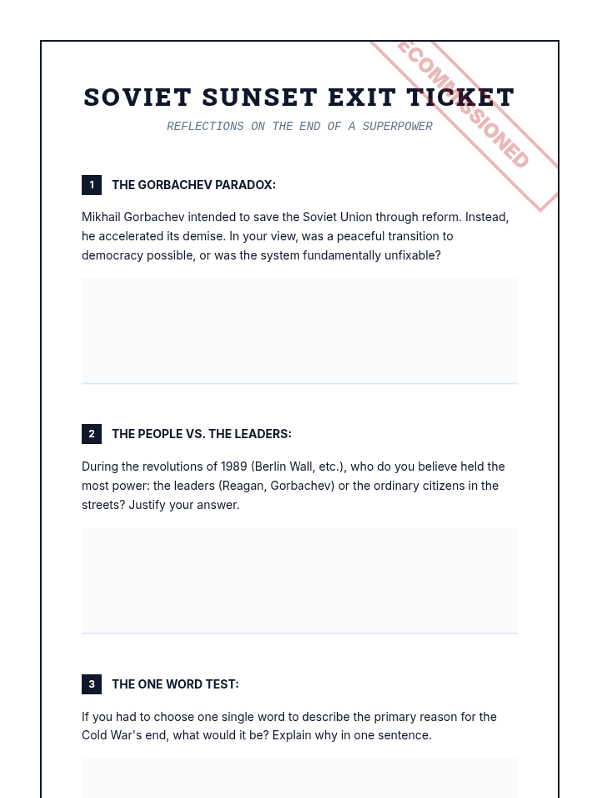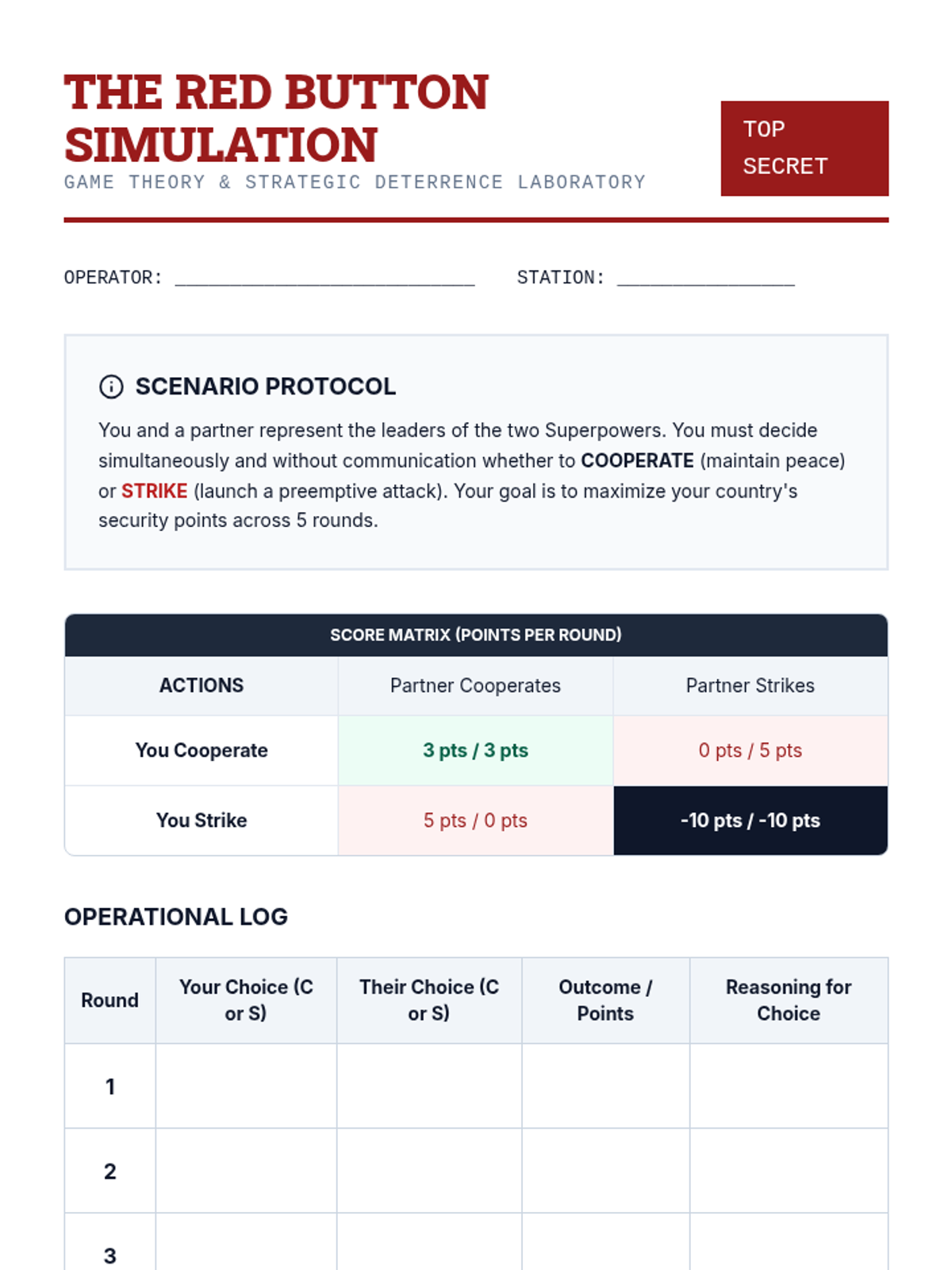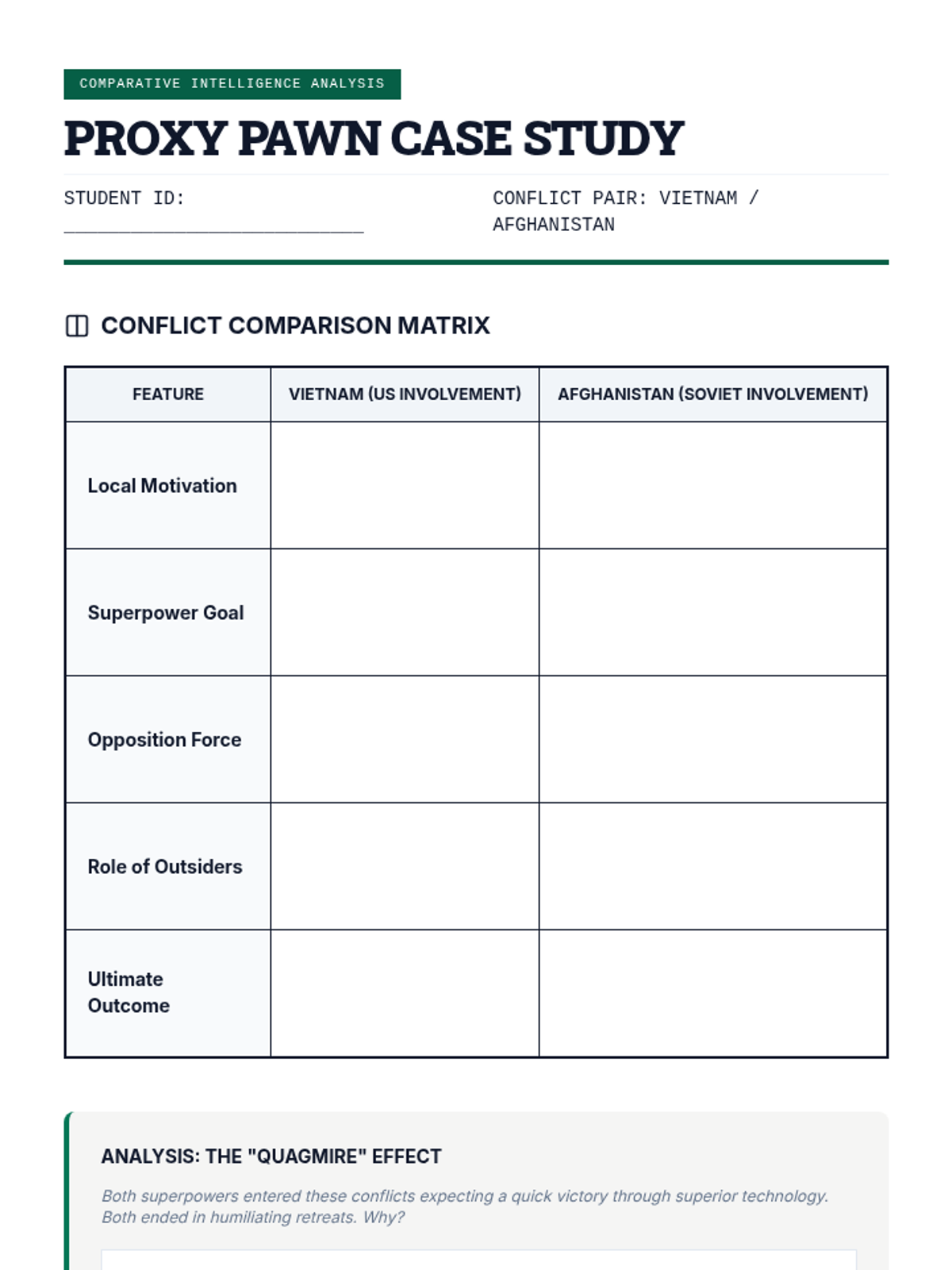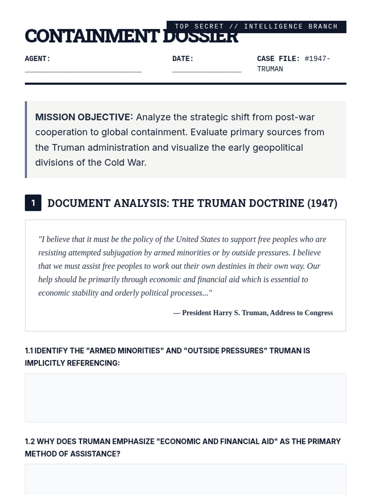 A high-school sequence exploring the strategic, ideological, and geopolitical dimensions of the Cold War. Students analyze primary sources, engage in game-theory simulations, and evaluate the legacy of the bipolar world order on modern global security.