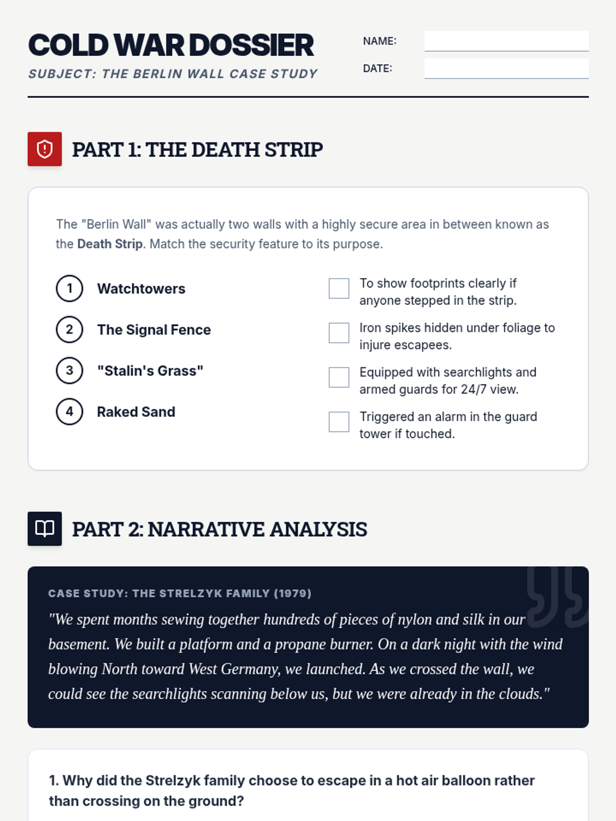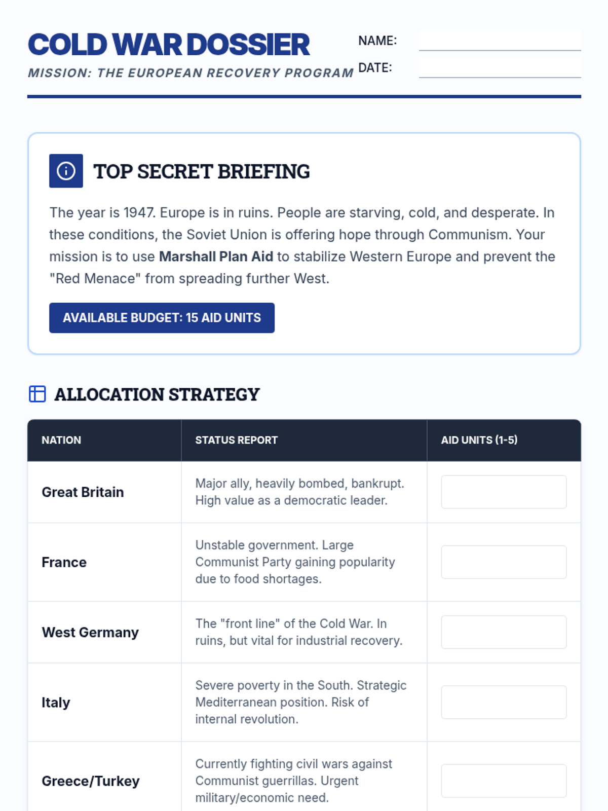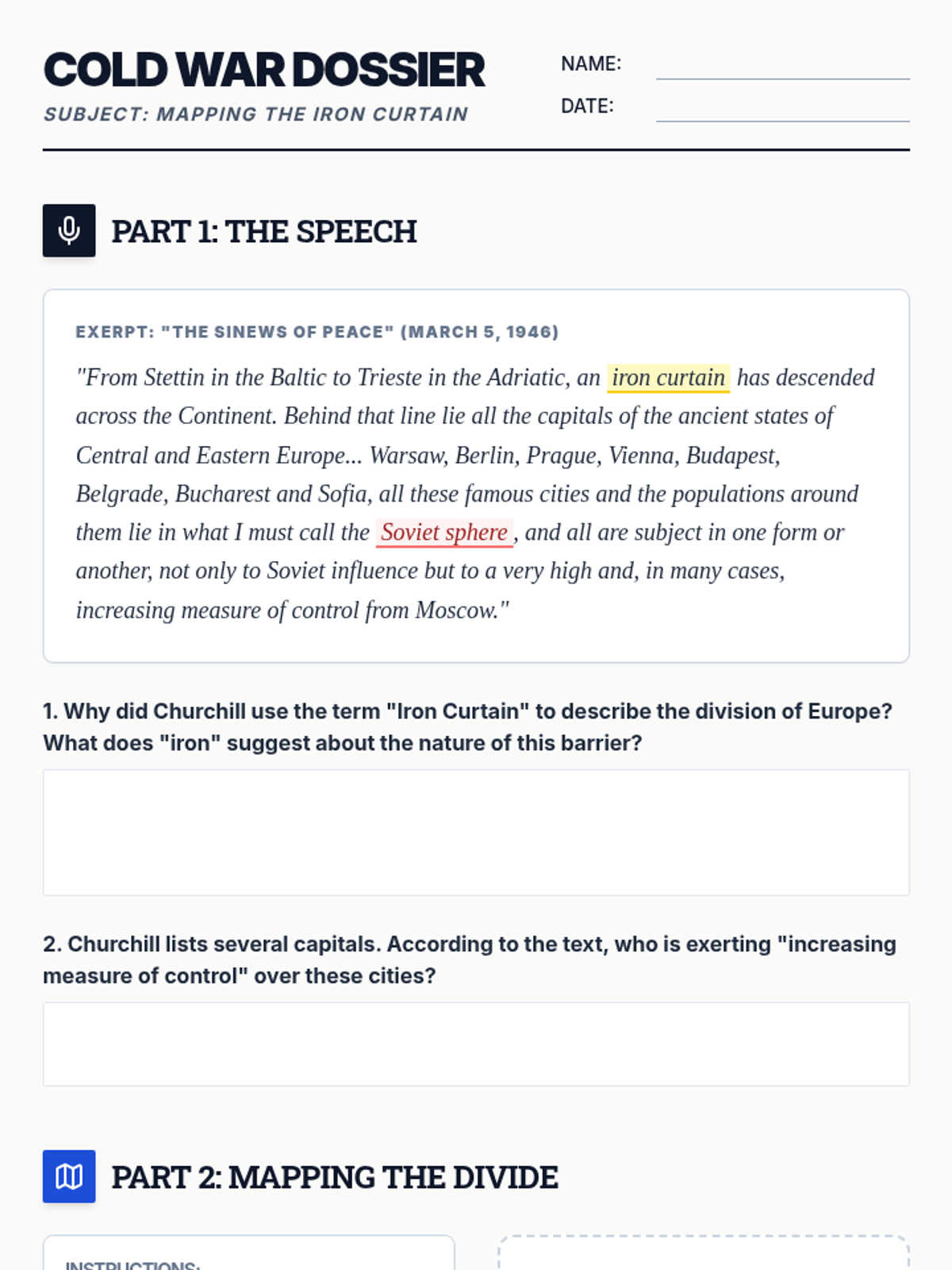 A comprehensive unit for 7th grade students exploring the ideological roots of the Cold War, the division of Europe, and the early conflicts between the US and USSR through simulations, map analysis, and case studies.