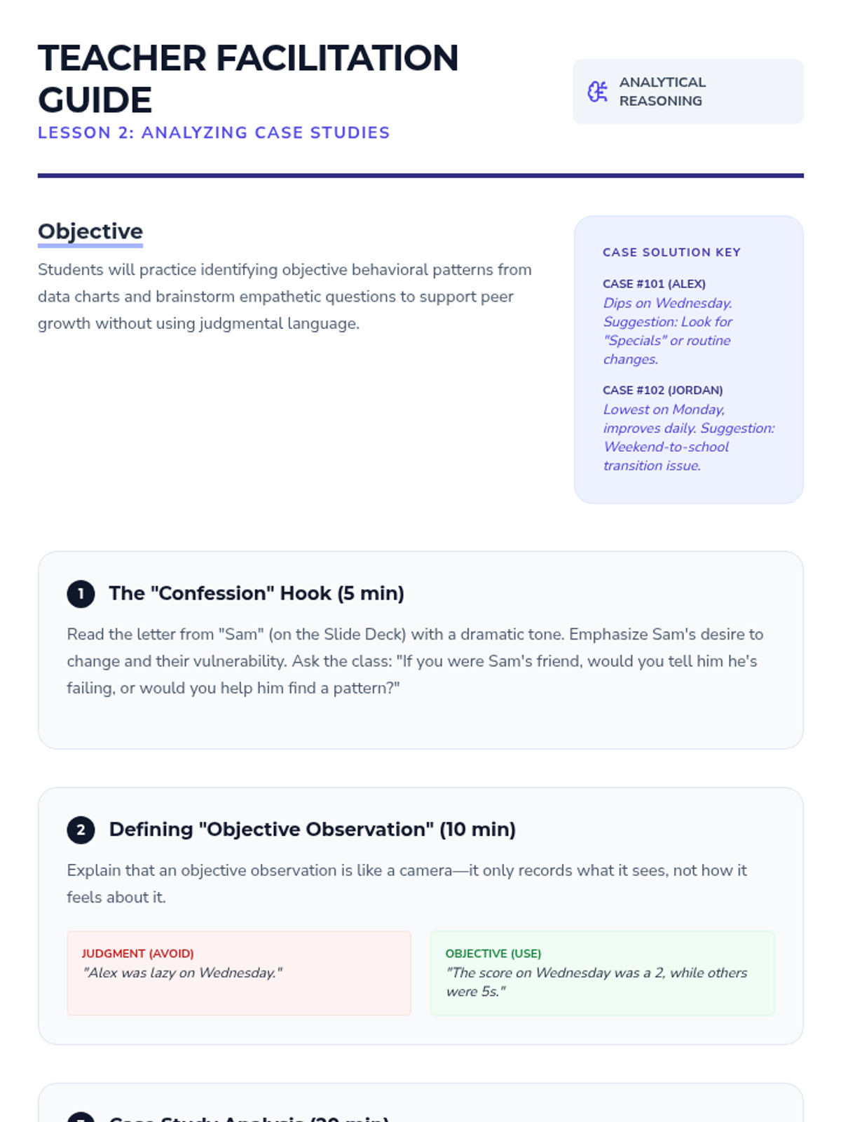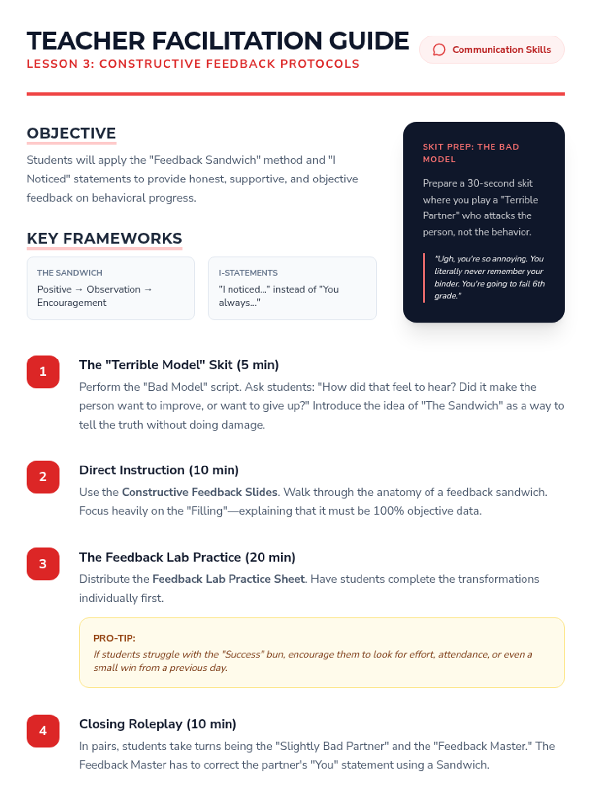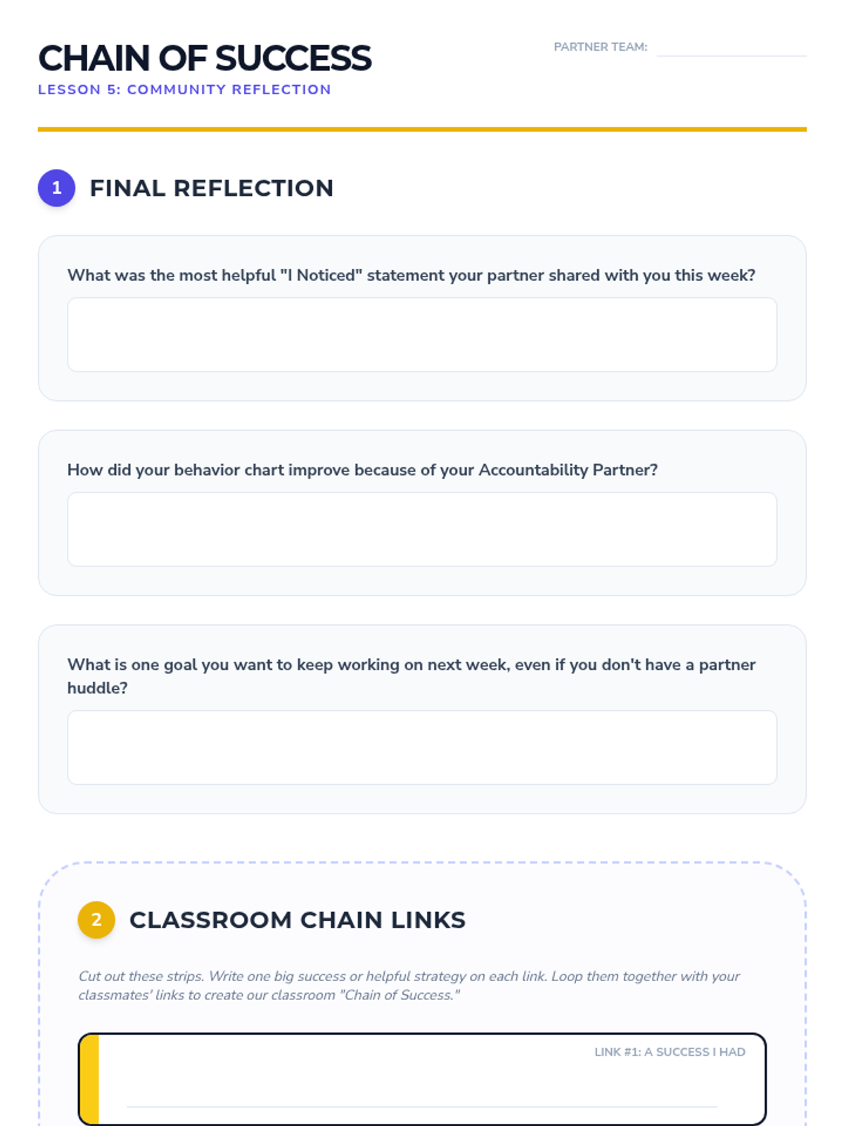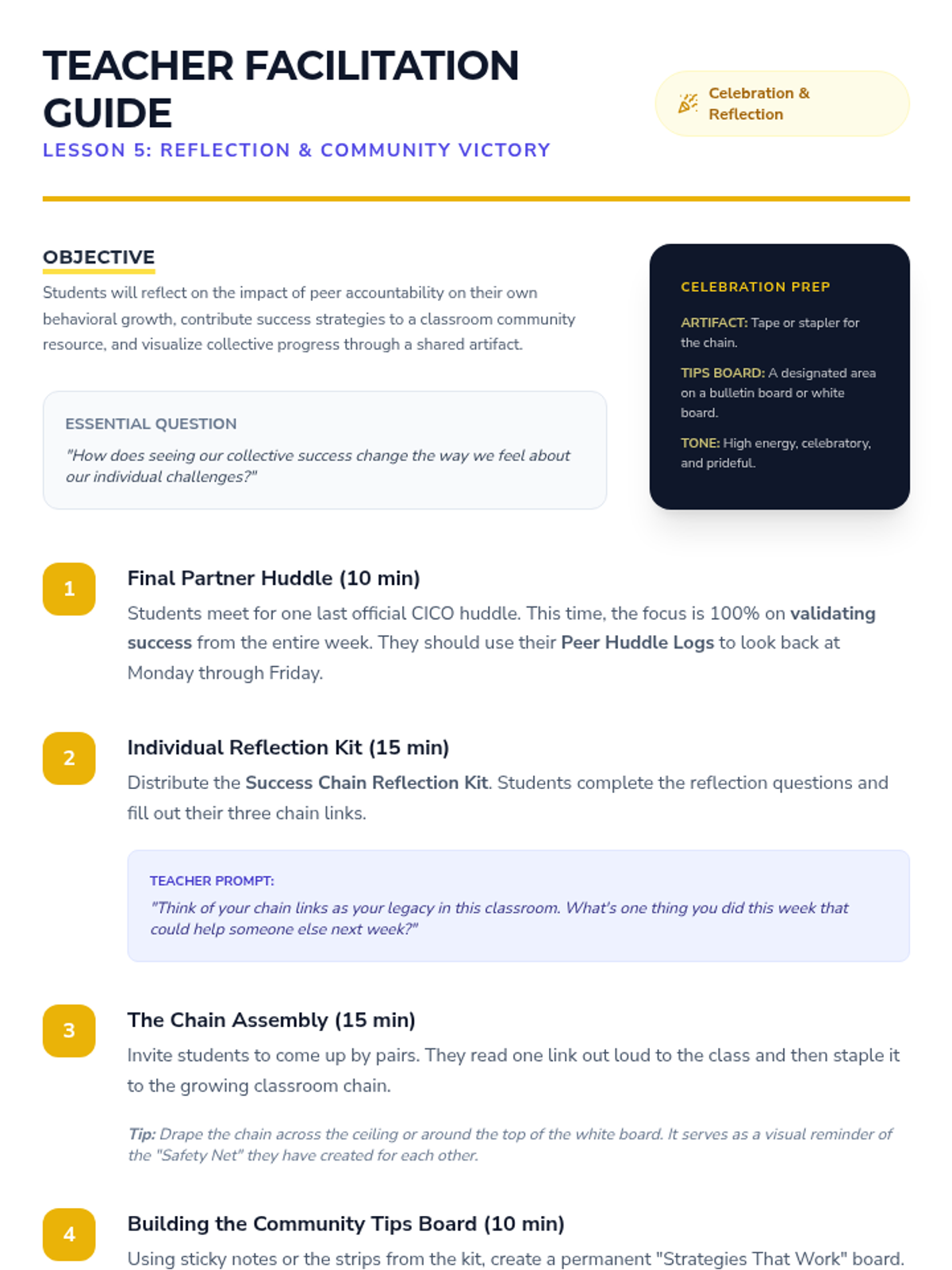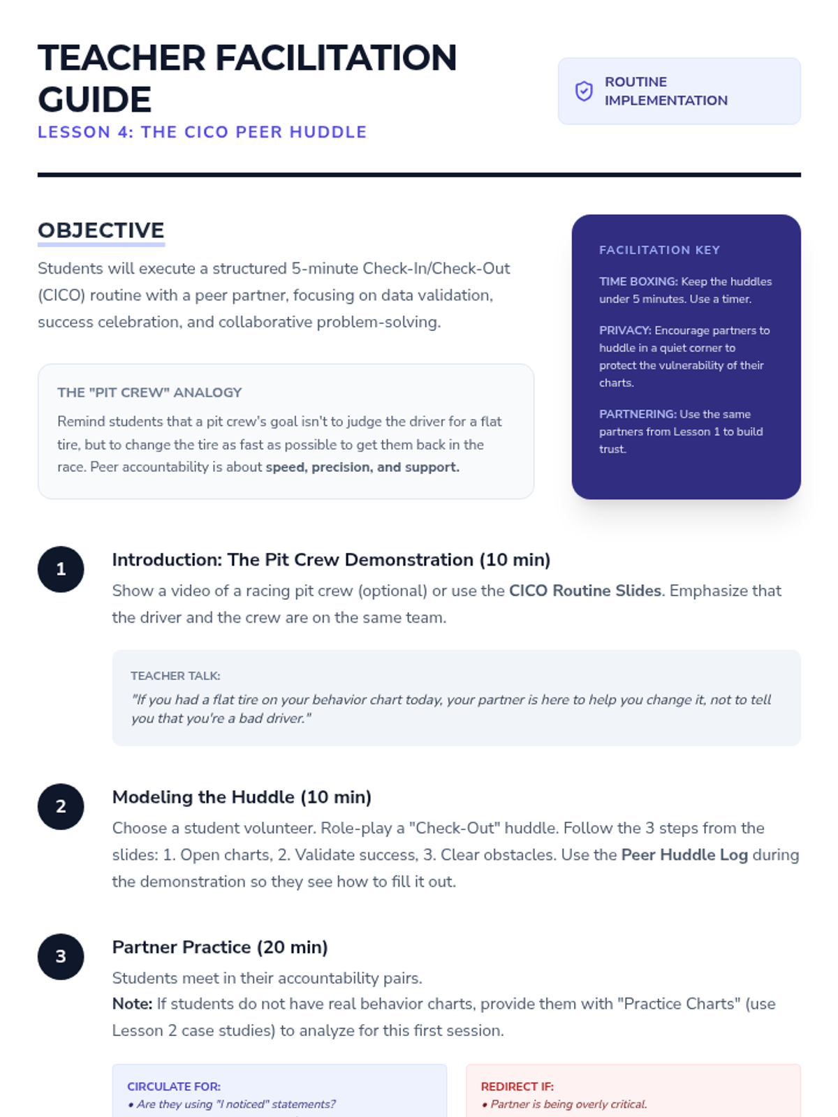 A 5-lesson sequence for 6th-grade students focusing on collaborative accountability in behavioral tracking. Students learn to give and receive feedback, use Check-In/Check-Out (CICO) protocols, and build a supportive community for individual growth.