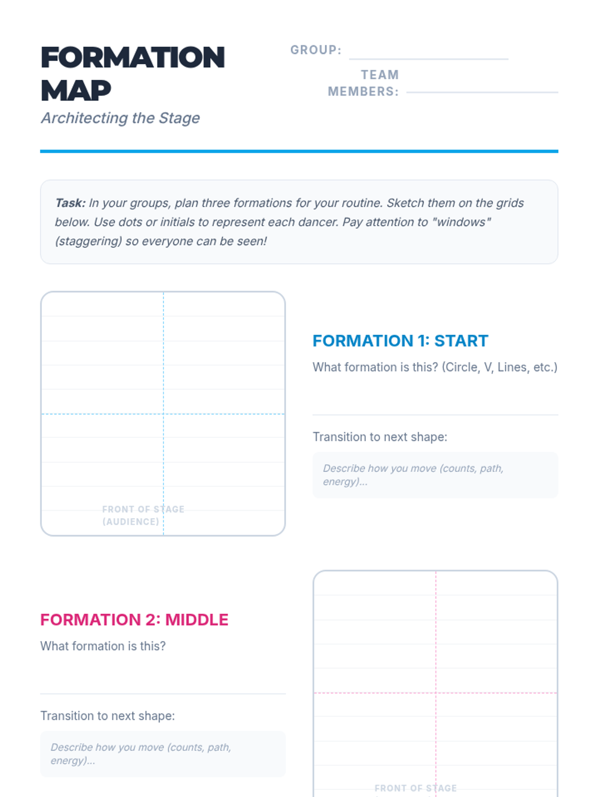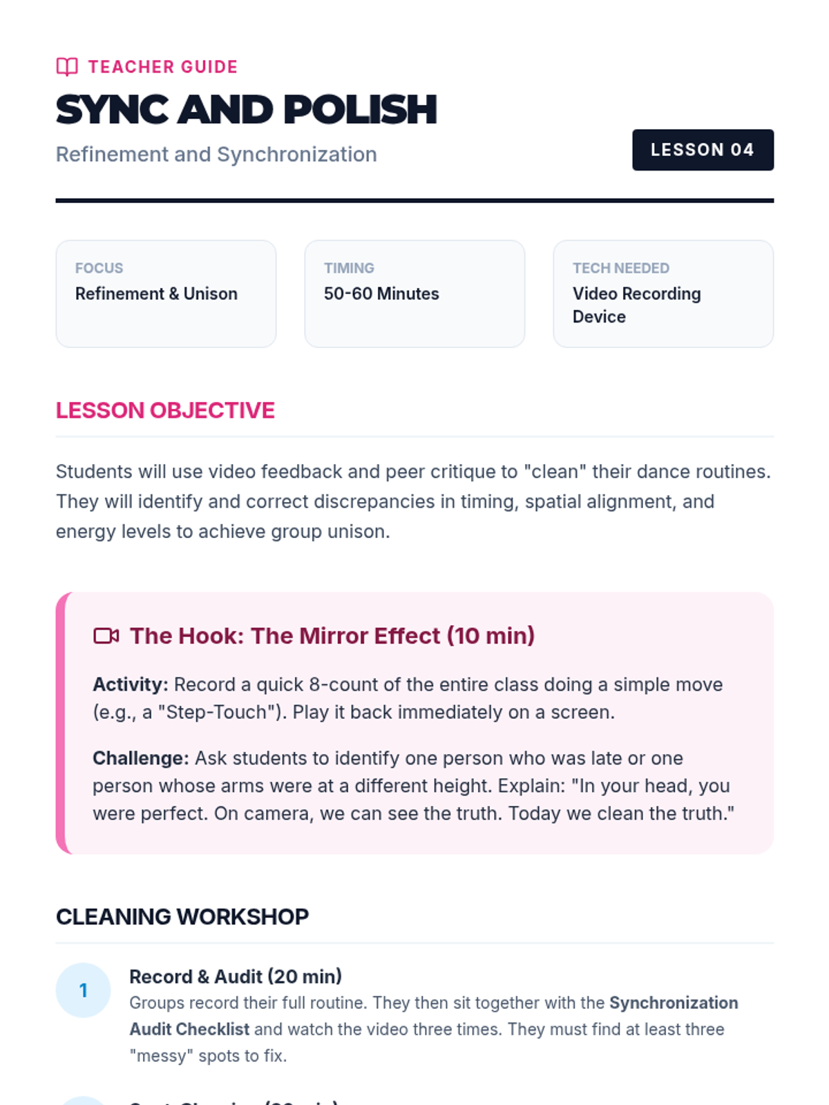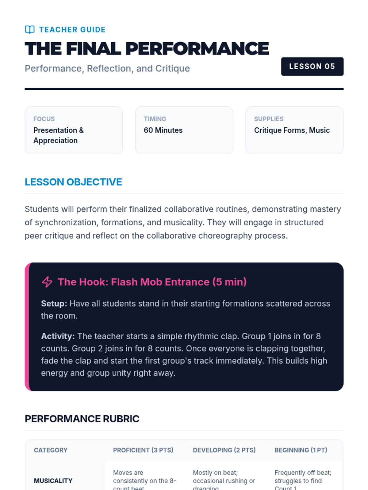 A comprehensive unit for 7th-grade students focusing on the transition from individual movement to collaborative choreography. Students learn musicality, spatial formations, and synchronized movement through a series of hands-on, project-based lessons.