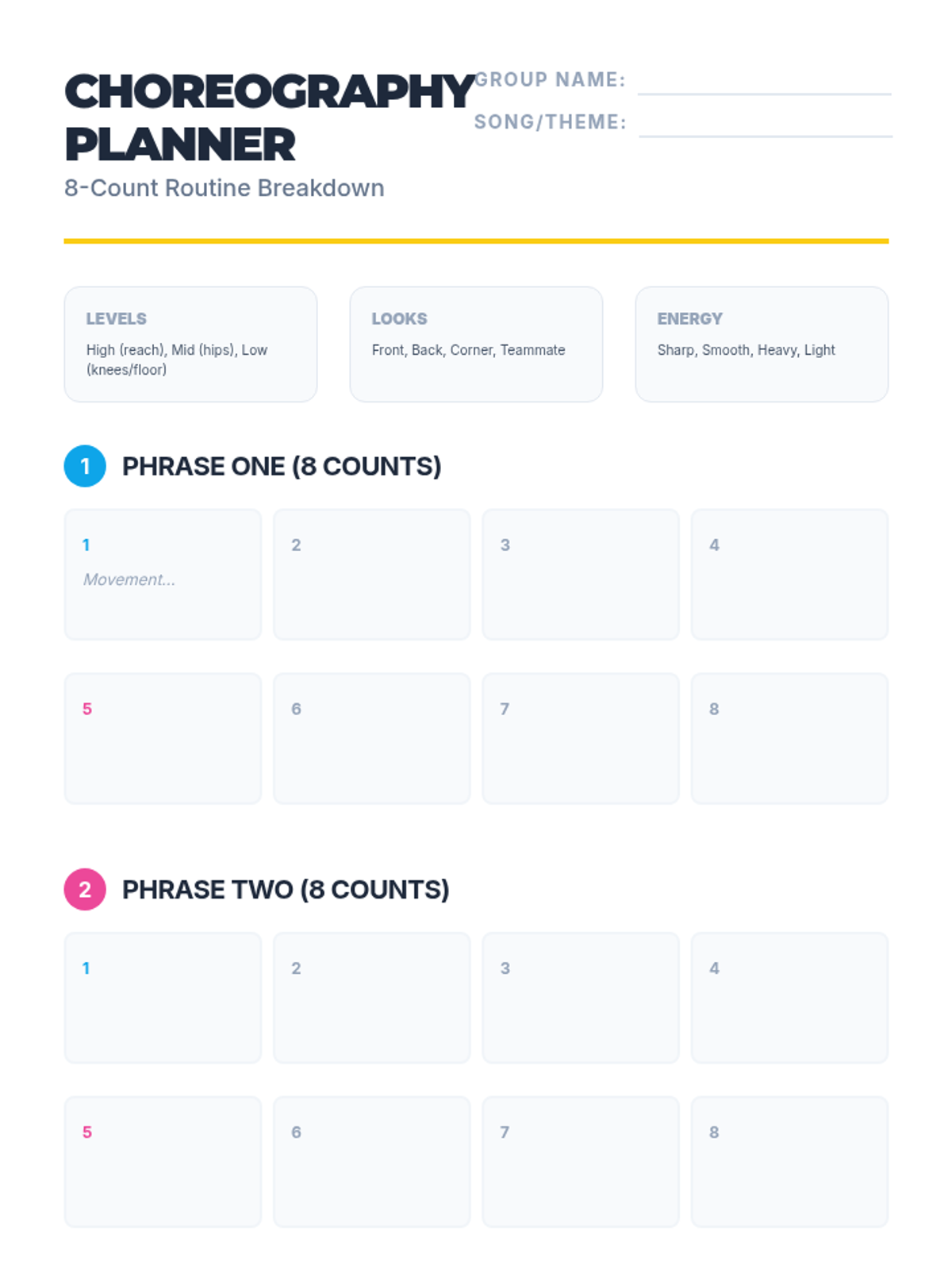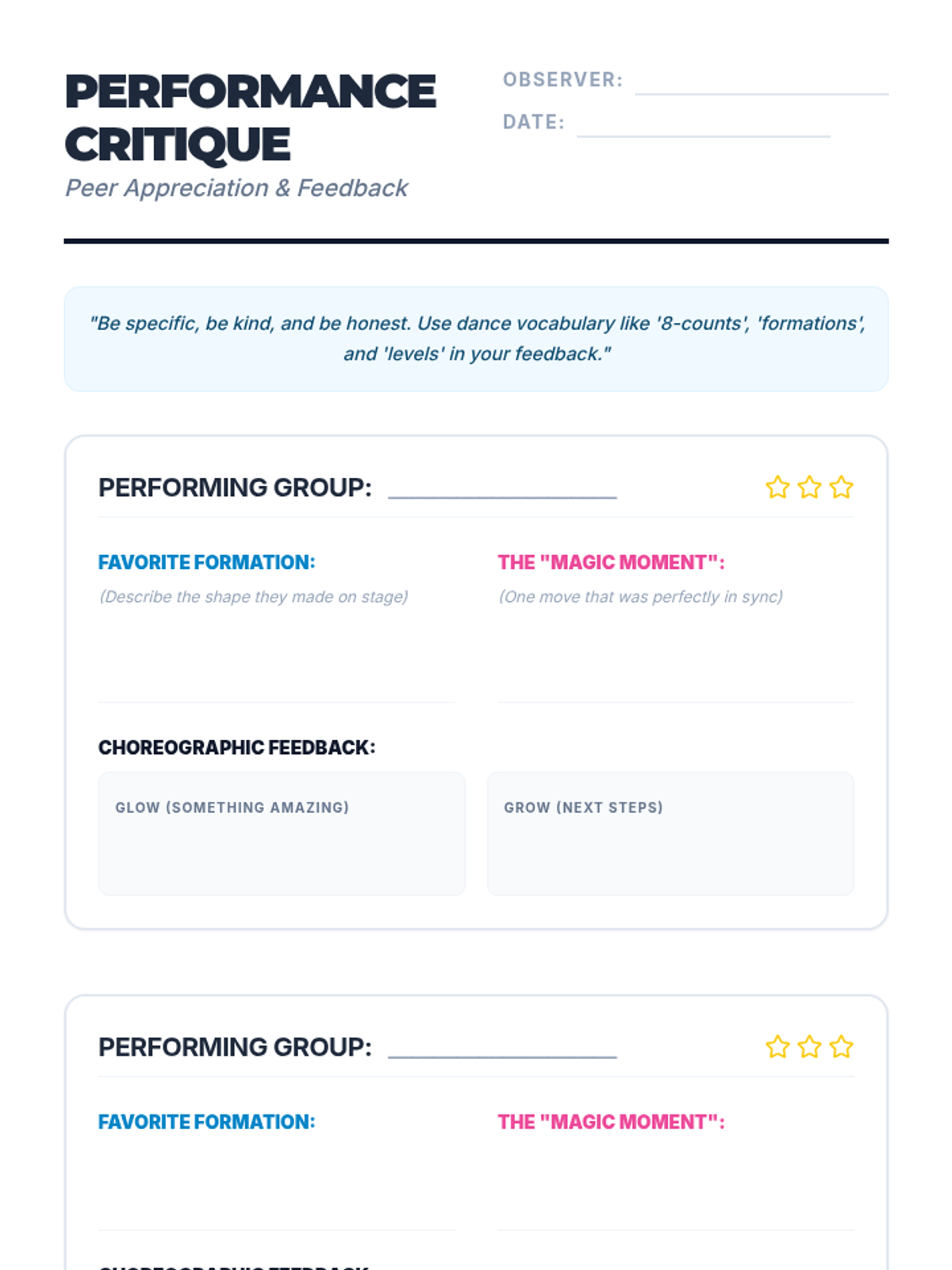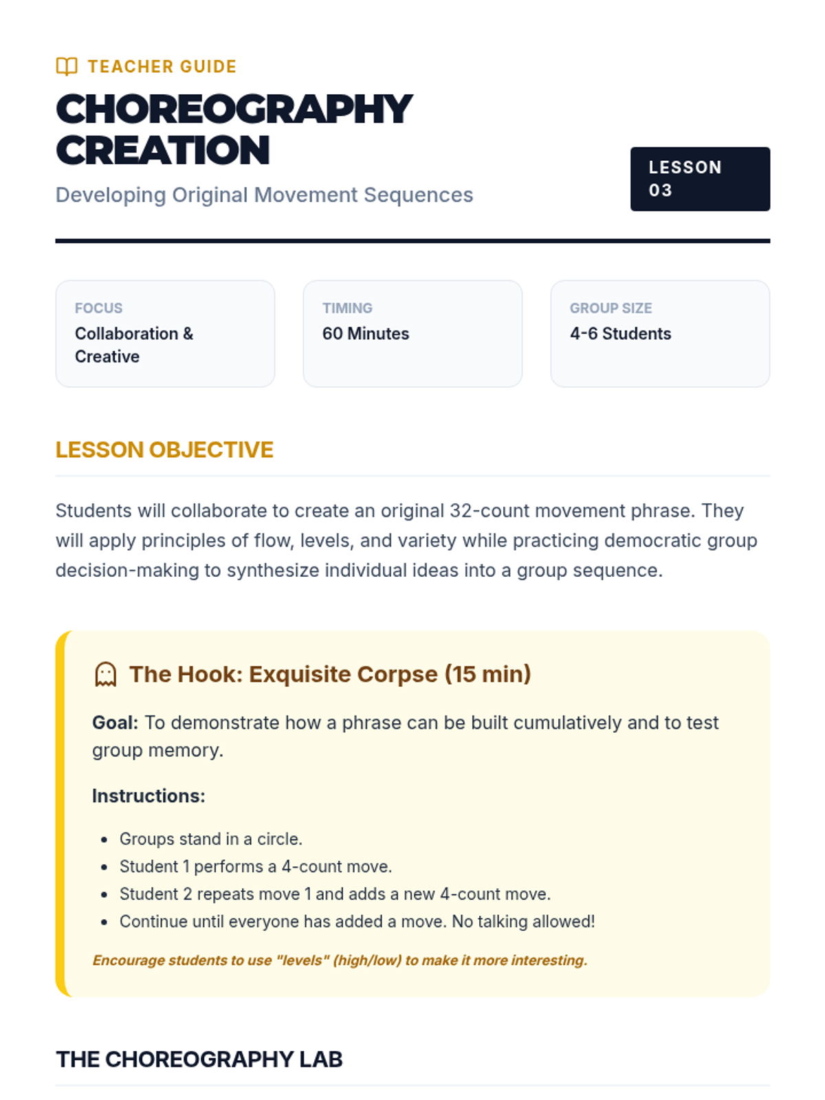 A comprehensive unit for 7th-grade students focusing on the transition from individual movement to collaborative choreography. Students learn musicality, spatial formations, and synchronized movement through a series of hands-on, project-based lessons.