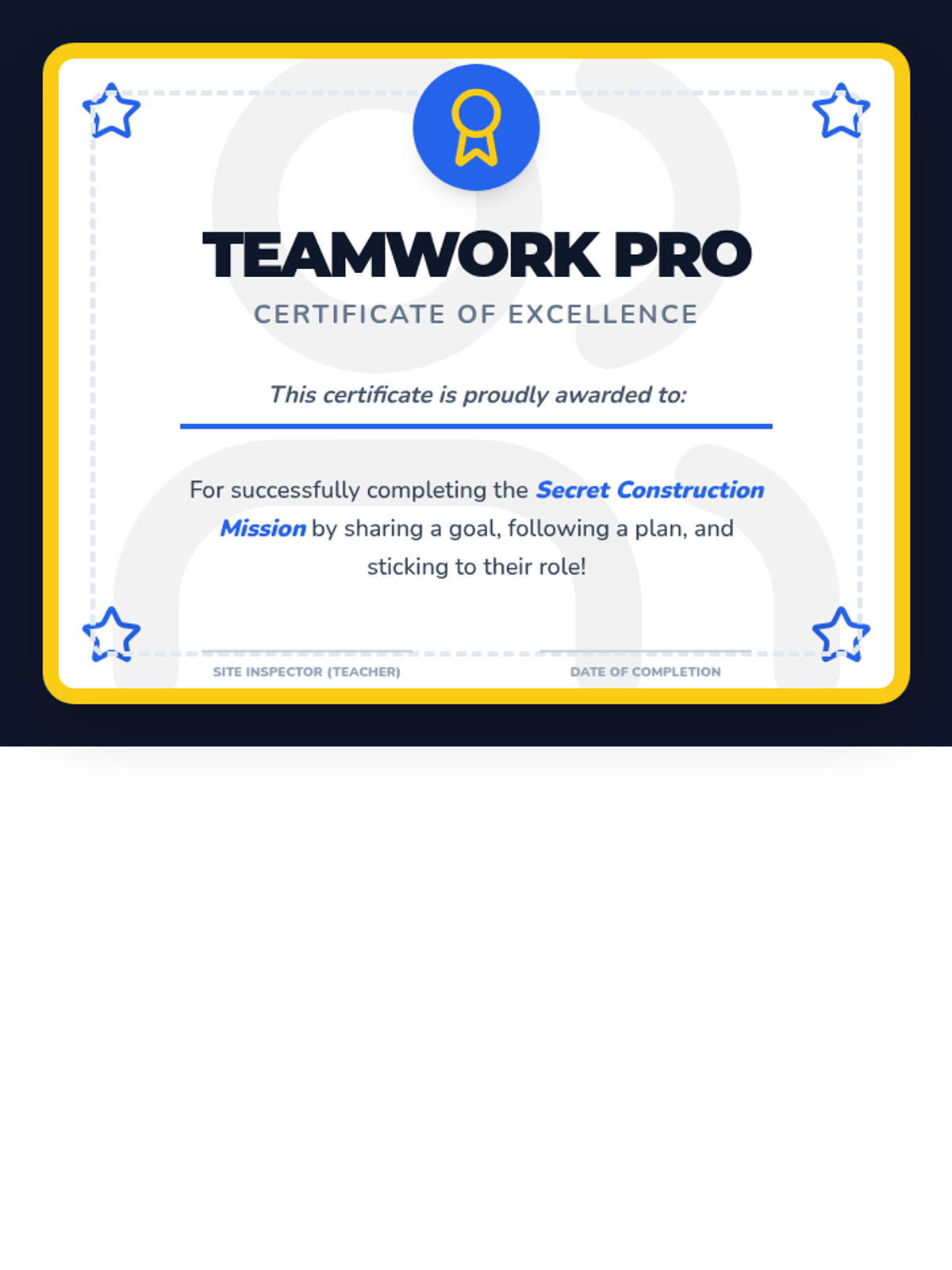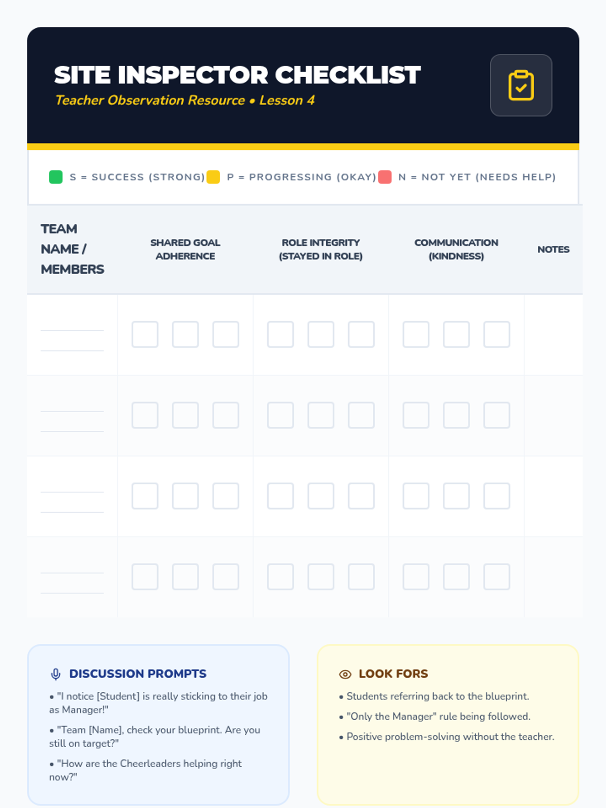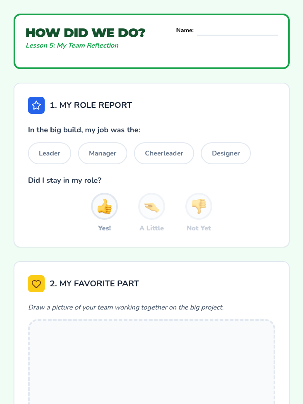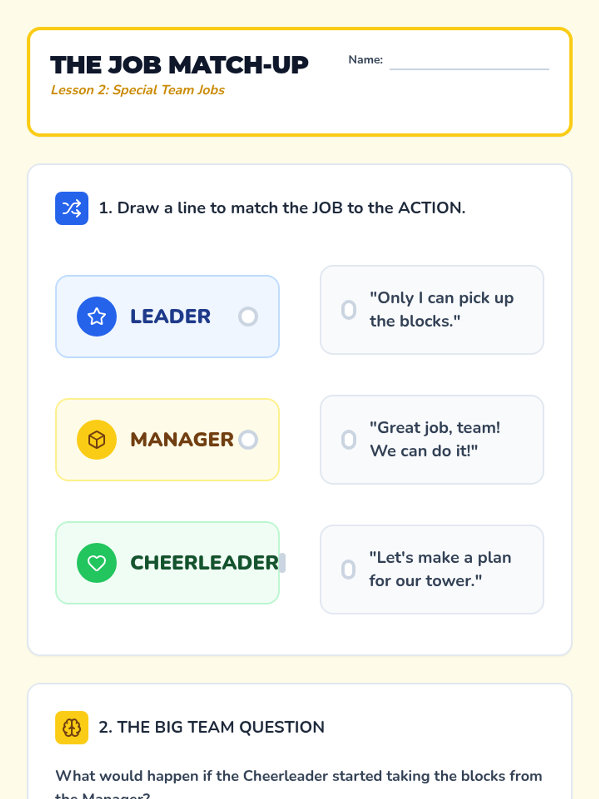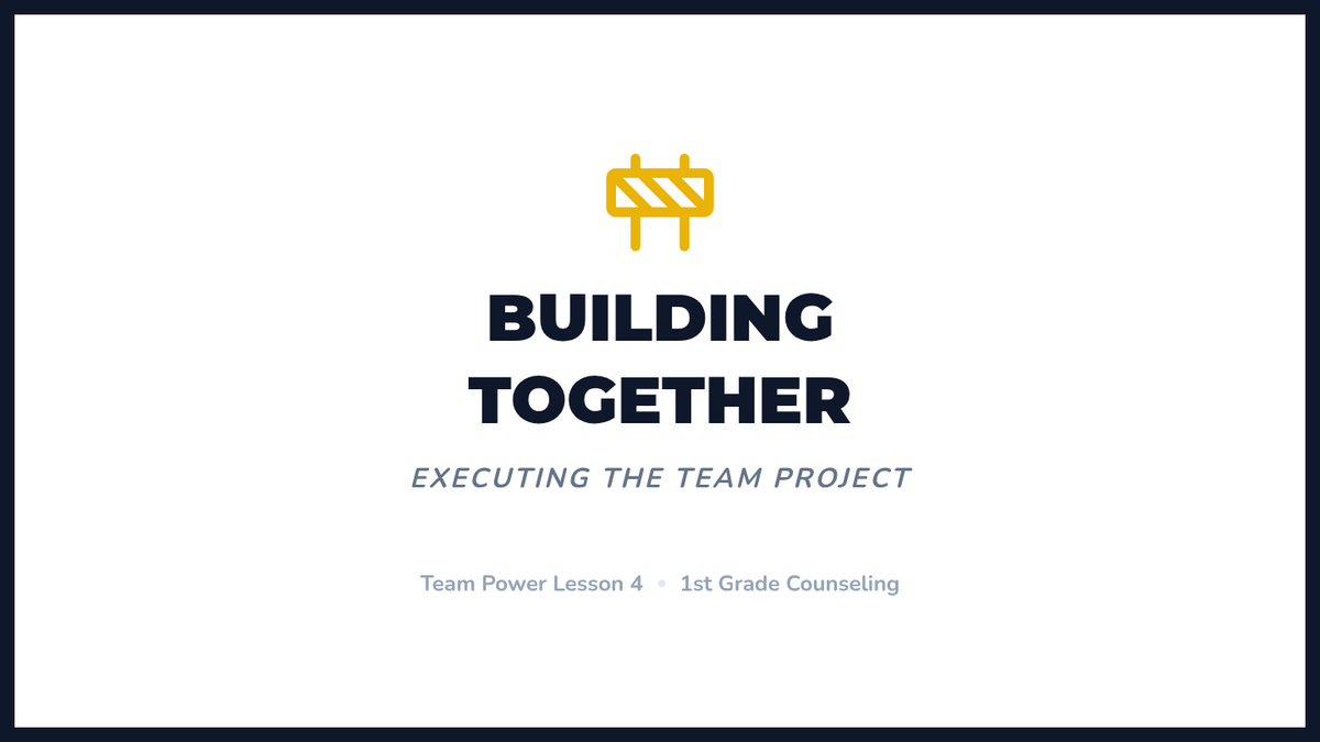A 1st-grade sequence focused on transitioning from chaotic individual play to structured teamwork through shared goals, defined roles, and collaborative planning. Students engage in a construction-themed project to practice these essential life skills.