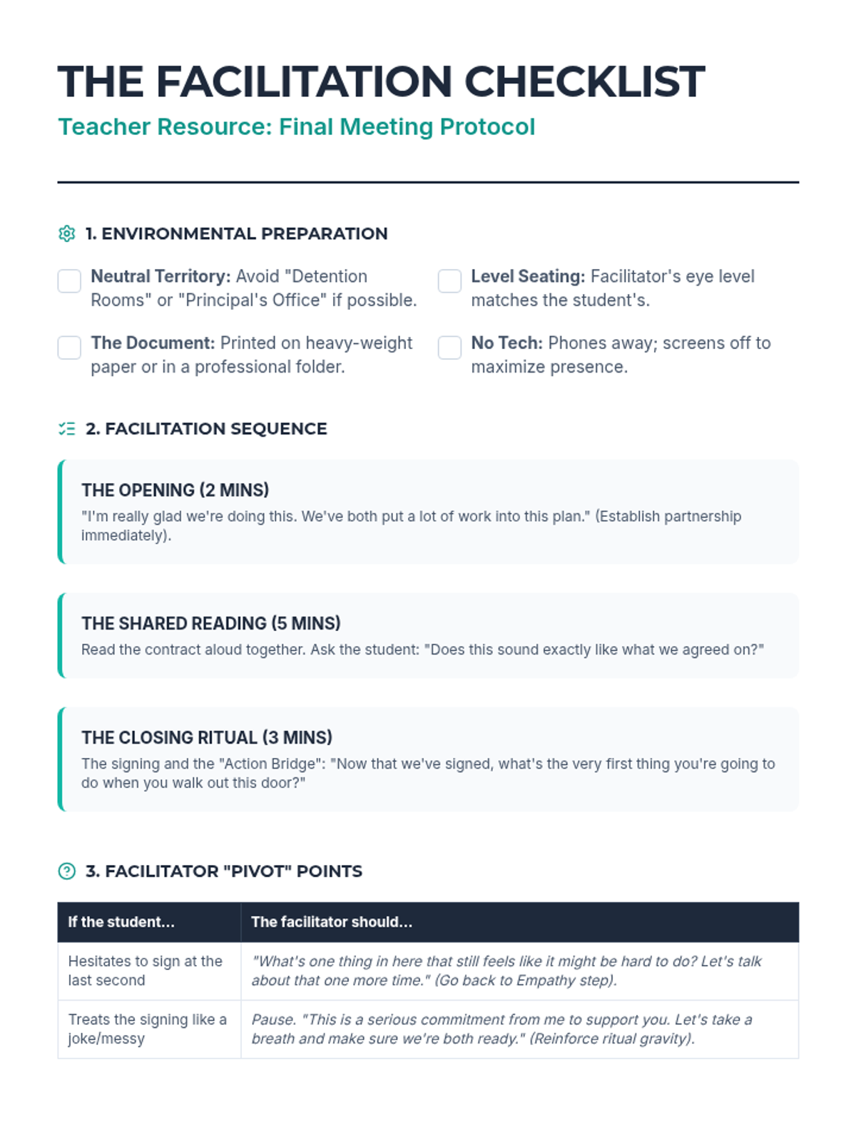 A graduate-level course on facilitating collaborative goal-setting meetings for individualized behavior contracts, emphasizing student autonomy, Motivational Interviewing, and stakeholder mediation.