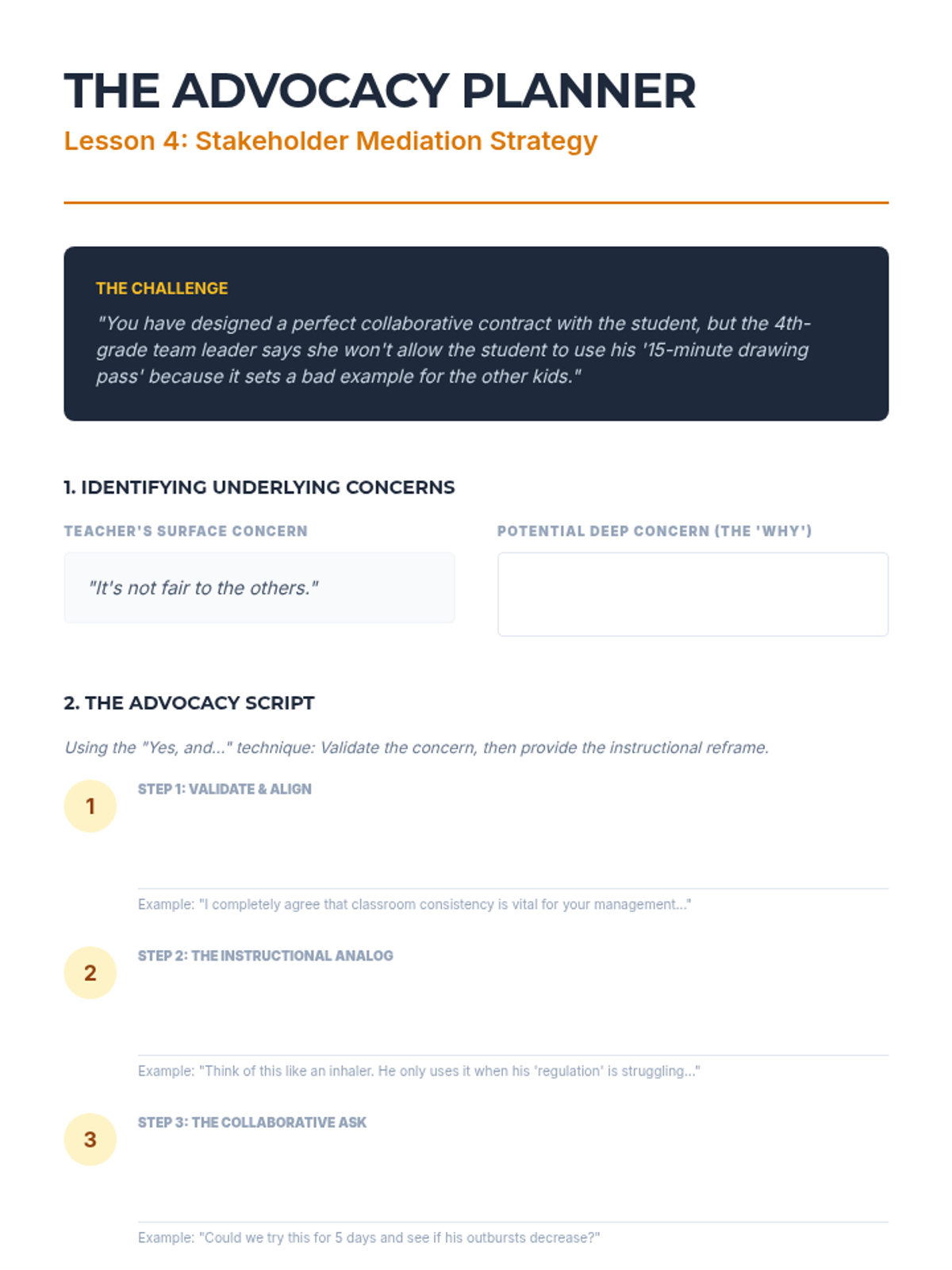 A sophisticated 8-lesson intervention designed for high school students to transition from defiant avoidance to self-regulated resets through professional advocacy and executive functioning strategies.
