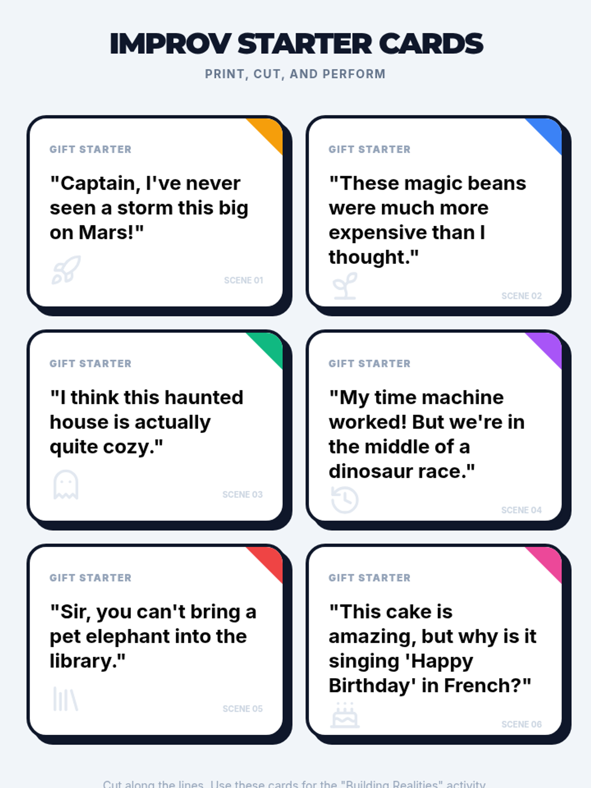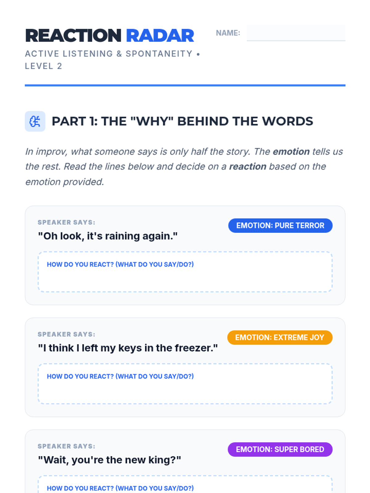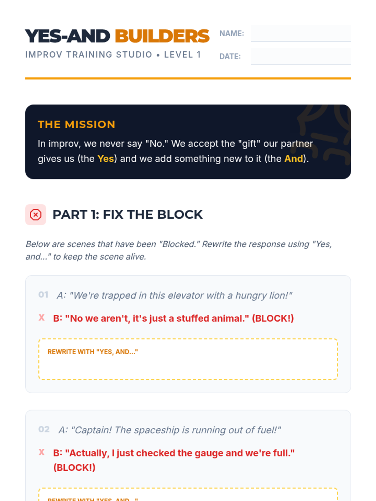 This sequence focuses on improvisation and ensemble building, teaching students to think quickly and collaborate creatively. The arc moves from basic rule-setting (Yes, And) to active listening and reacting in the moment. Students learn to build scenes cooperatively without a script, focusing on maintaining character and narrative logic.