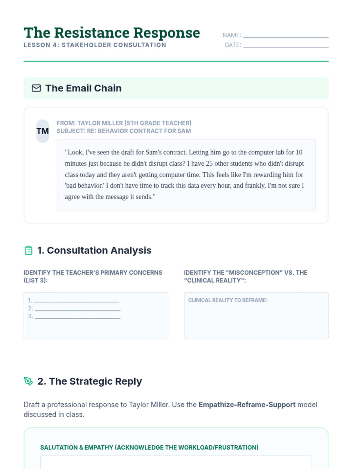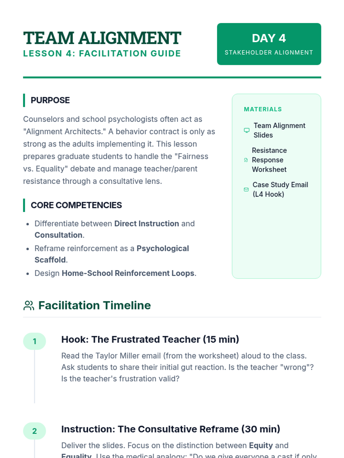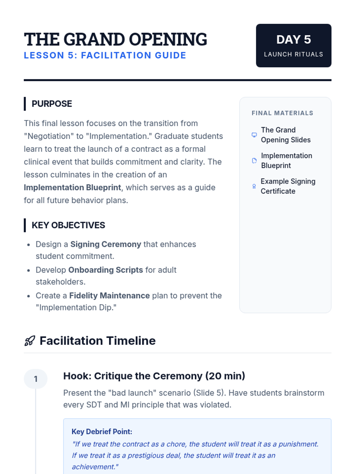 This graduate-level sequence focuses on the interpersonal and therapeutic aspects of behavior contracting. Rather than treating the contract as a static document, students explore it as a collaborative intervention designed to build student agency, self-regulation, and stakeholder alignment using Motivational Interviewing and negotiation strategies.