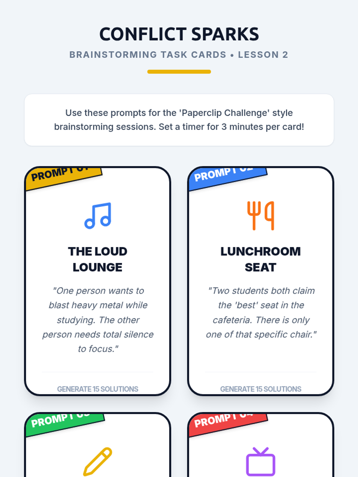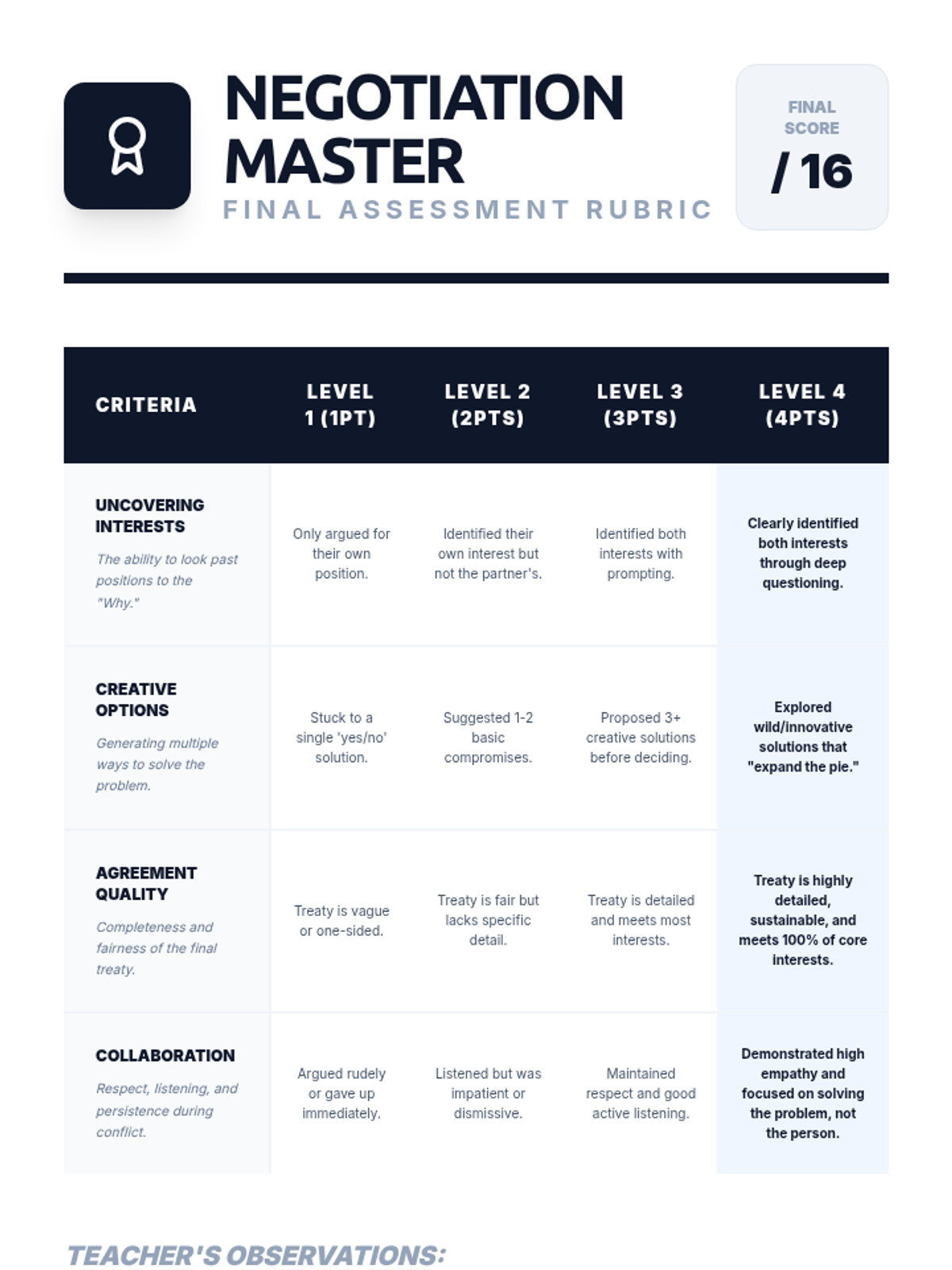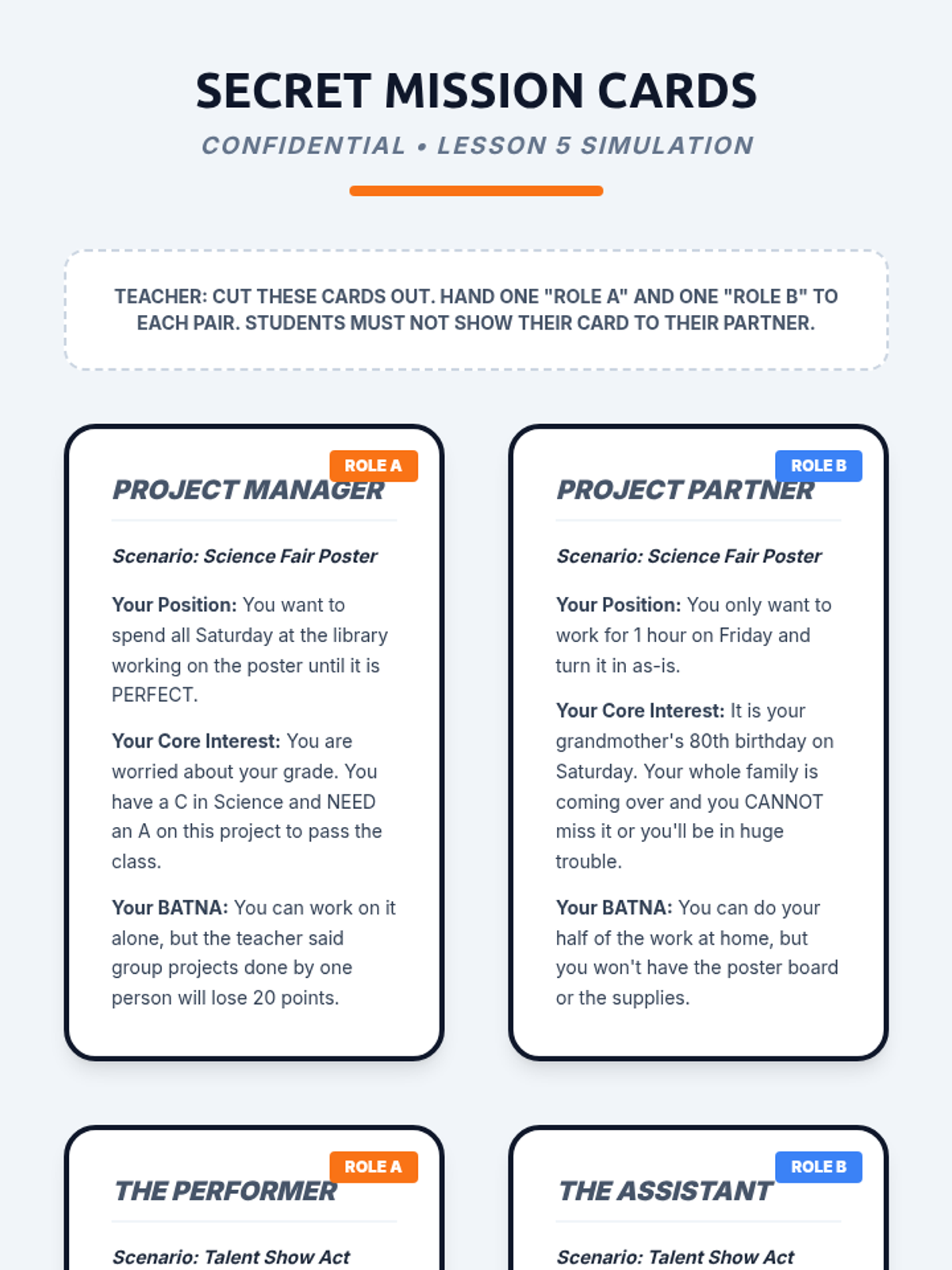 A 5-lesson sequence for 6th graders focusing on Interests-Based Negotiation. Students move from rigid positions to understanding underlying needs, brainstorming creative solutions, and evaluating fairness, culminating in a complex negotiation simulation.