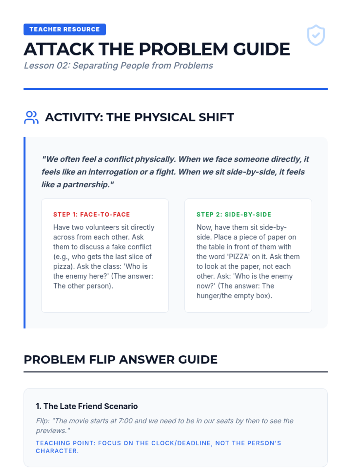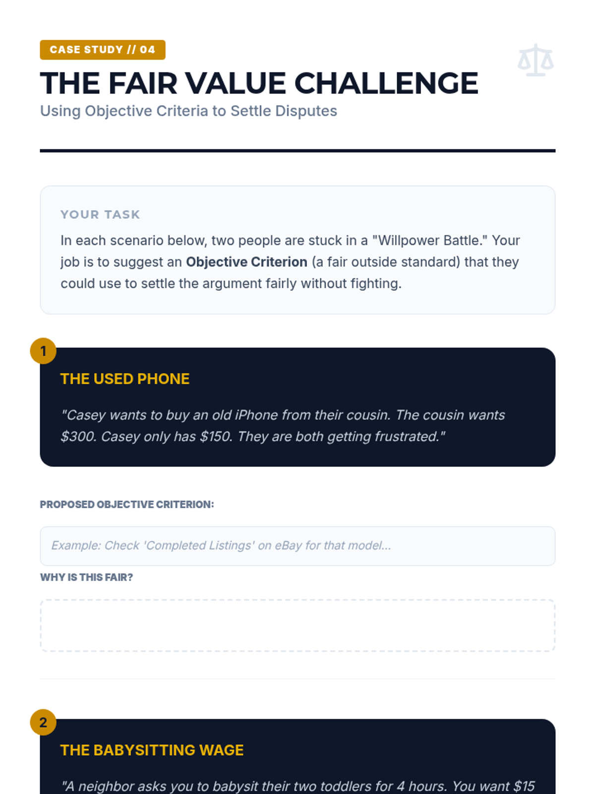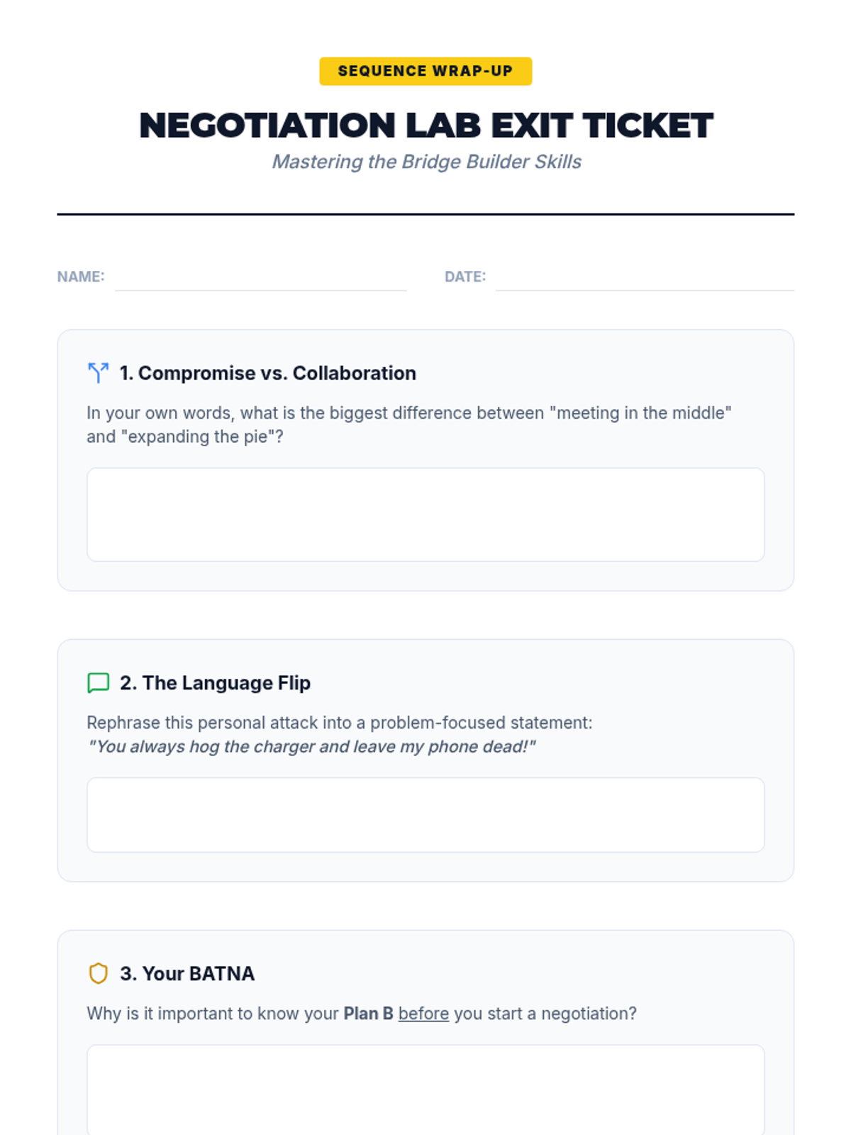 This sequence teaches 7th-grade students how to move beyond simple compromise to collaborative negotiation. Students learn to separate people from problems, brainstorm creative 'win-win' options, use objective criteria for fairness, and develop a BATNA (Best Alternative to a Negotiated Agreement) to handle complex conflicts effectively while preserving relationships.