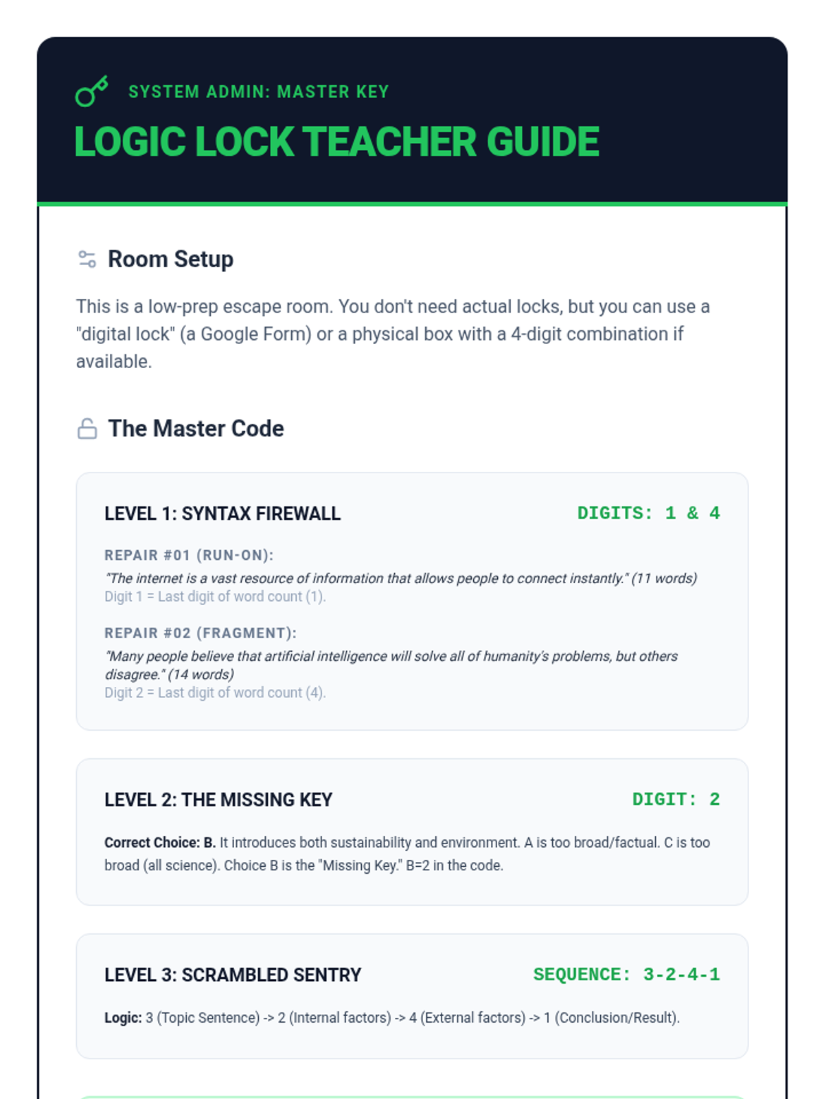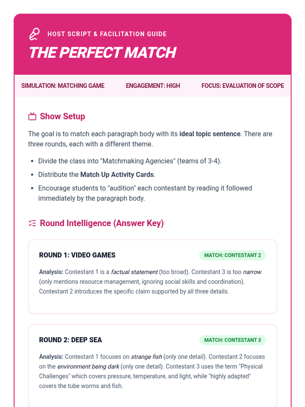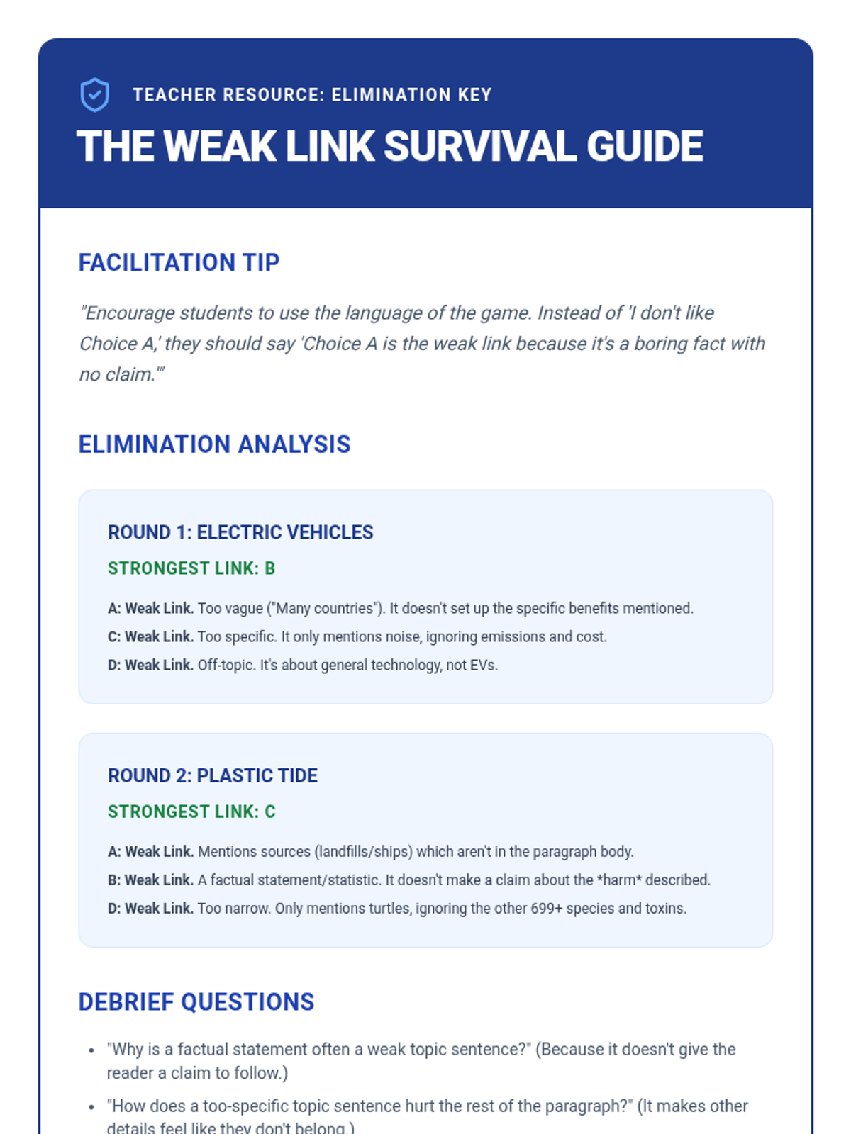 A game-based sequence for 7th-grade students to master topic sentences through collaborative sorting, matching, and problem-solving activities. Students move from identifying categories to evaluating the strength of claims and ensuring paragraph cohesion.