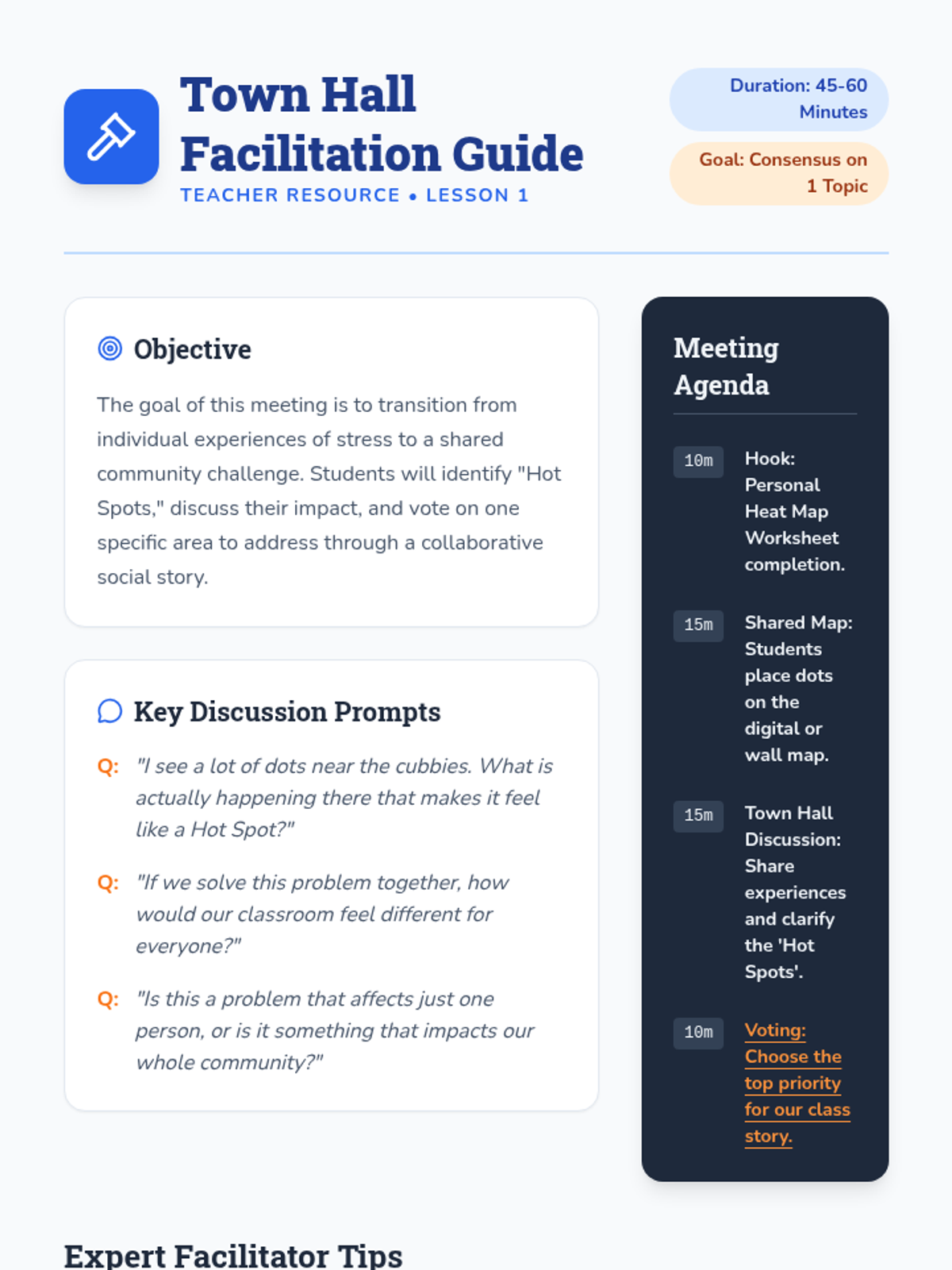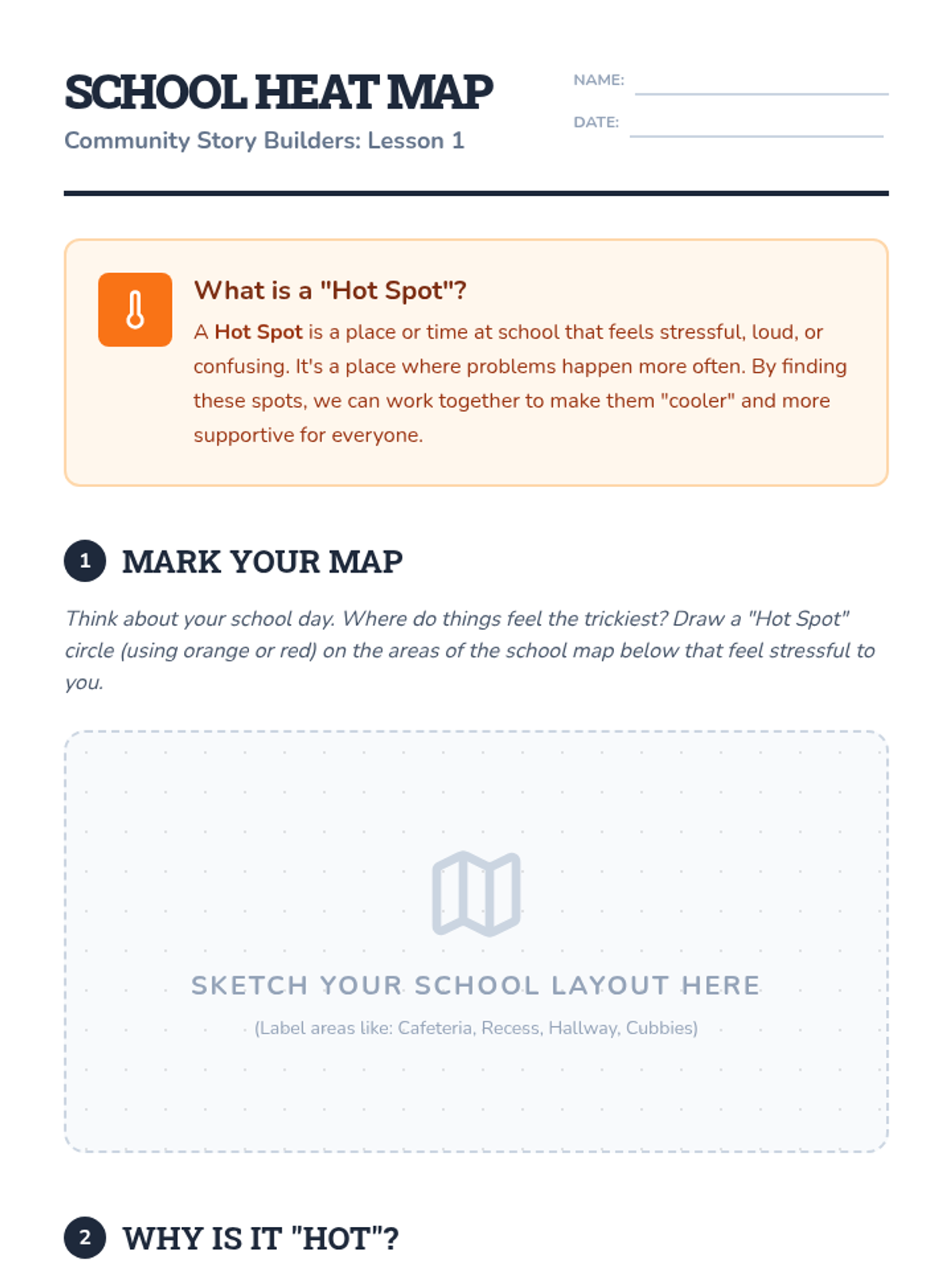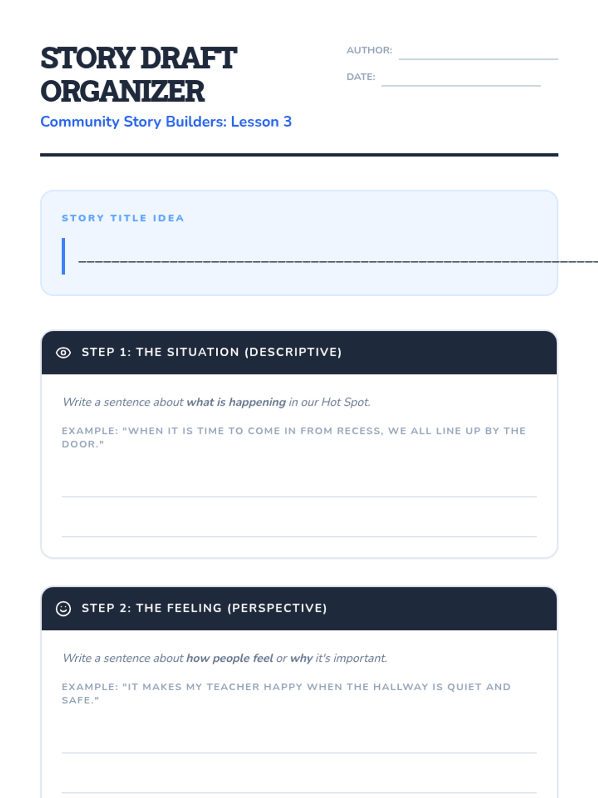 A community-focused sequence where 4th grade students collaboratively identify shared classroom challenges and create collective social stories to foster a supportive environment. Students transition from identifying 'hot spots' of stress to building, implementing, and reflecting on narrative-based behavioral solutions.