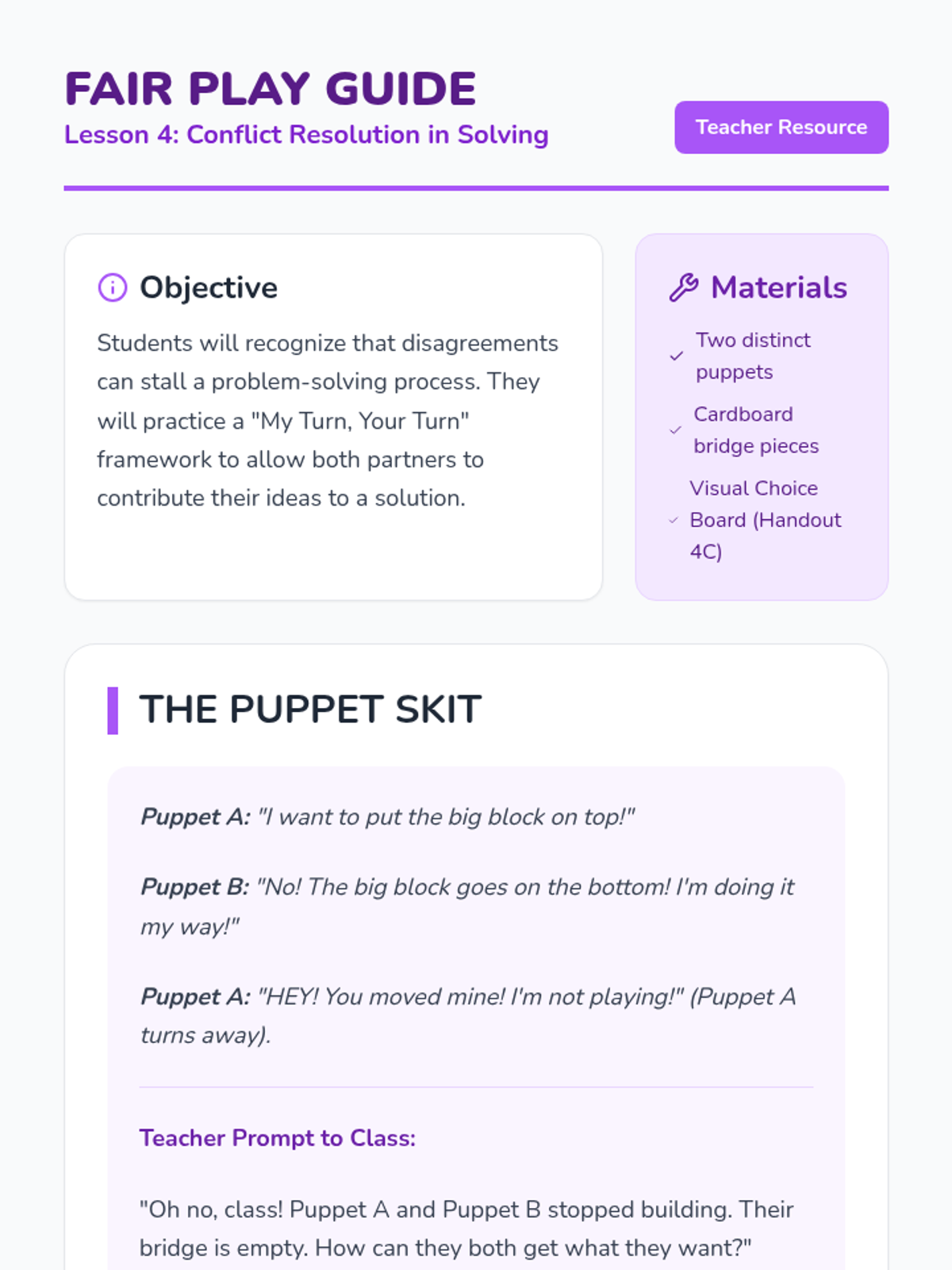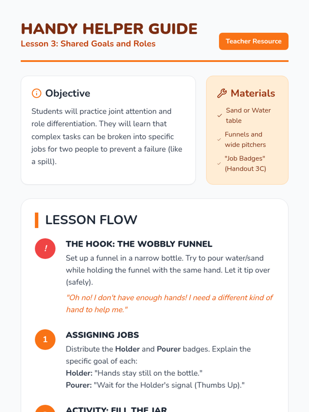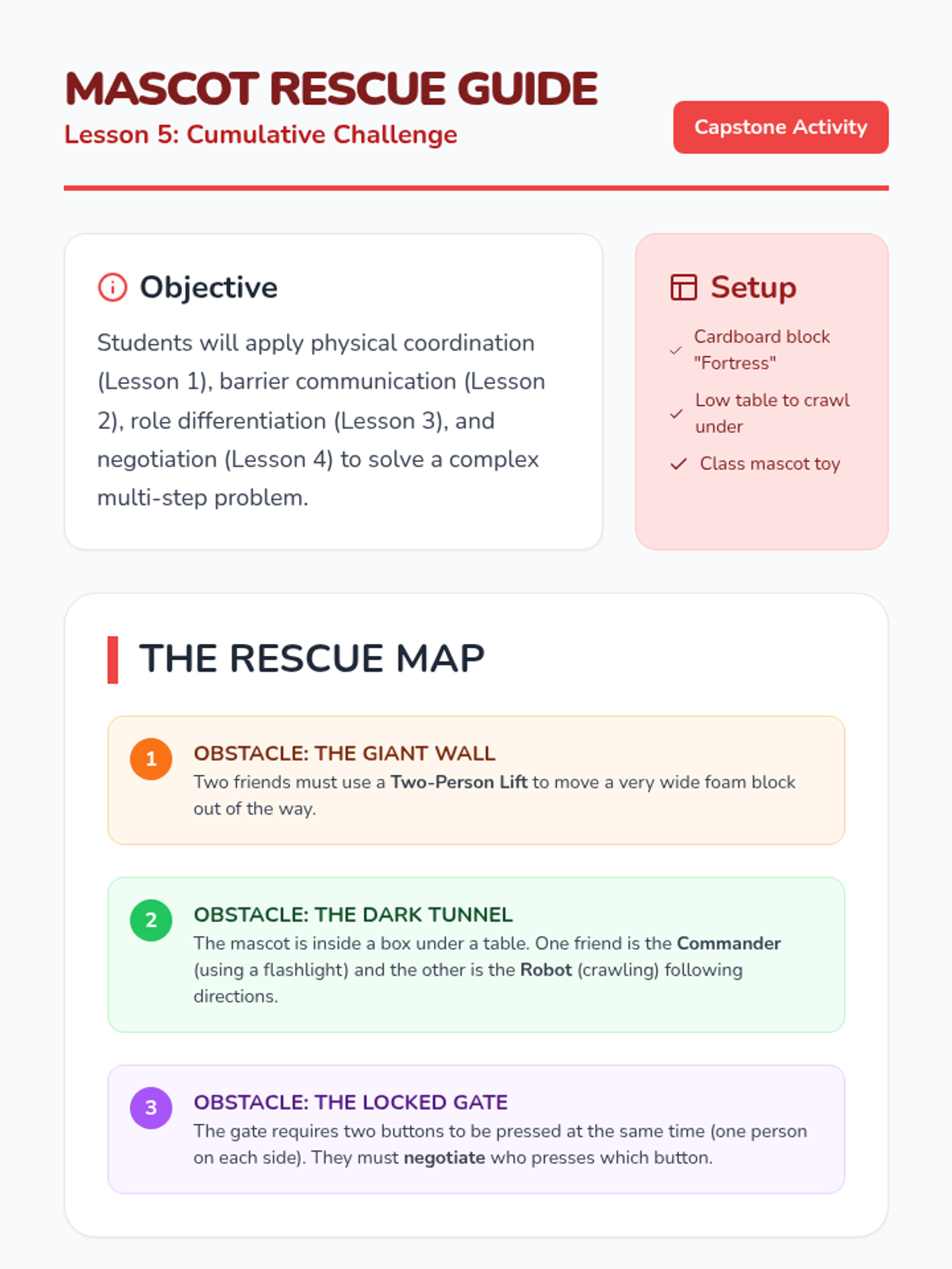 A Pre-K Special Education sequence focused on collaborative problem-solving. Students learn to work in pairs to overcome physical and communication-based obstacles through games, role-play, and hands-on tasks.