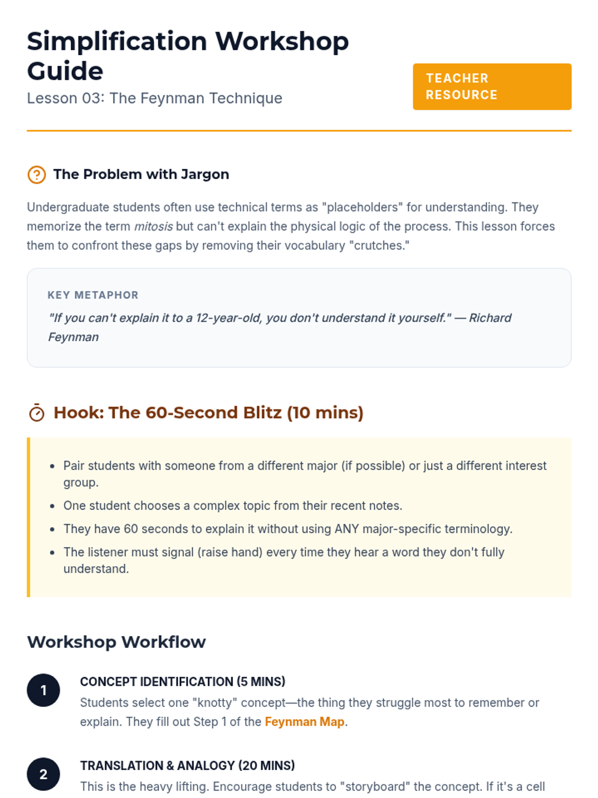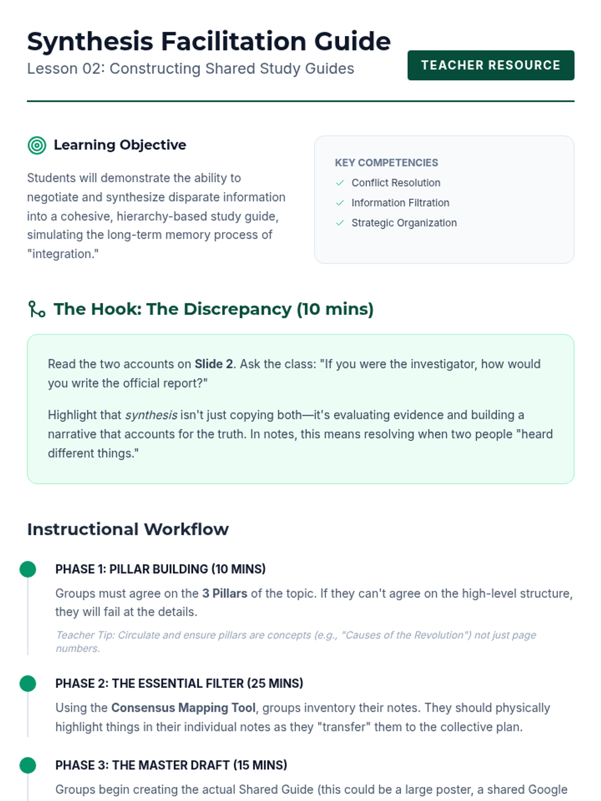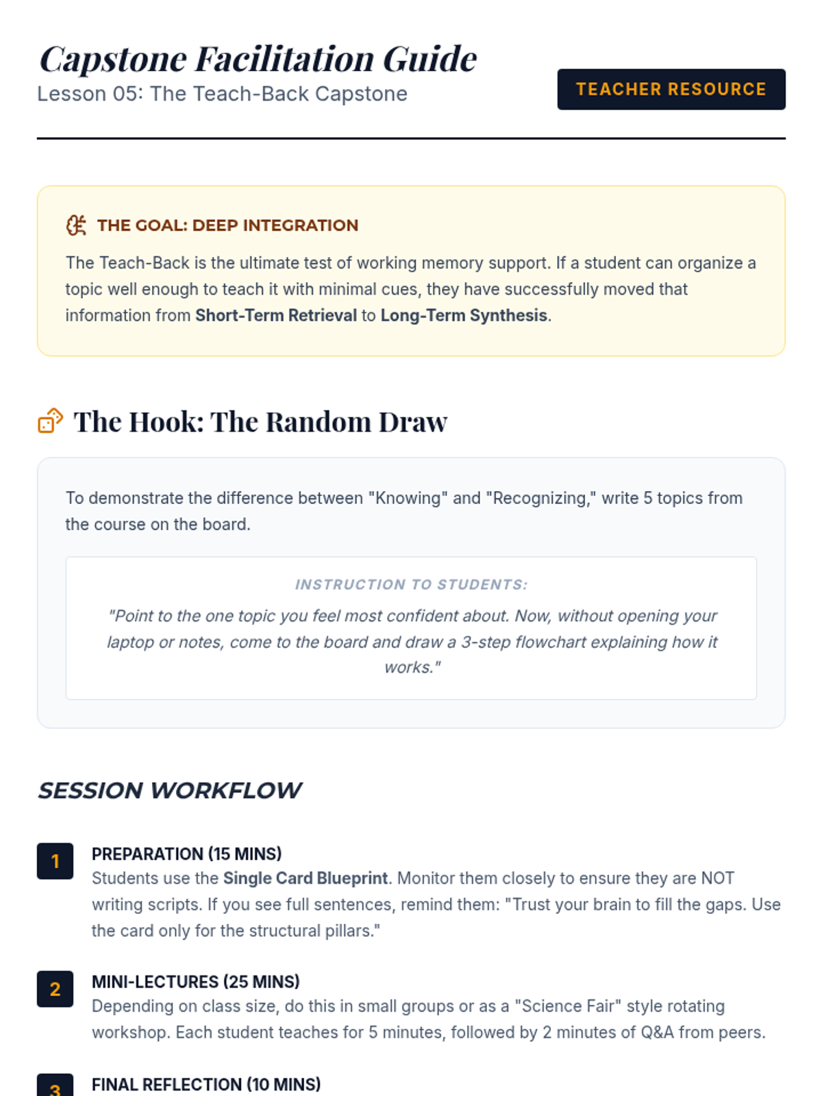 This sequence guides undergraduate students through collaborative strategies to support working memory during note review and organization. Students move from individual note consolidation to creating shared study artifacts and teaching peers, culminating in a capstone 'Teach-Back' session.