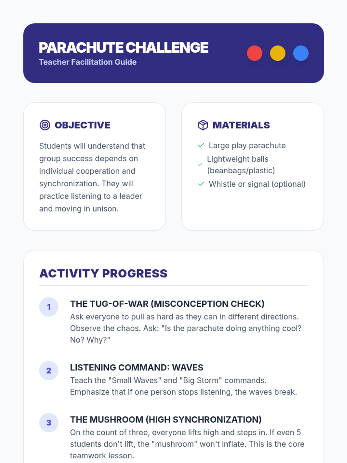 A Kindergarten sequence focused on shifting from individual performance to collaborative success through cooperative physical challenges. Students learn that teamwork involves listening, helping, and including everyone.