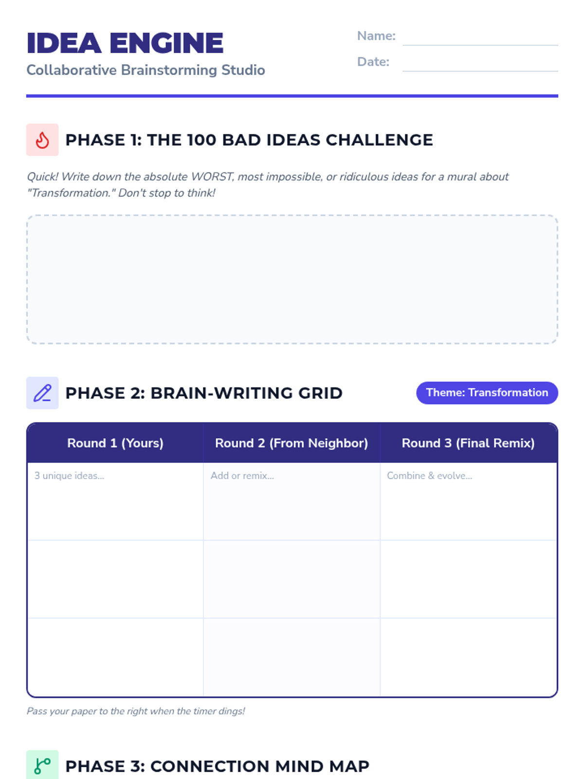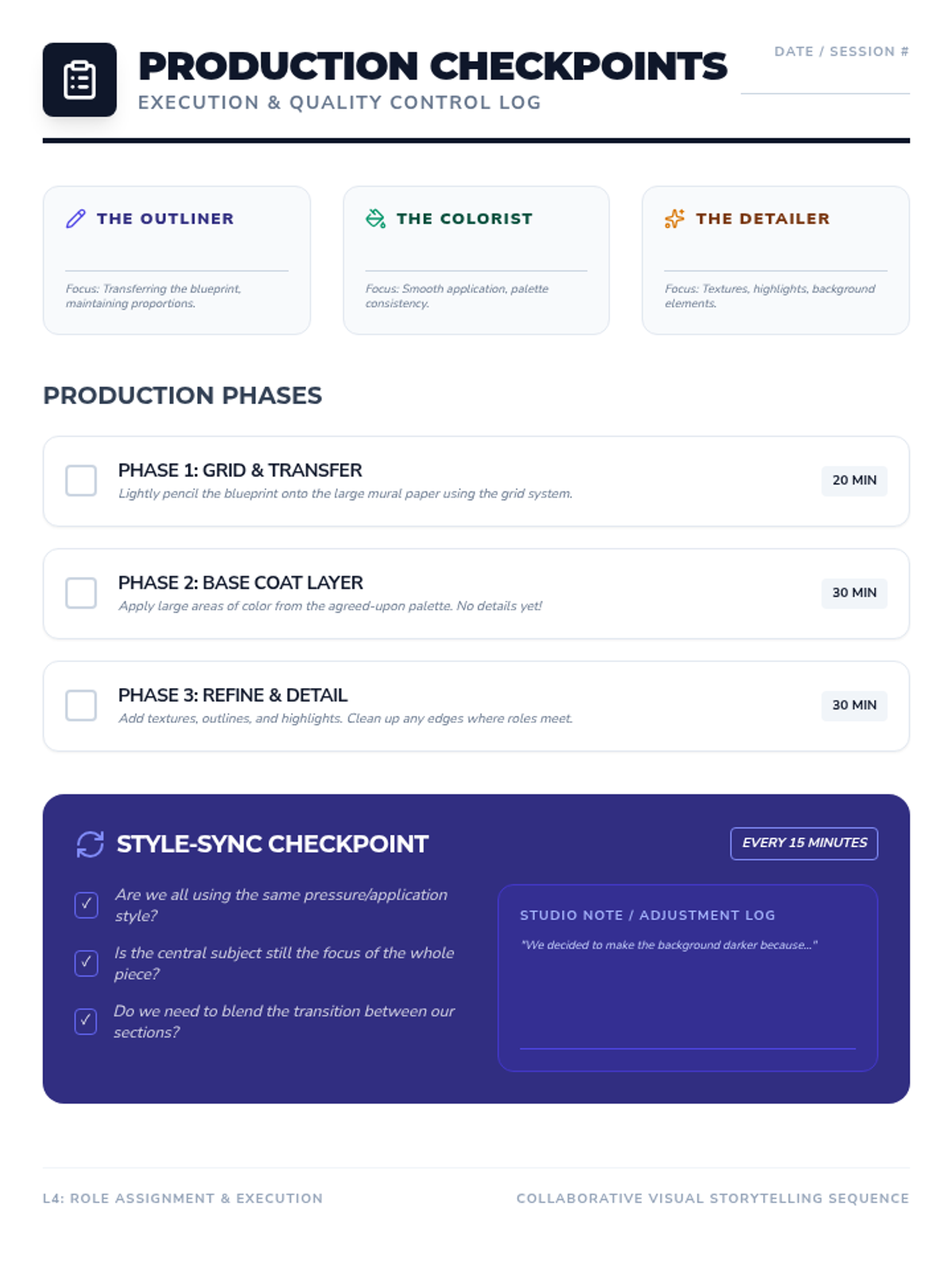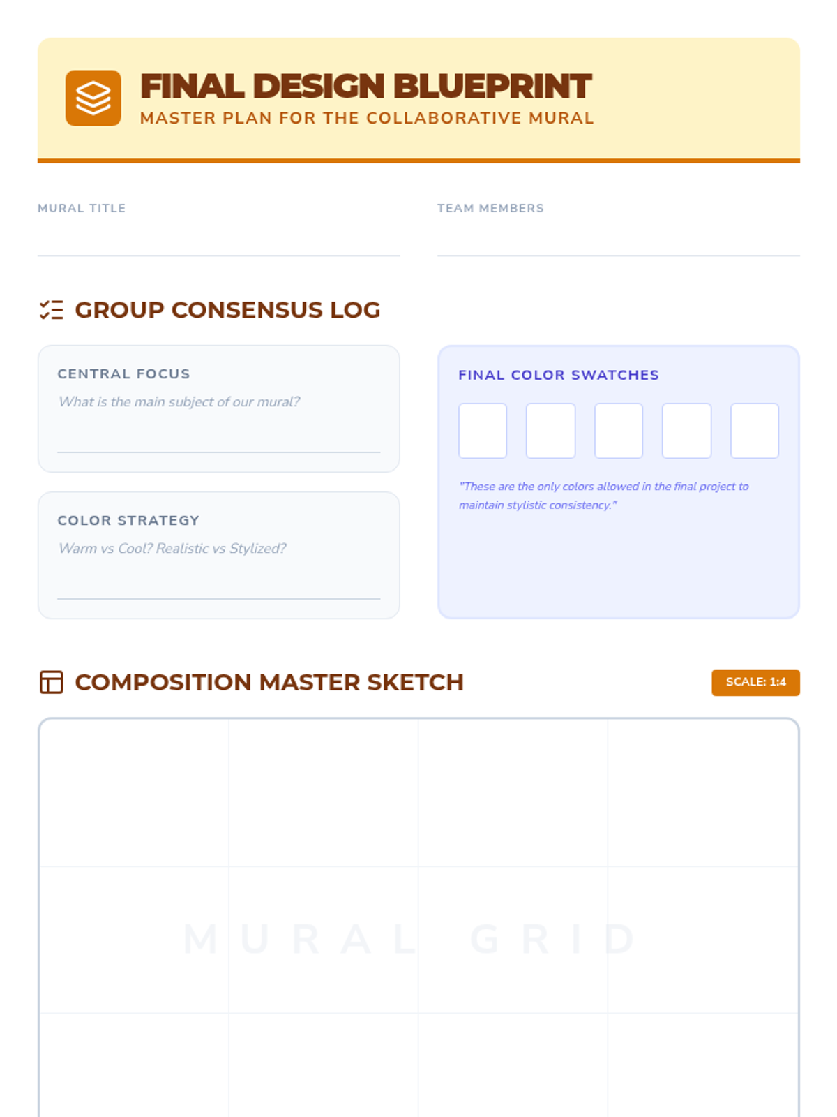 This sequence guides sixth-grade students through the lifecycle of a collaborative visual arts project, from individual brainstorming to collective mural creation. Students learn to synthesize ideas, negotiate creative differences, and assume specialized roles to execute a shared artistic vision.