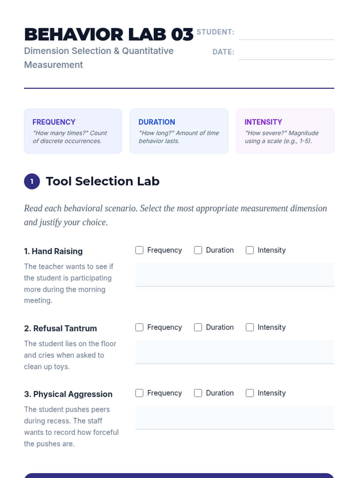 A technical and skill-based sequence for 12th graders focusing on the objective collection and analysis of behavioral data. Students master operational definitions, ABC recording, and quantitative measurement to identify environmental patterns and conduct mock functional assessments.