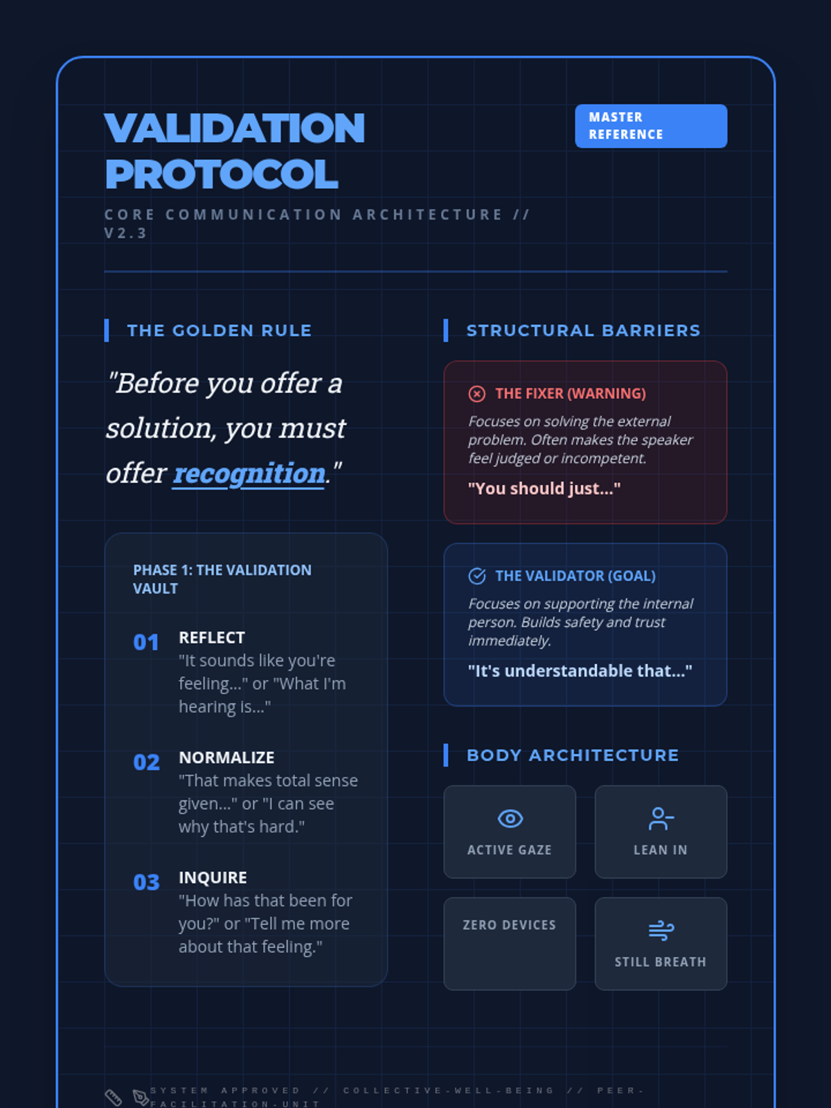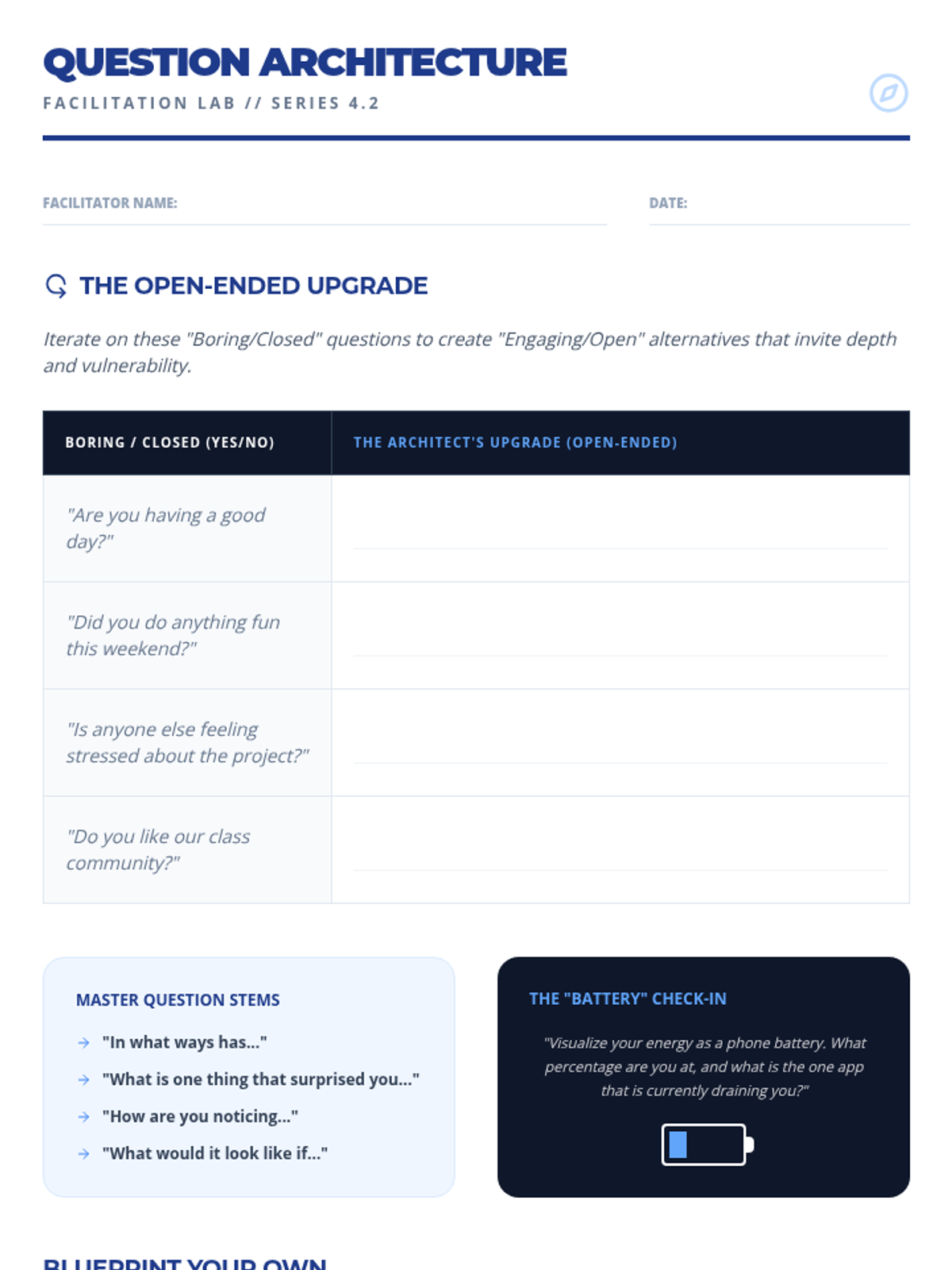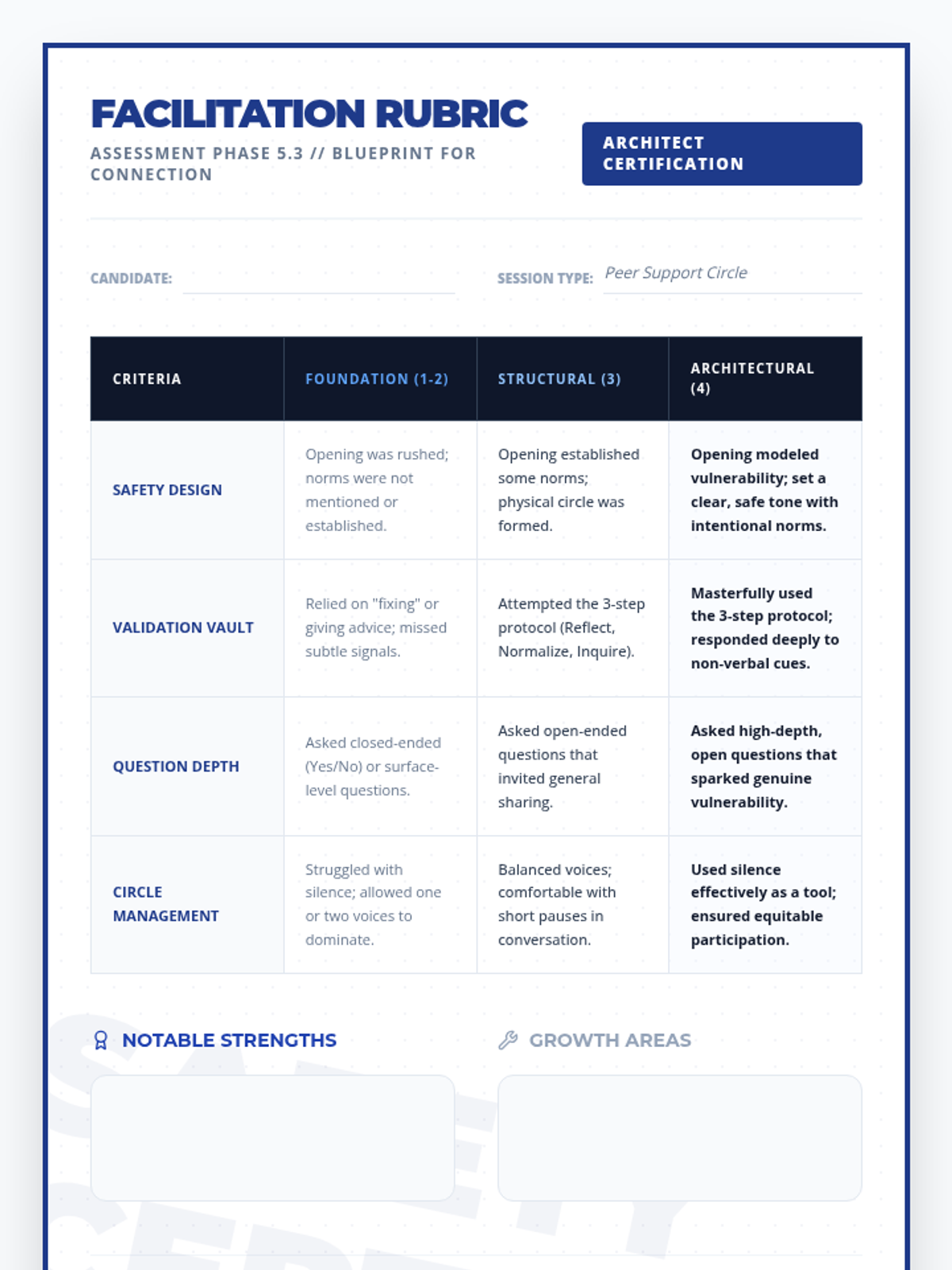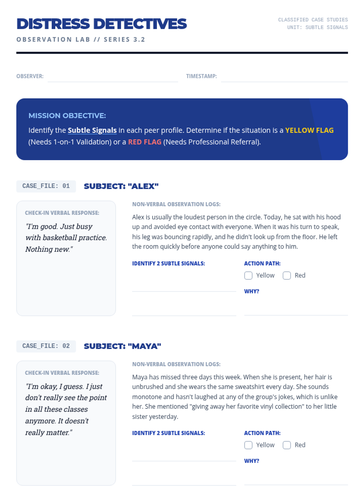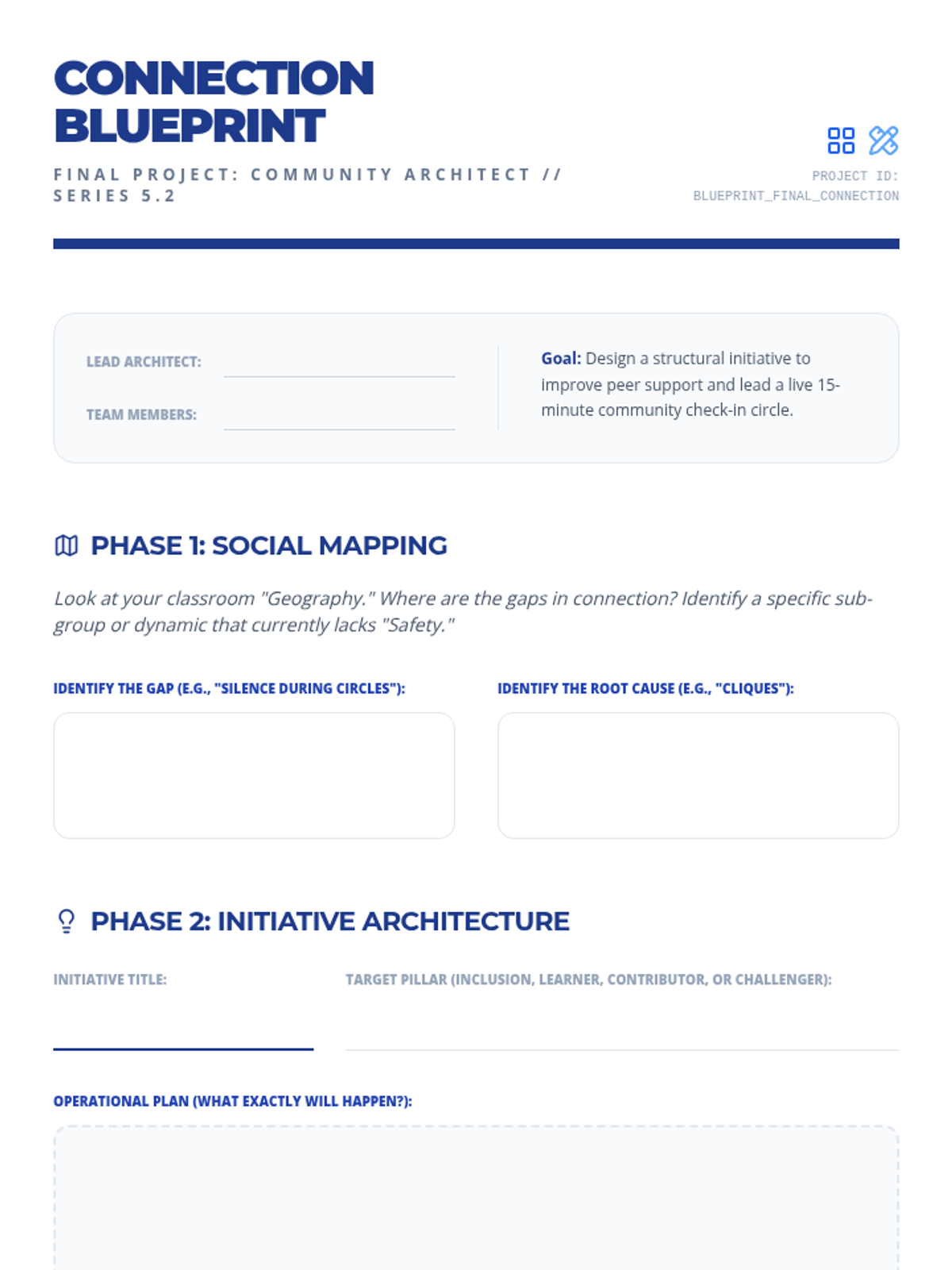 This sequence shifts the focus from individual introspection to collective well-being and leadership. Students learn to facilitate check-ins for others, developing empathy and active listening skills required for leadership roles. The arc explores the psychology of psychological safety, how to spot distress in peers, and how to build a supportive community culture. Students move from participants to facilitators, eventually leading community circles or peer support groups.