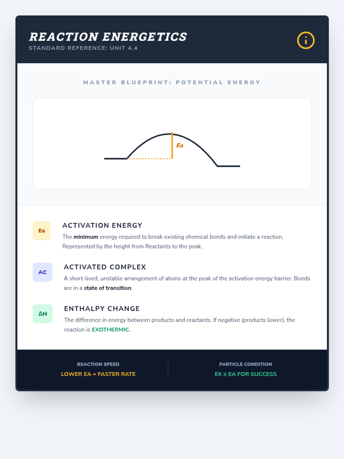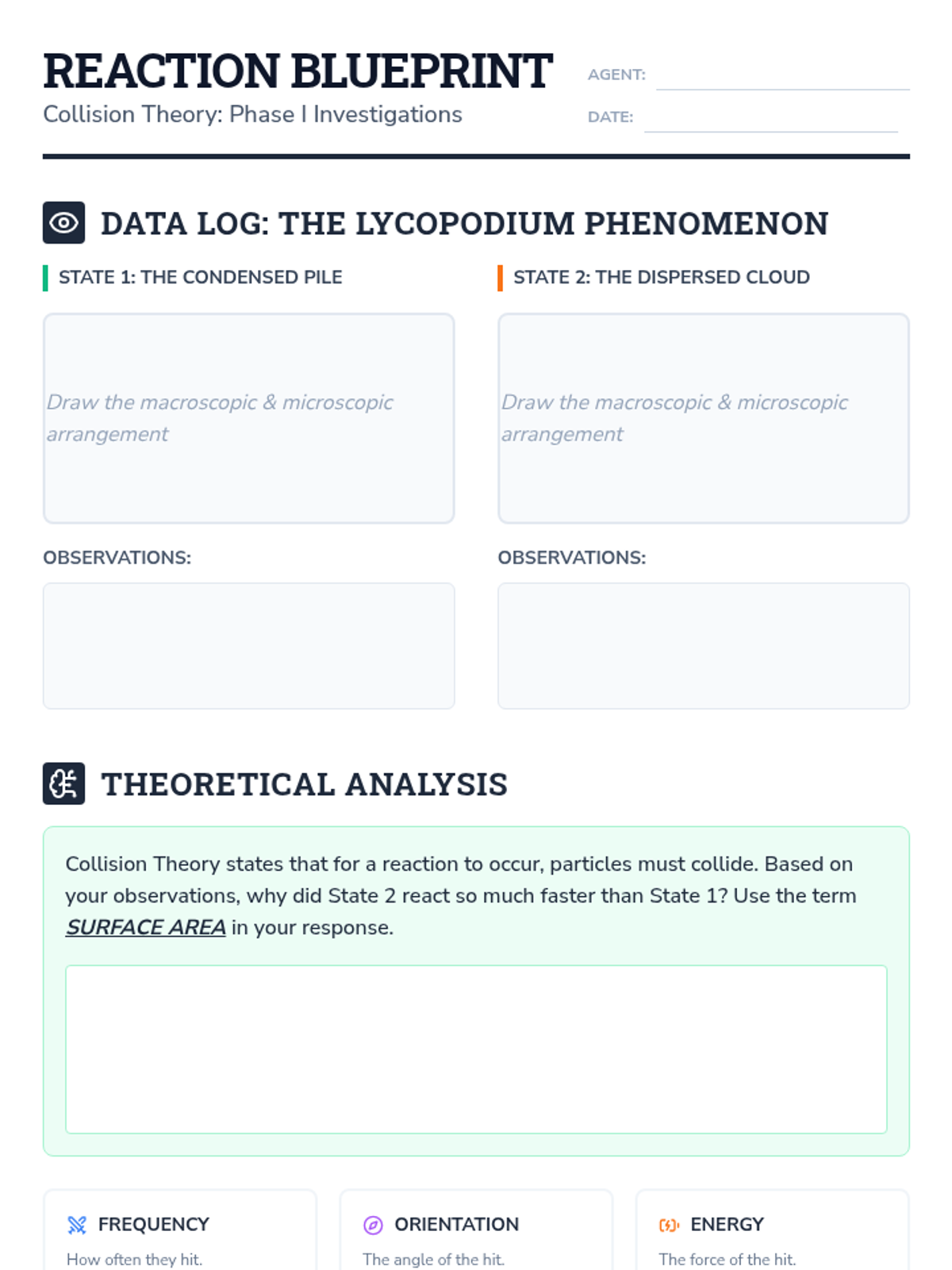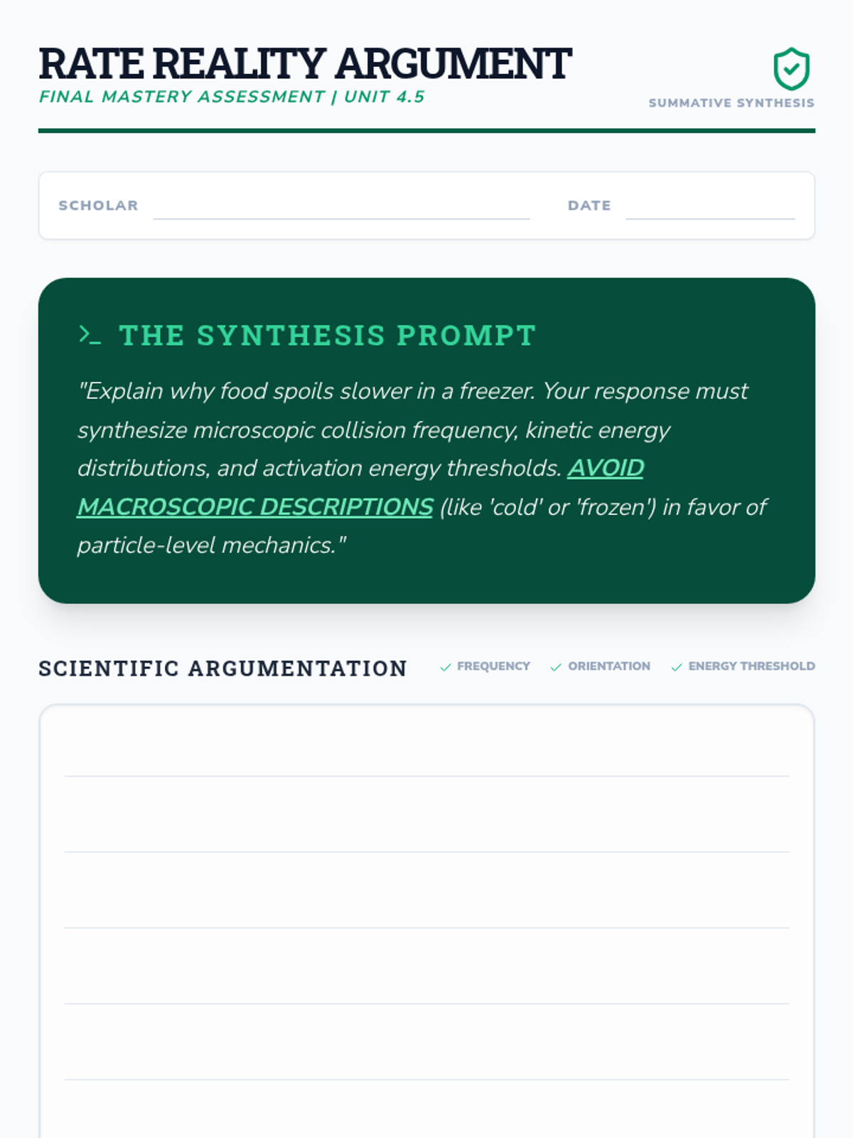 A comprehensive 12th Grade Chemistry sequence exploring how microscopic particle interactions dictate macroscopic reaction rates through collision theory, molecular orientation, and energy distributions.