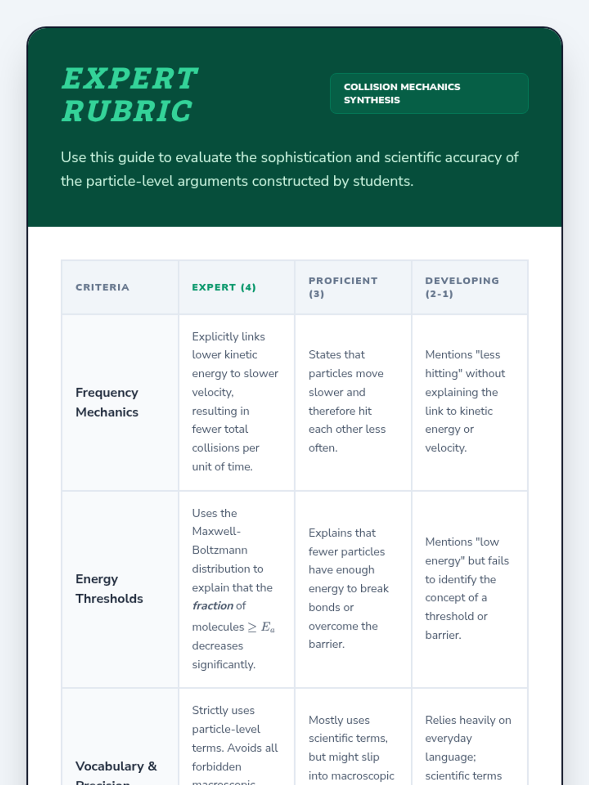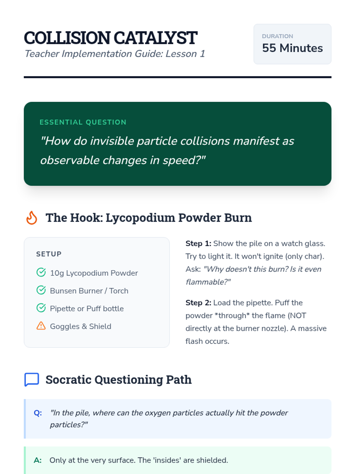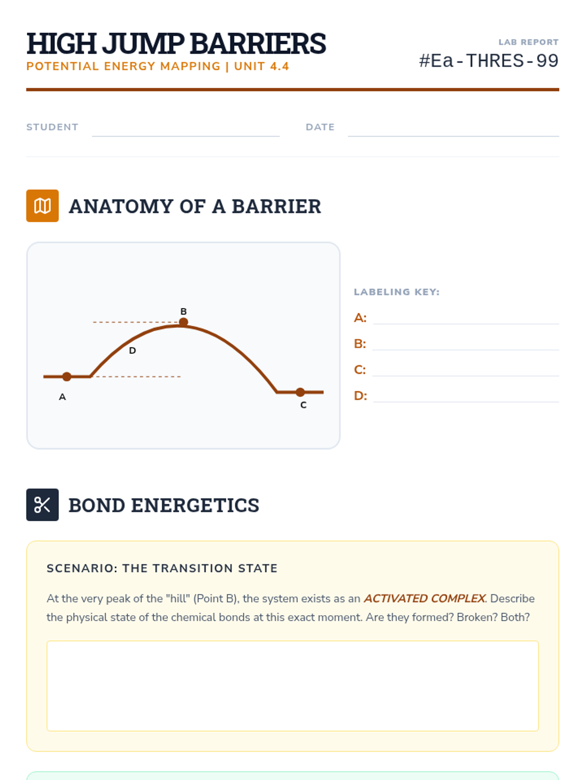 A comprehensive 12th Grade Chemistry sequence exploring how microscopic particle interactions dictate macroscopic reaction rates through collision theory, molecular orientation, and energy distributions.