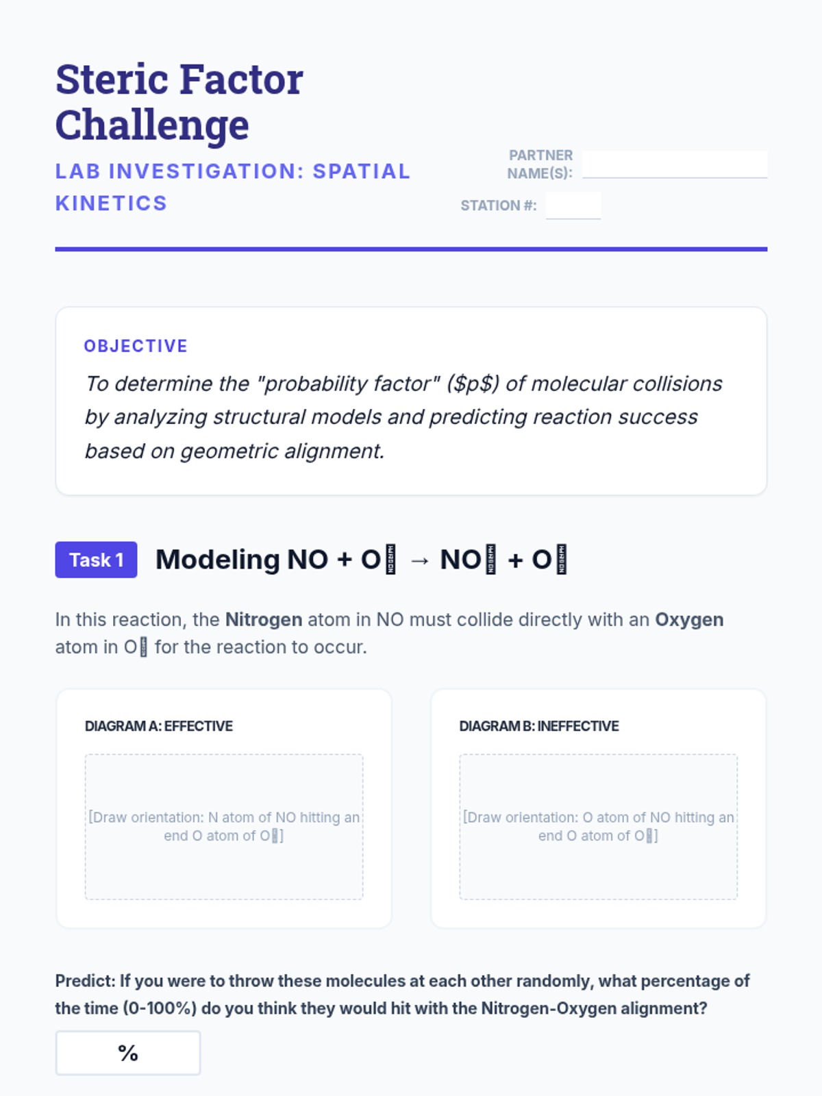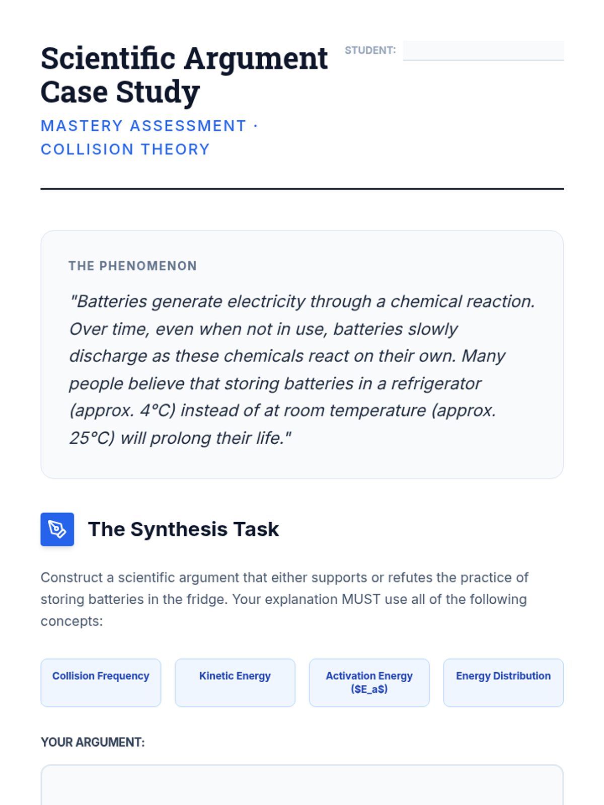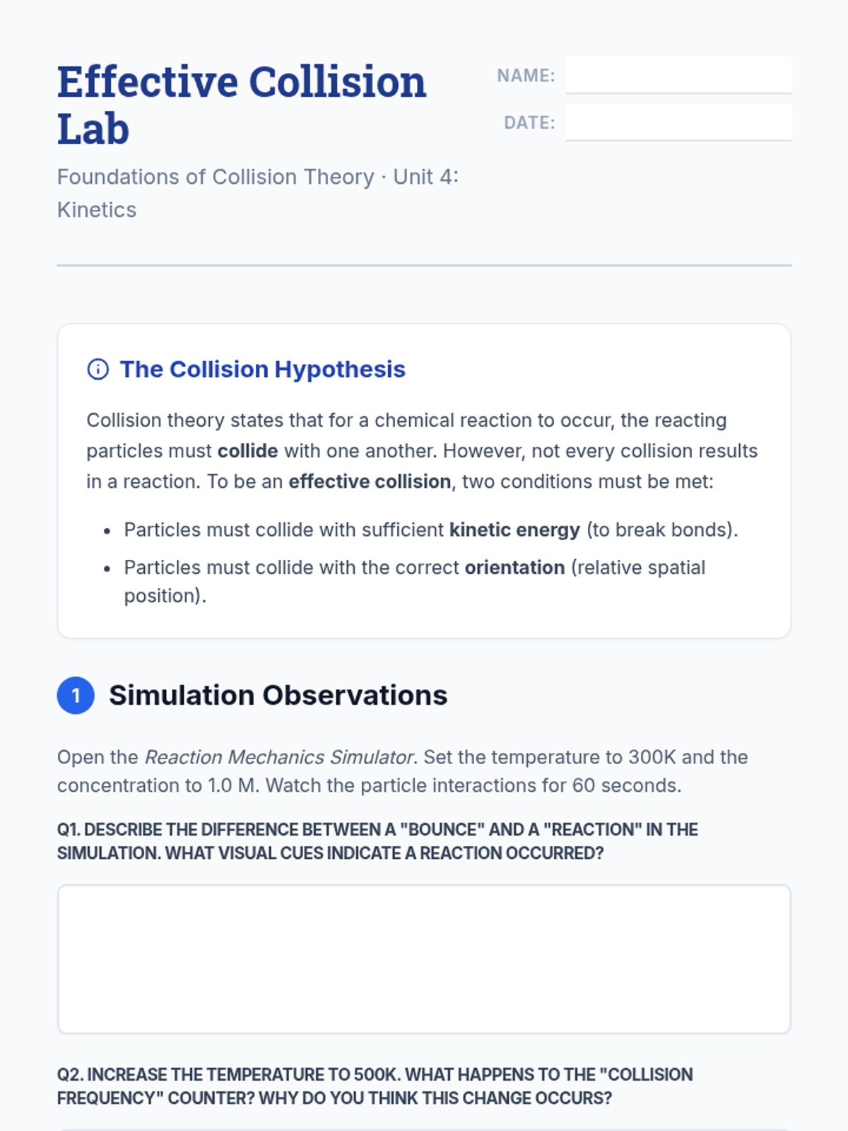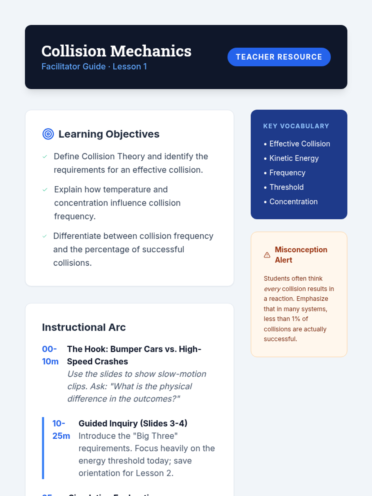 A comprehensive 5-lesson sequence for 11th-grade chemistry students exploring the microscopic mechanisms of chemical kinetics. Students use Collision Theory to explain reaction rates, analyze Maxwell-Boltzmann distributions, and evaluate activation energy barriers.