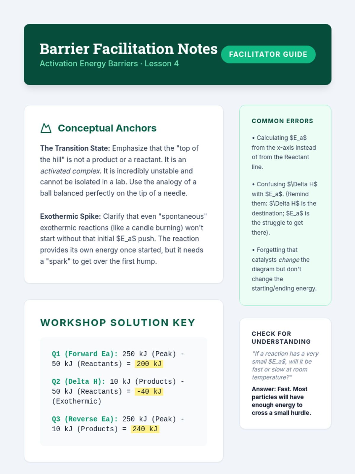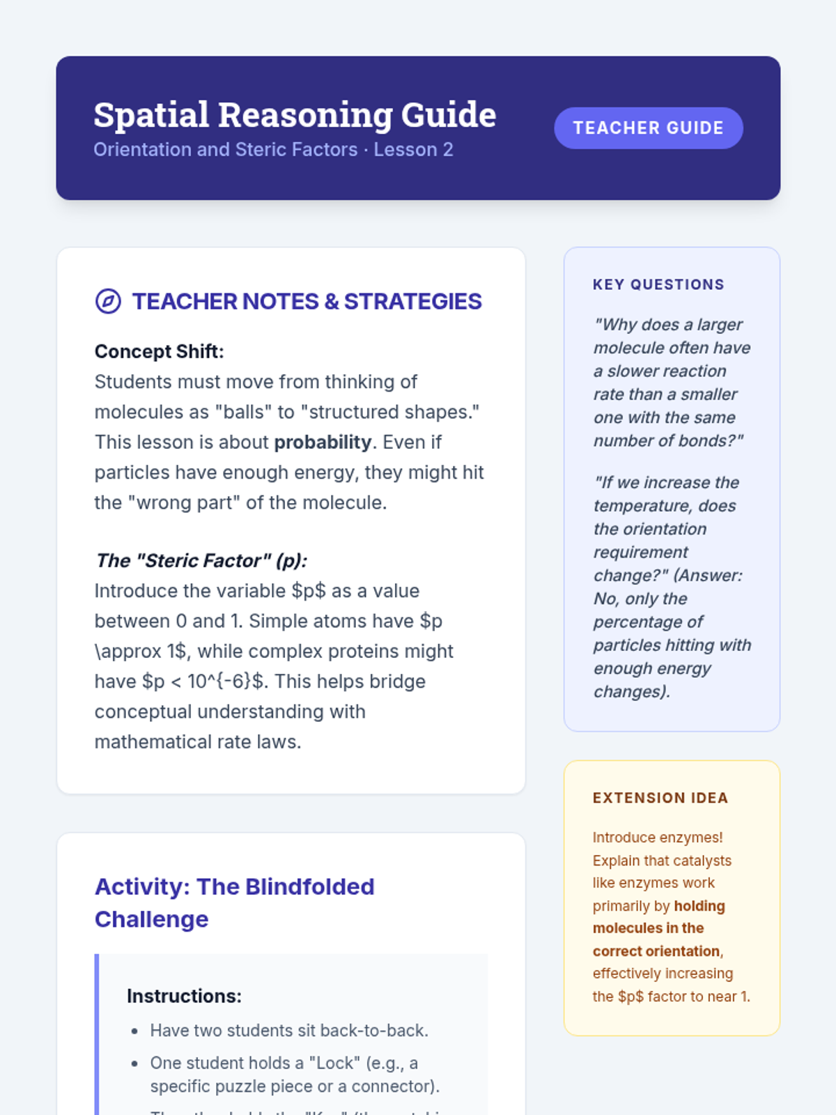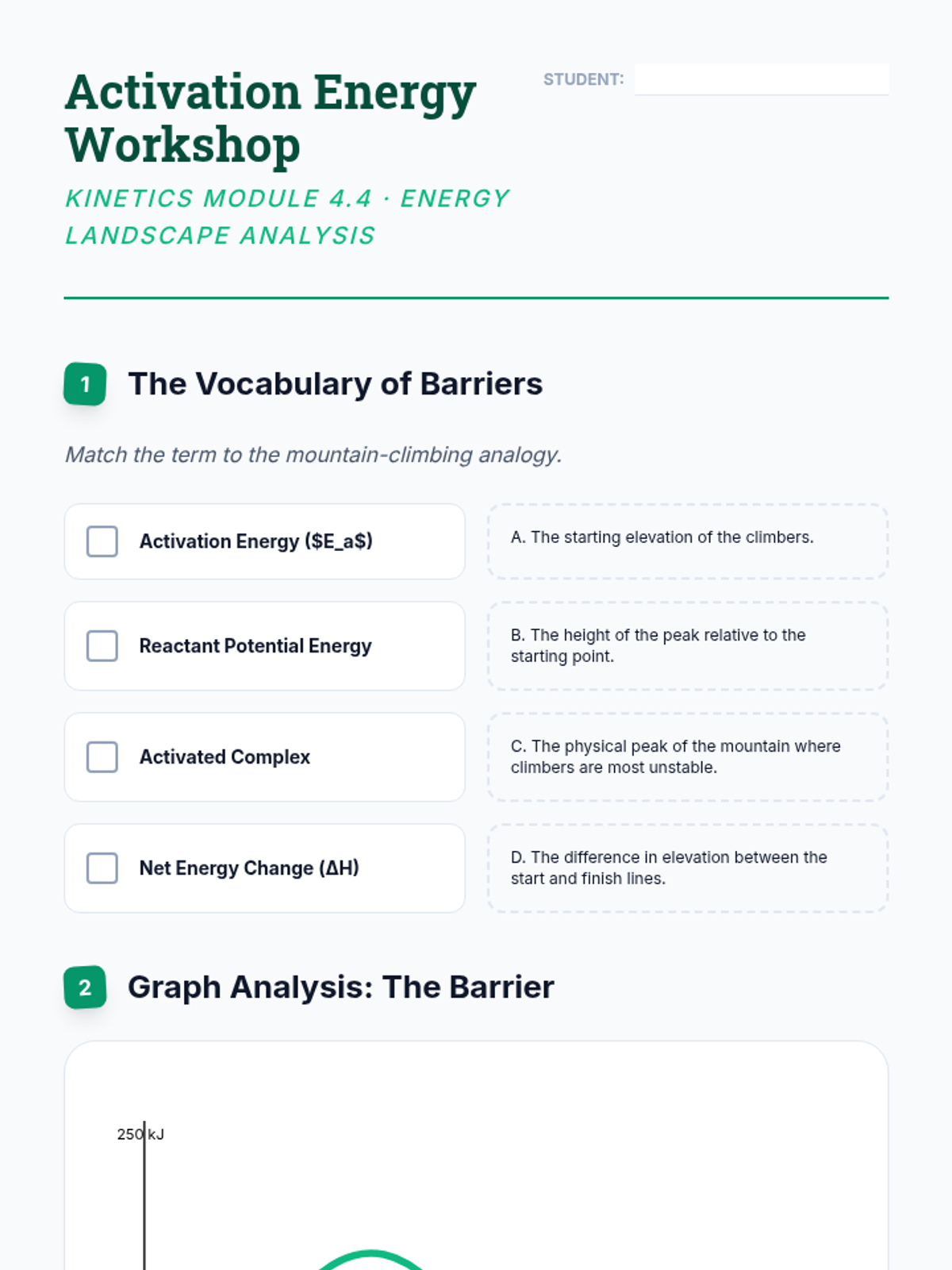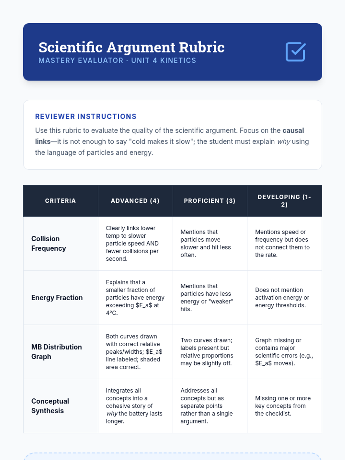 A comprehensive 5-lesson sequence for 11th-grade chemistry students exploring the microscopic mechanisms of chemical kinetics. Students use Collision Theory to explain reaction rates, analyze Maxwell-Boltzmann distributions, and evaluate activation energy barriers.