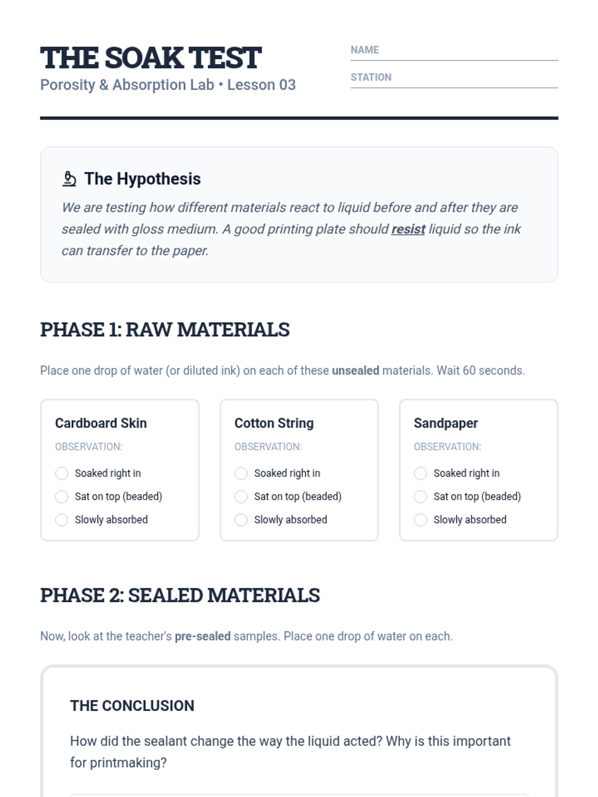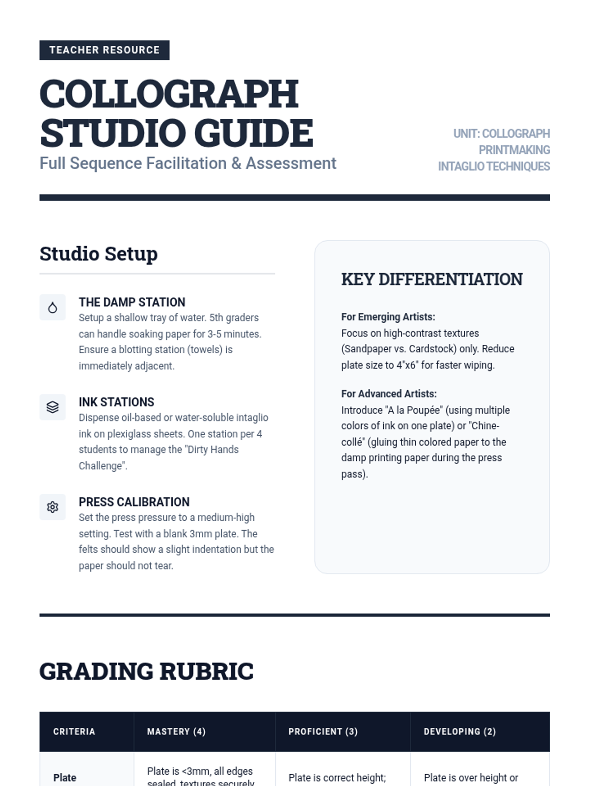 A 5-lesson unit for 5th graders exploring collograph printmaking, focusing on tactile texture, plate construction, chemical sealing, and intaglio wiping techniques to create embossed prints.