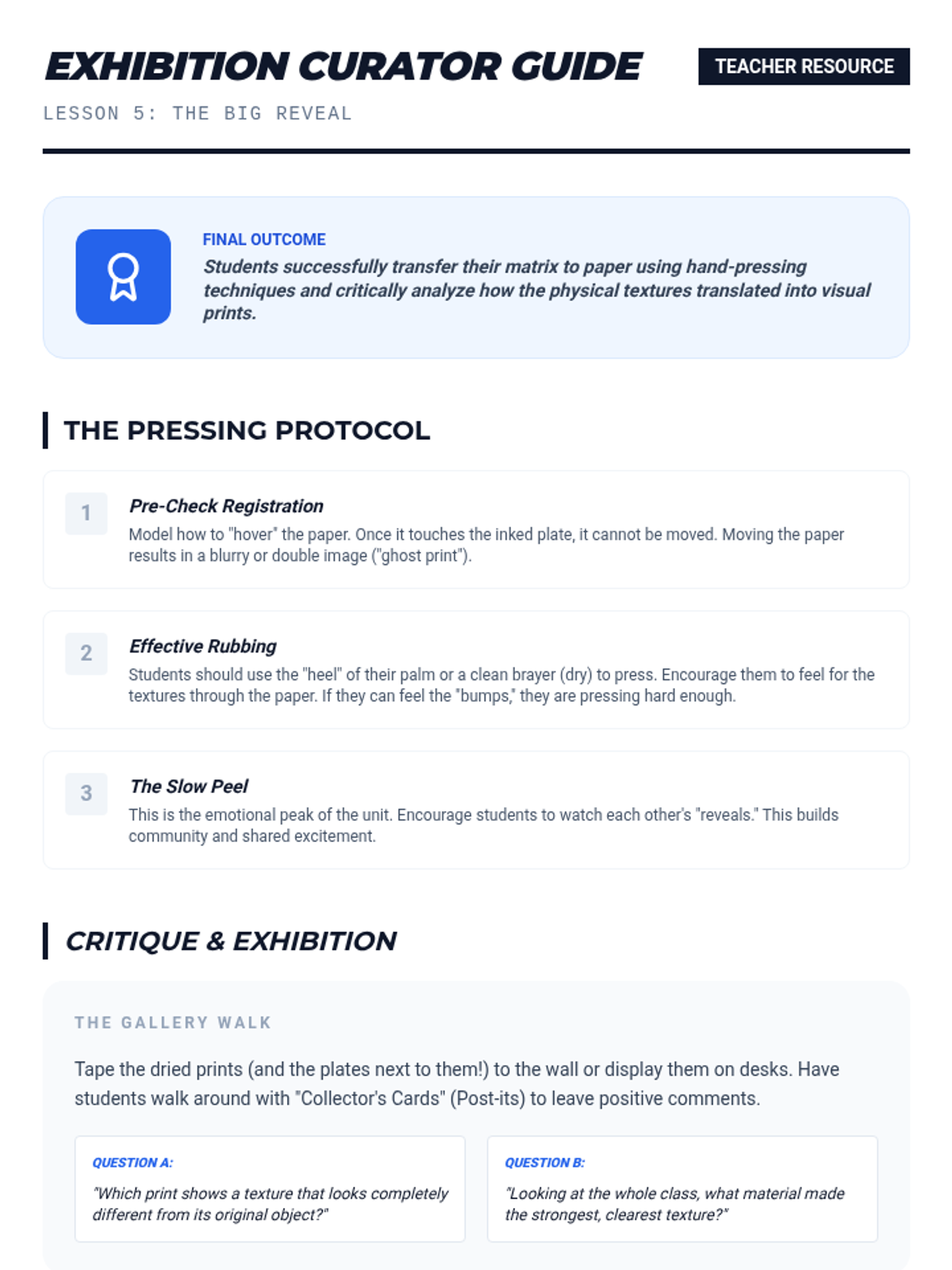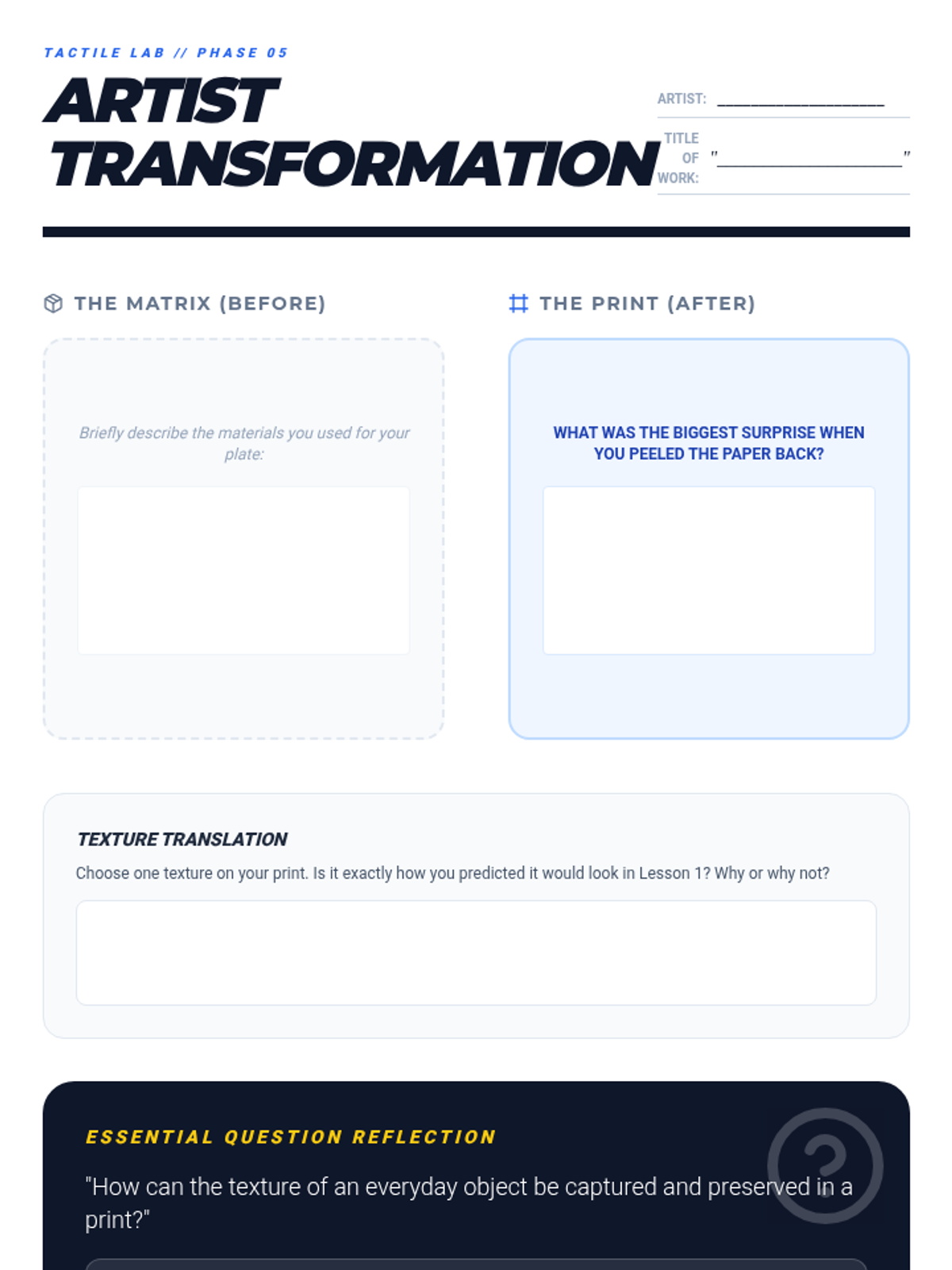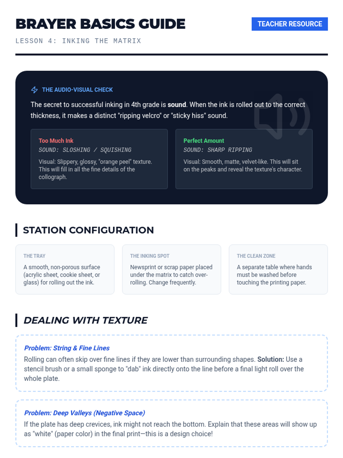 A 4th-grade printmaking unit where students transform found textures into complex printing plates. Through inquiry and experimentation, students explore collography by building, sealing, inking, and pressing tactile 'matrices'.