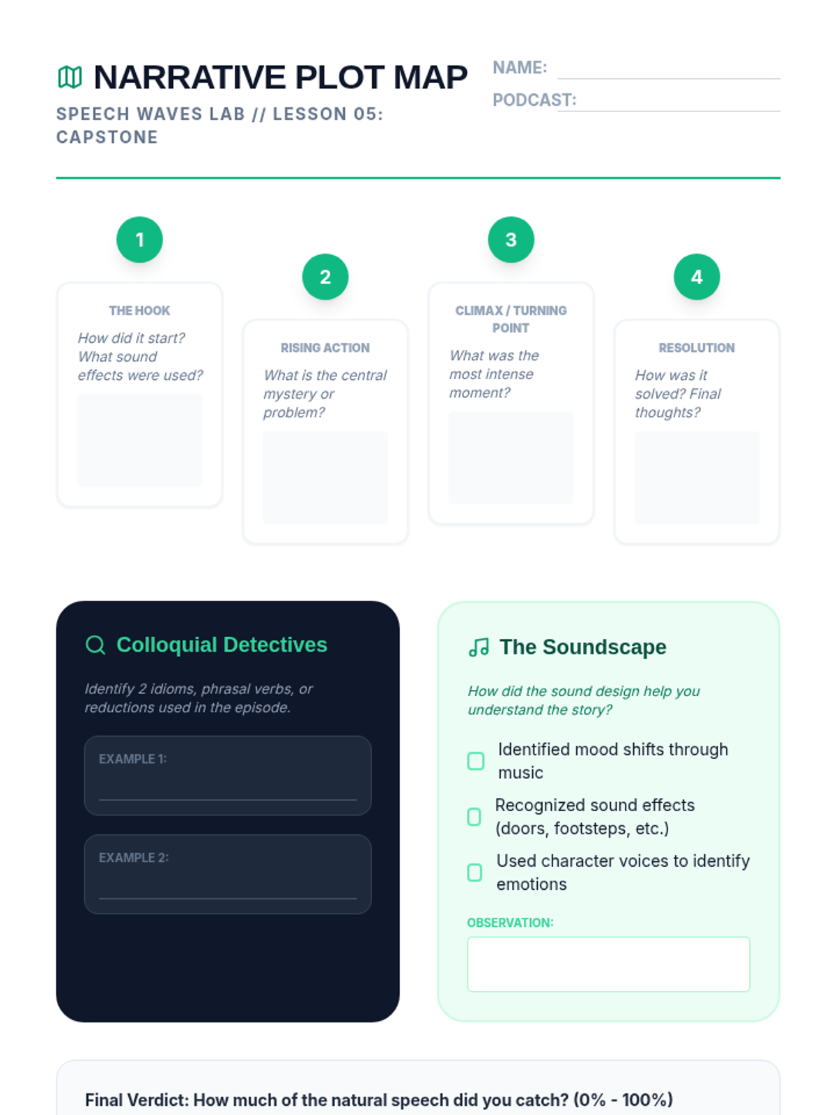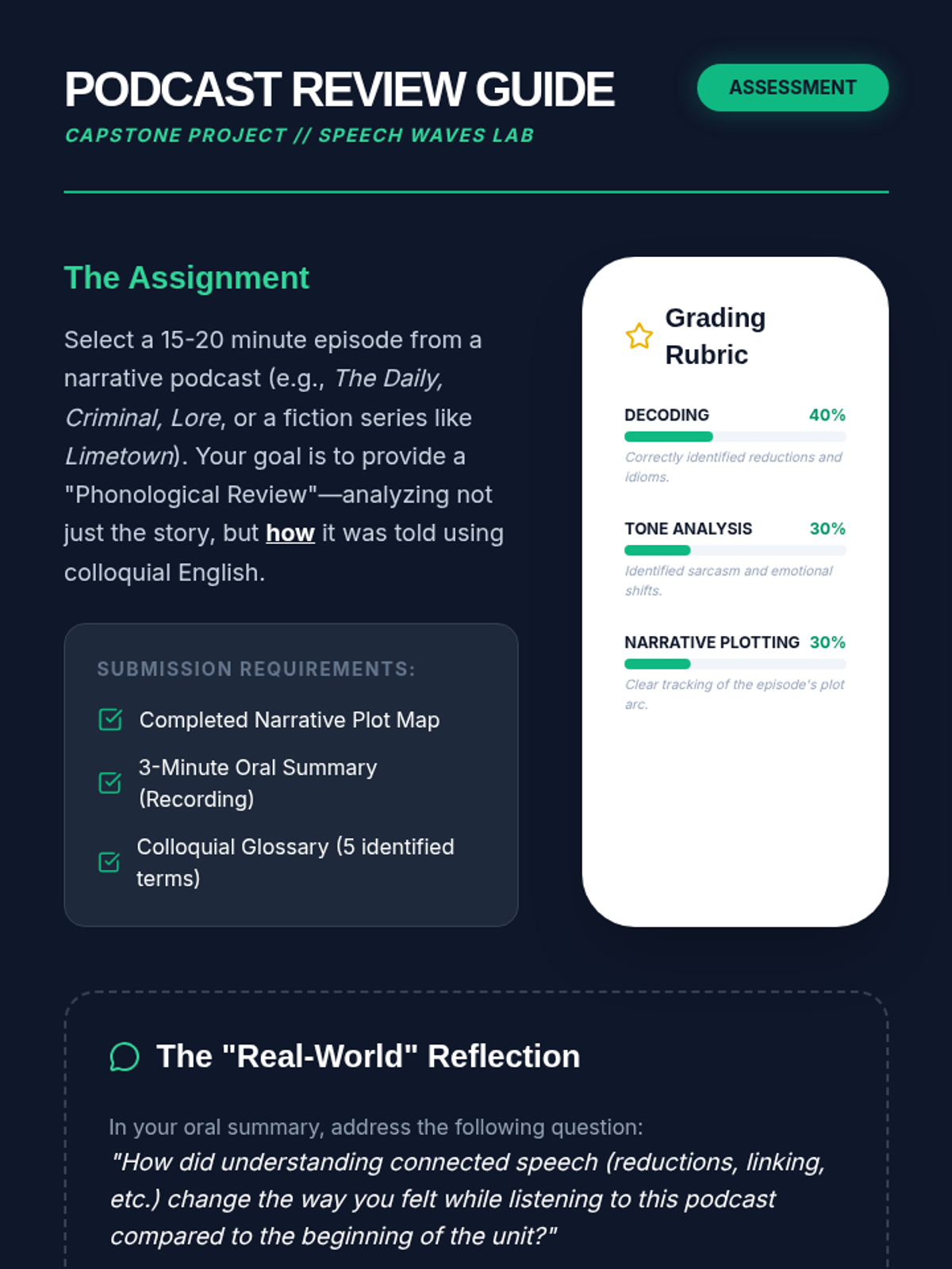 A comprehensive ESL sequence for 12th-grade intermediate students focusing on the phonological and cultural aspects of spoken English. Students will move from decoding individual sound reductions to analyzing complex narratives in podcasts, improving their ability to navigate real-world English environments.