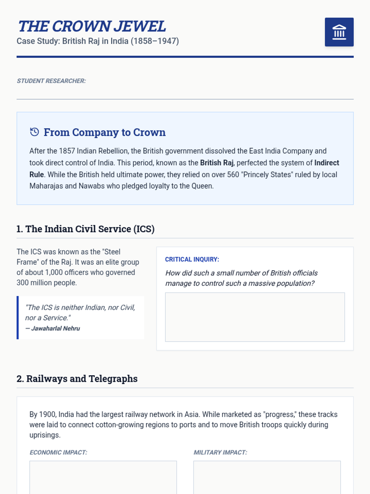 This sequence explores the administrative machinery of 19th and 20th-century imperialism, comparing British Indirect Rule and French Direct Rule through case studies of India, Nigeria, and Indochina. Students analyze the political, cultural, and economic impacts of these systems, culminating in a comparative analytical essay.