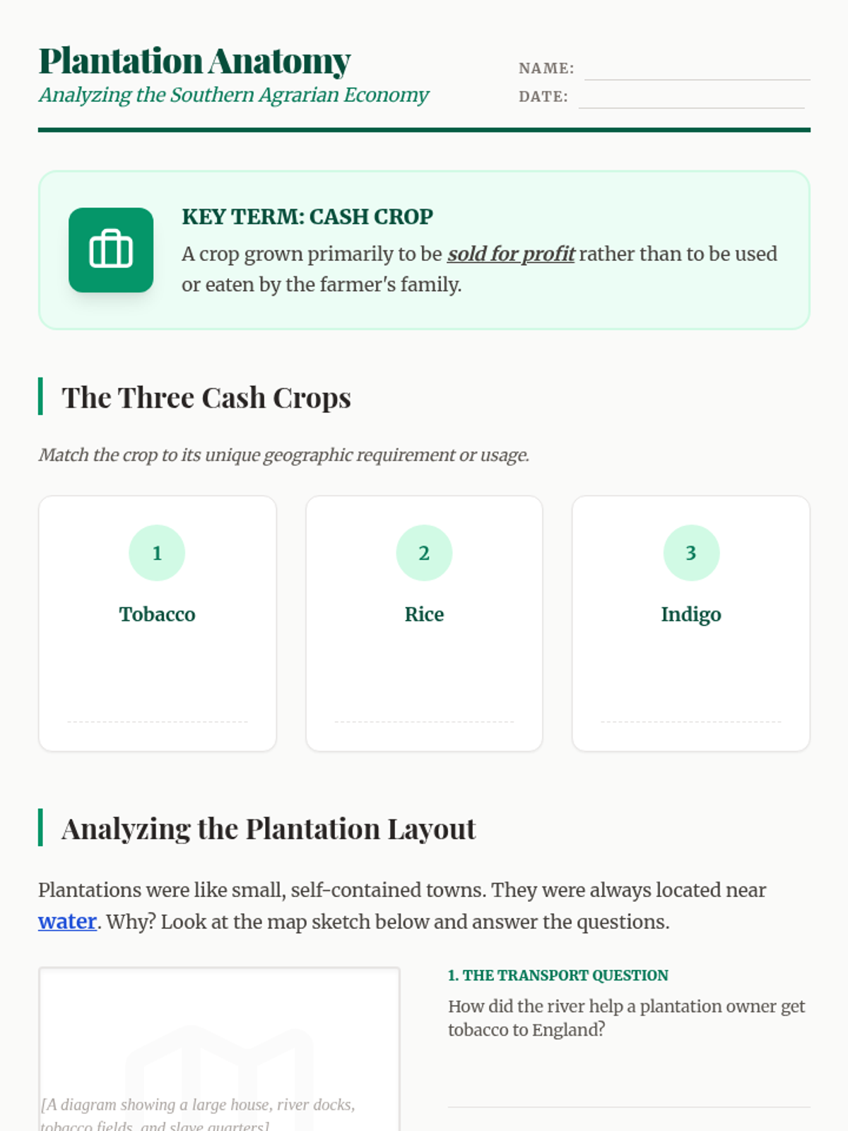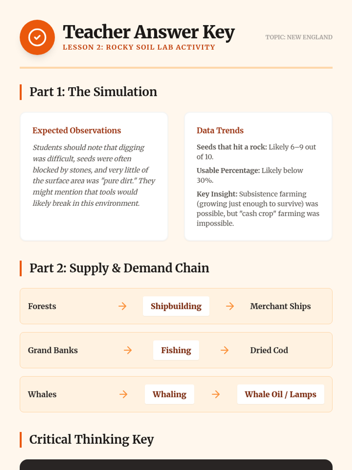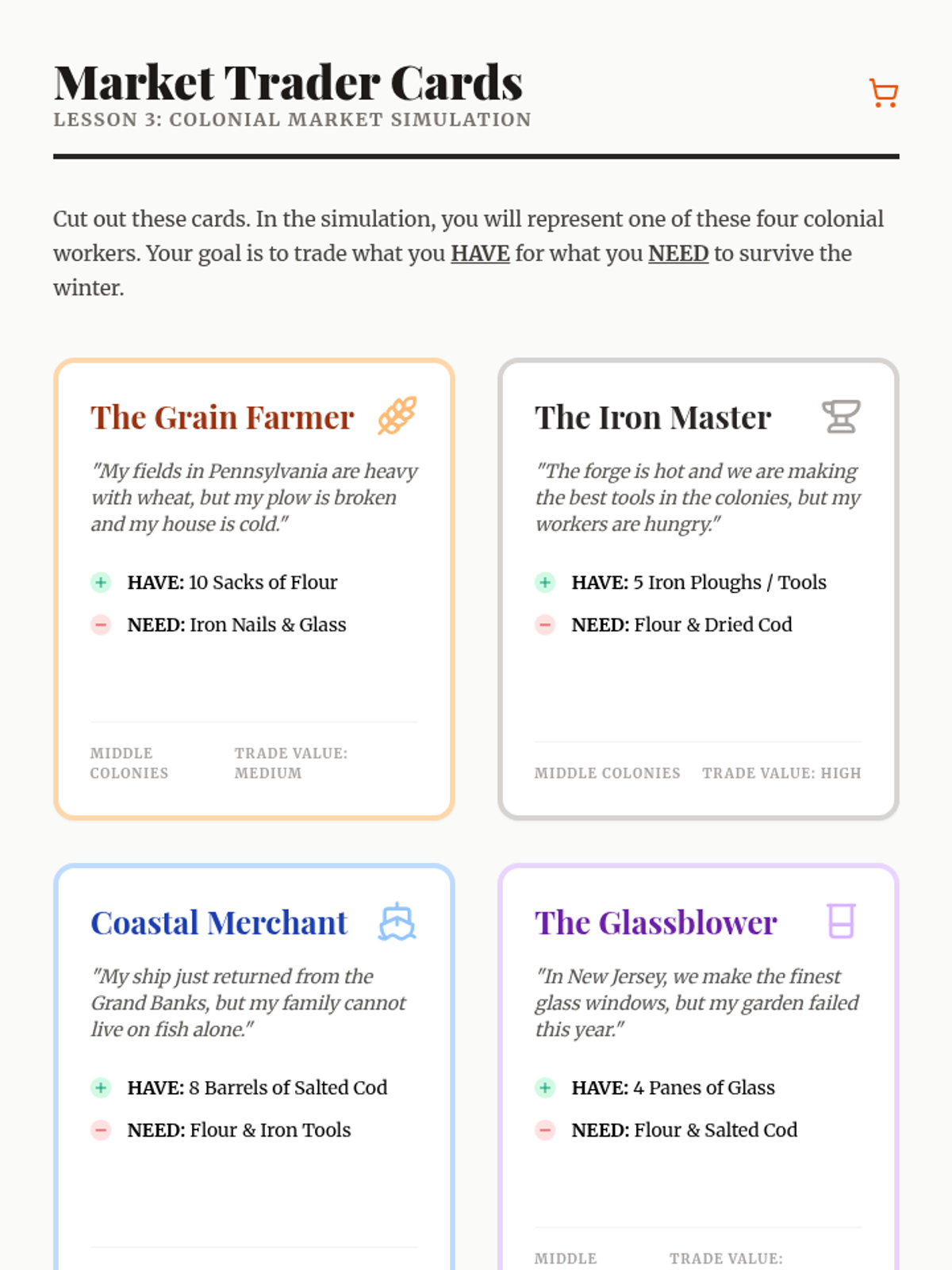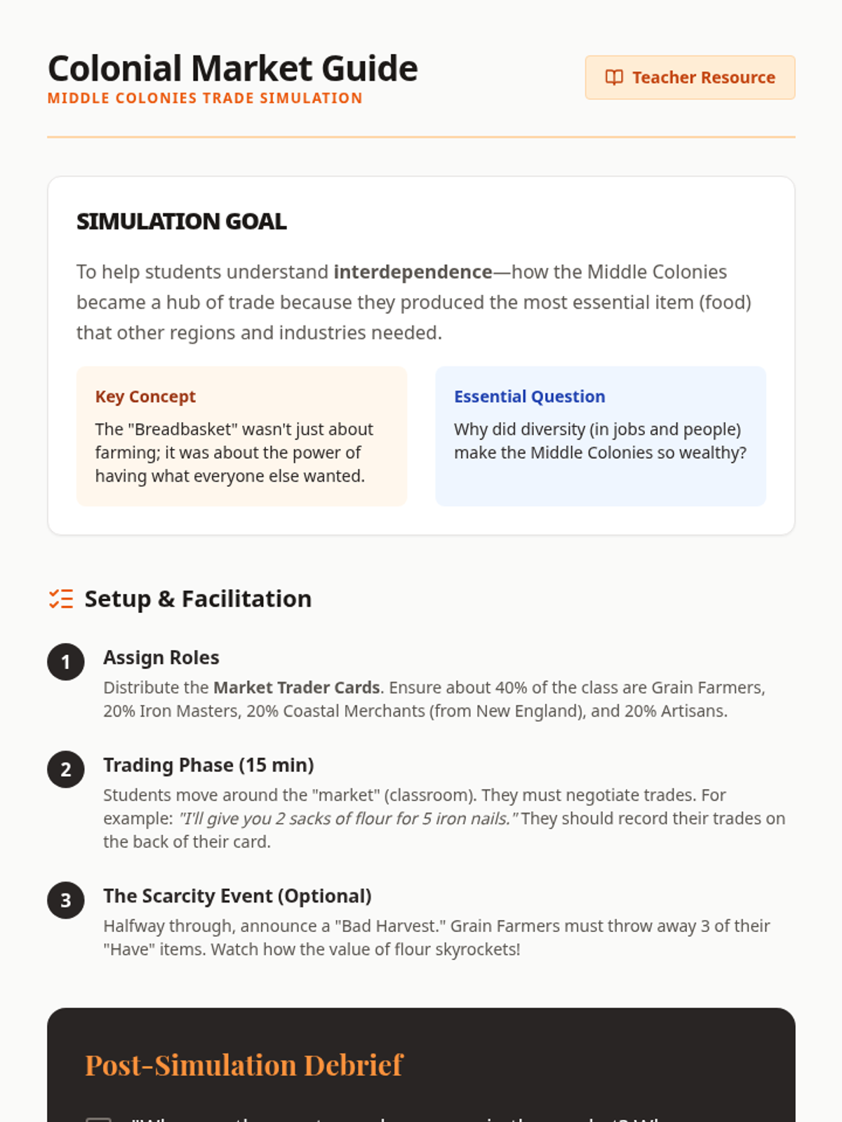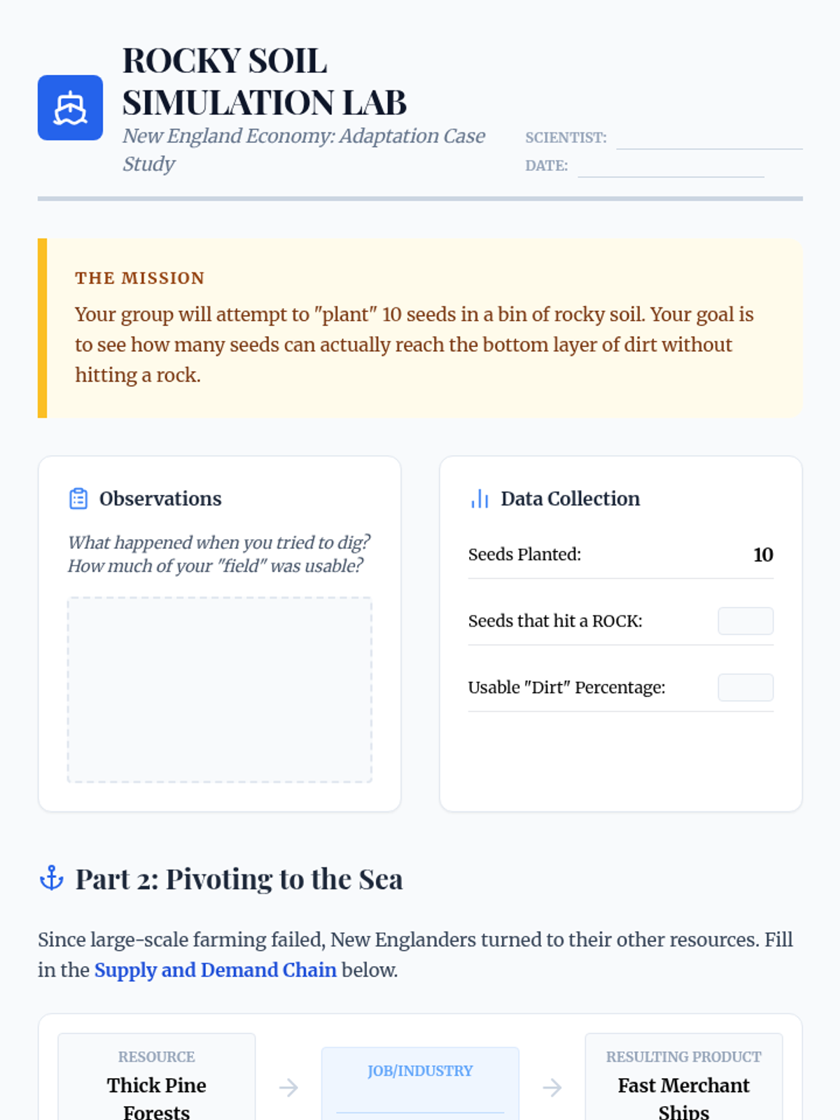 A comprehensive unit for 4th graders exploring how the geography and climate of the New England, Middle, and Southern colonies shaped their unique economies and ways of life. Through map analysis, simulations, and creative projects, students connect physical environments to human industry.