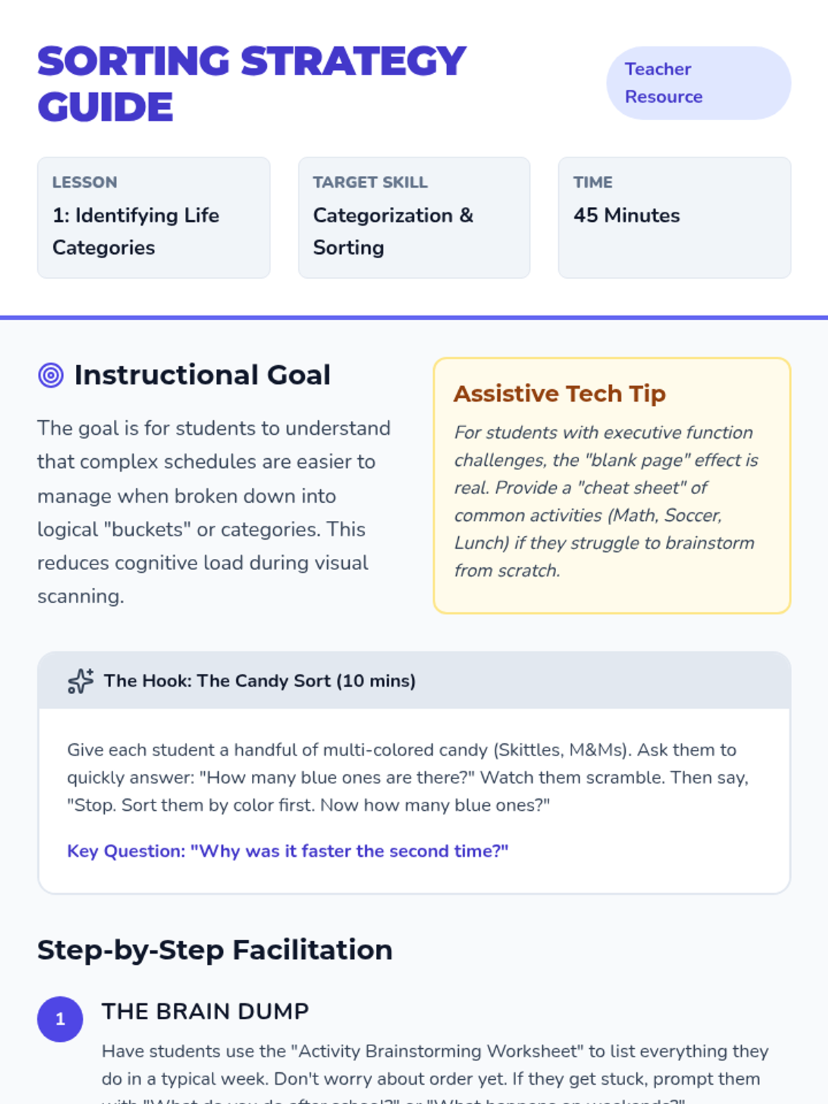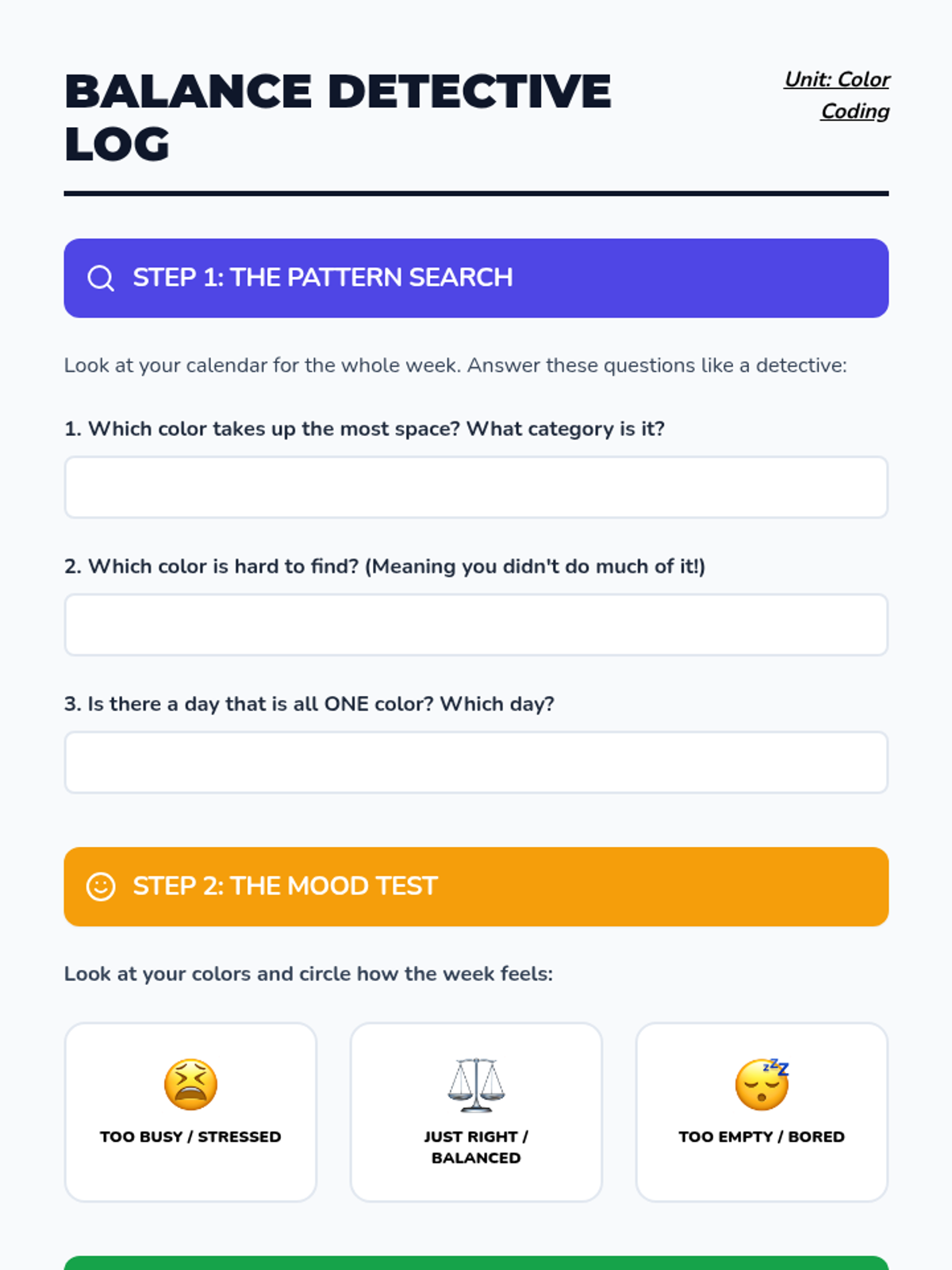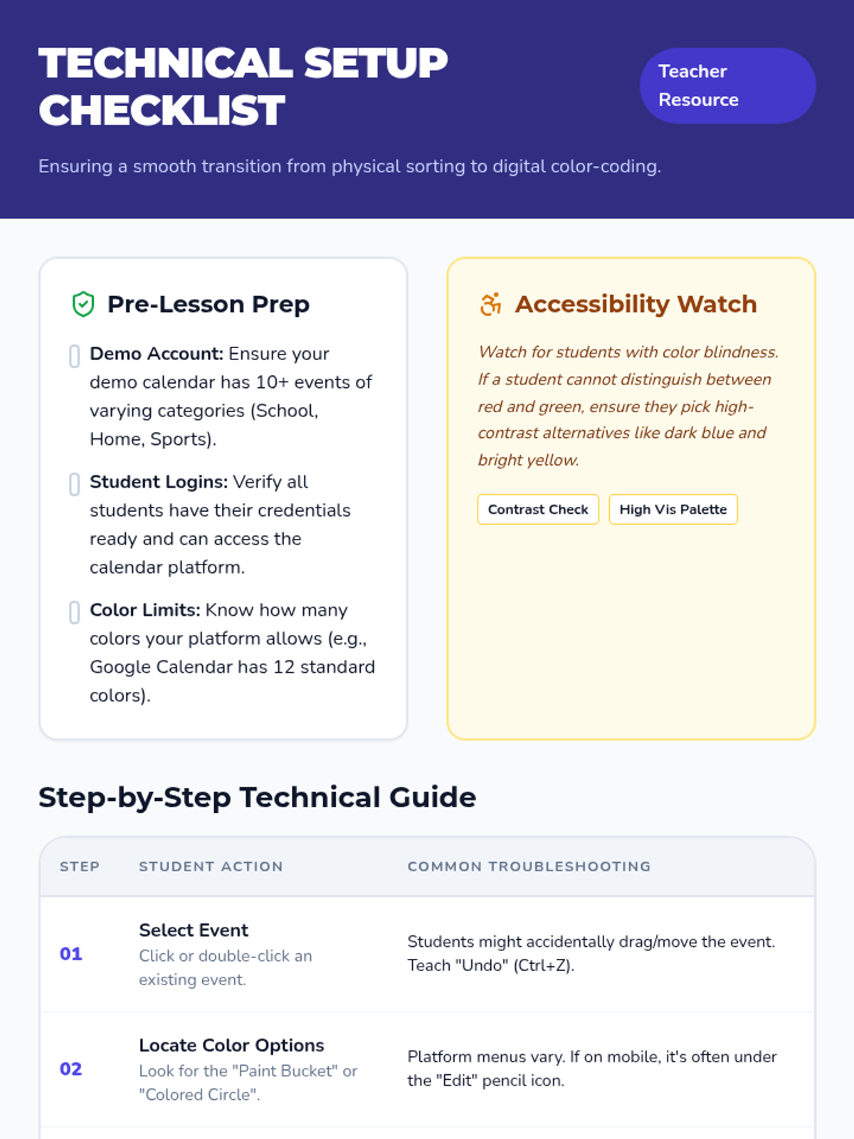 A 5-lesson sequence for 5th-grade students in Special Education, focusing on using color-coding and categorization within digital calendars to support executive function and visual processing. Students develop a personal organization system to manage their weekly activities and analyze their schedules for balance.