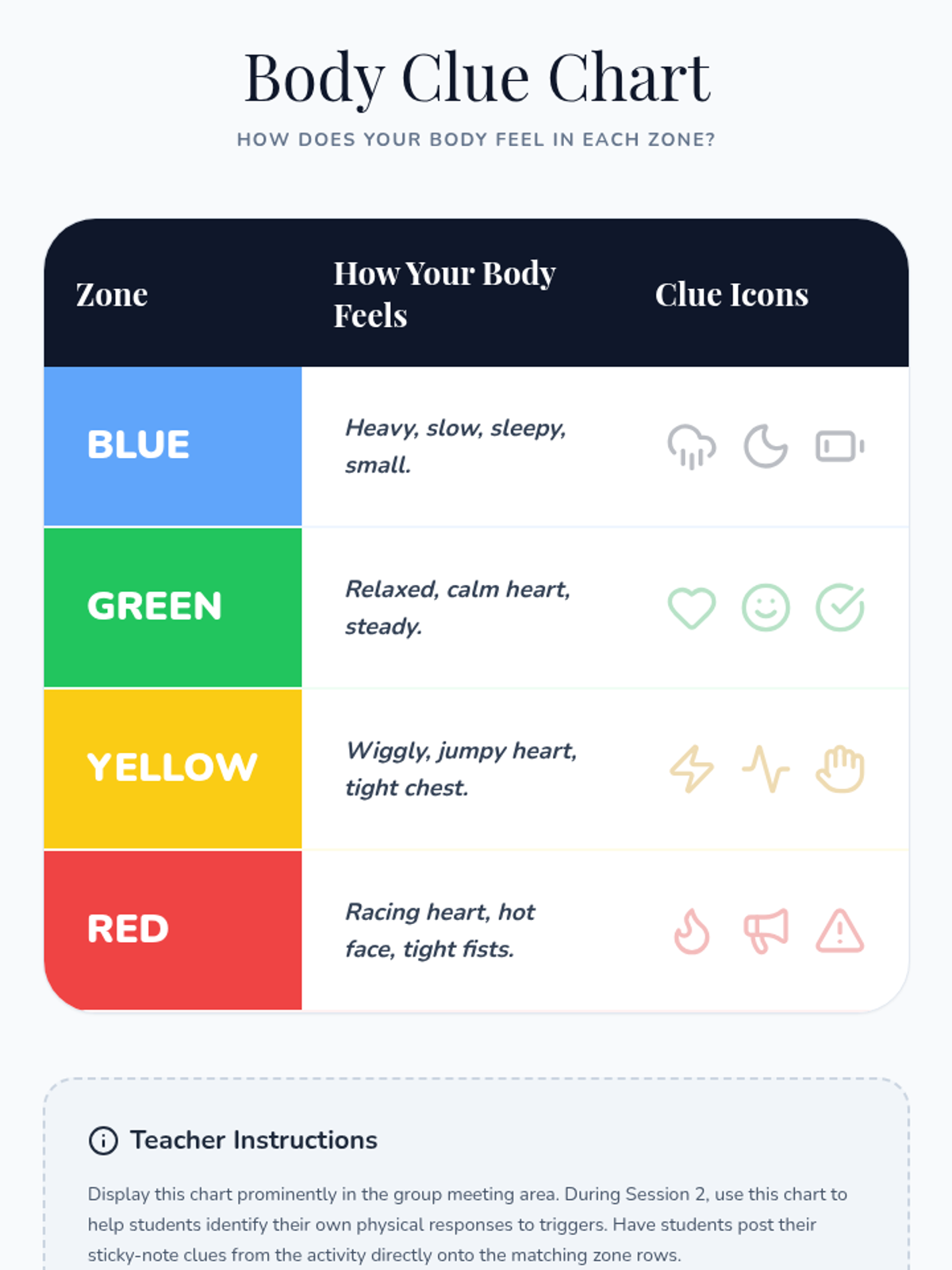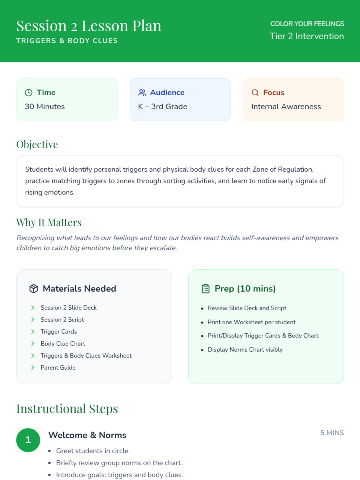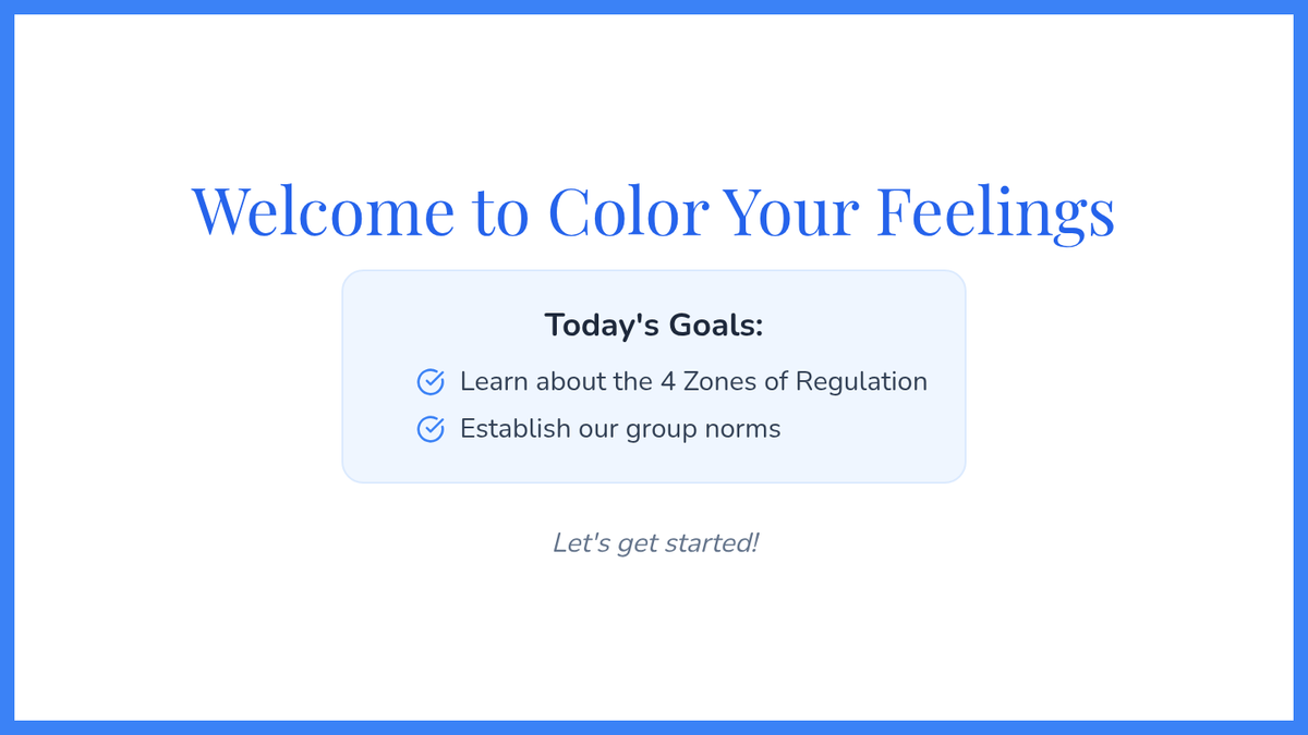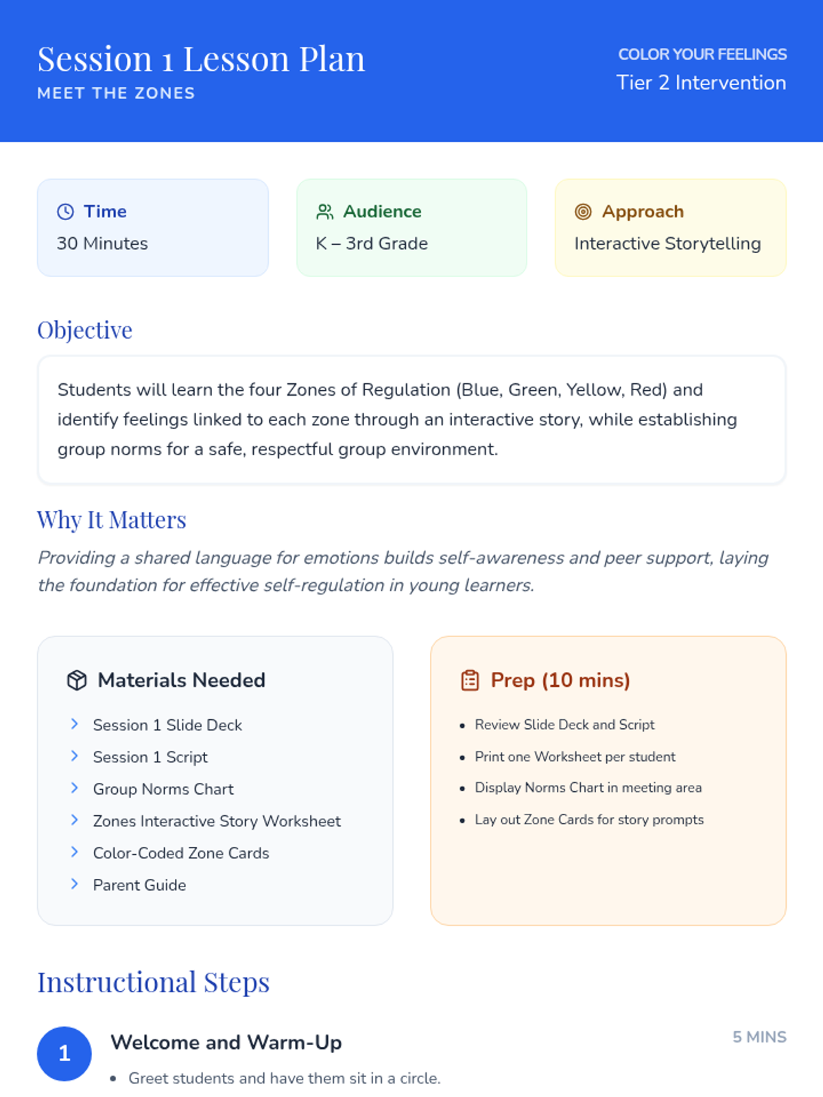 An 8-session Zones of Regulation group intervention for K–3 students focusing on identifying emotions, understanding zones, and developing self-regulation skills. This Tier 2 small-group series builds emotional vocabulary, teaches coping strategies, and fosters peer support.