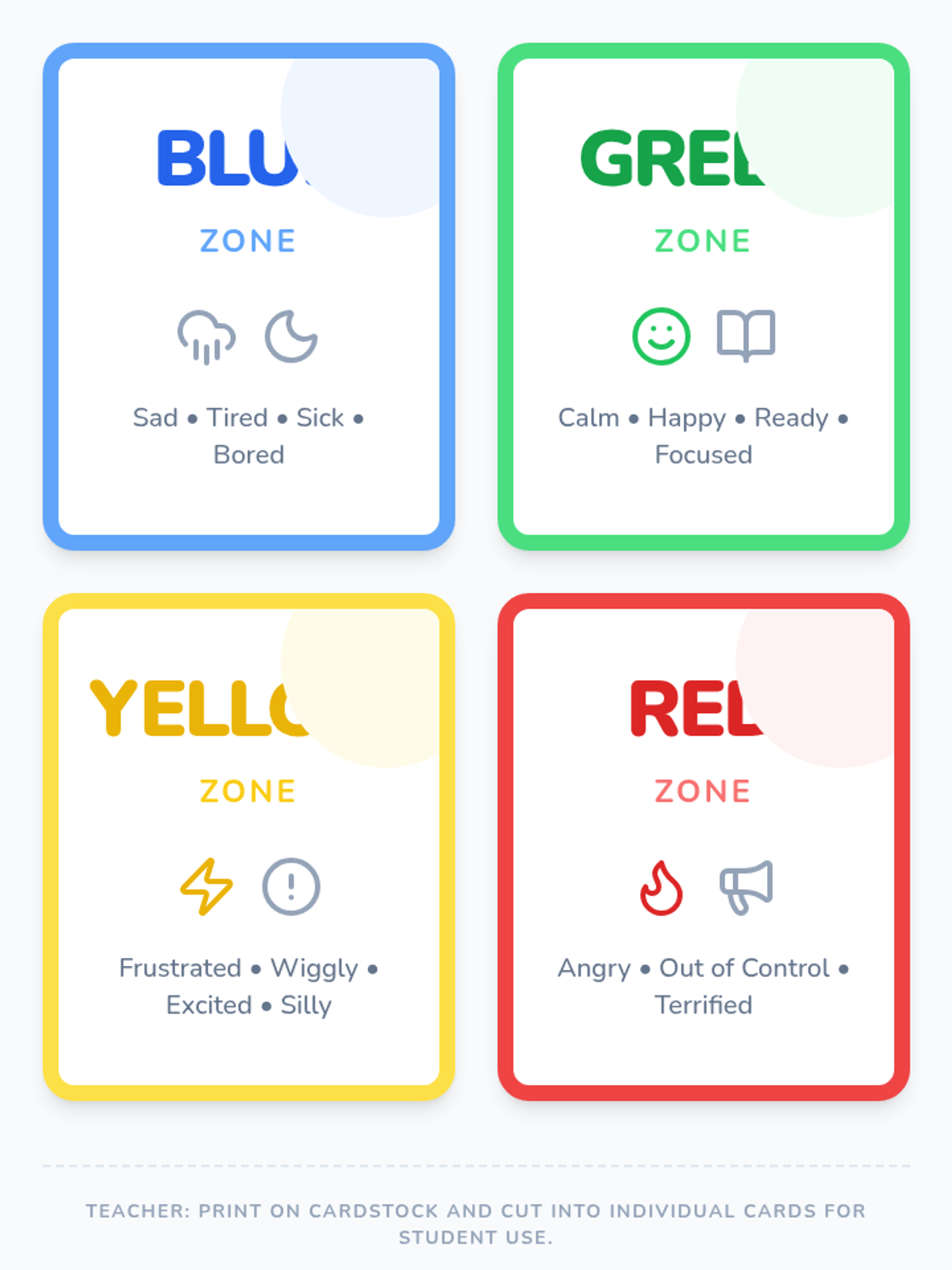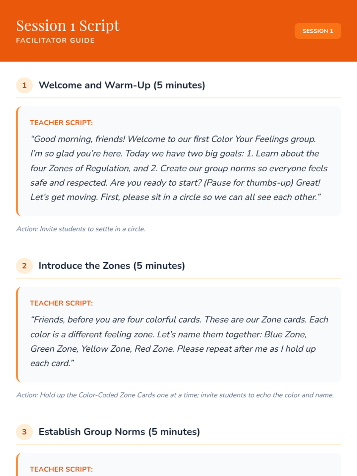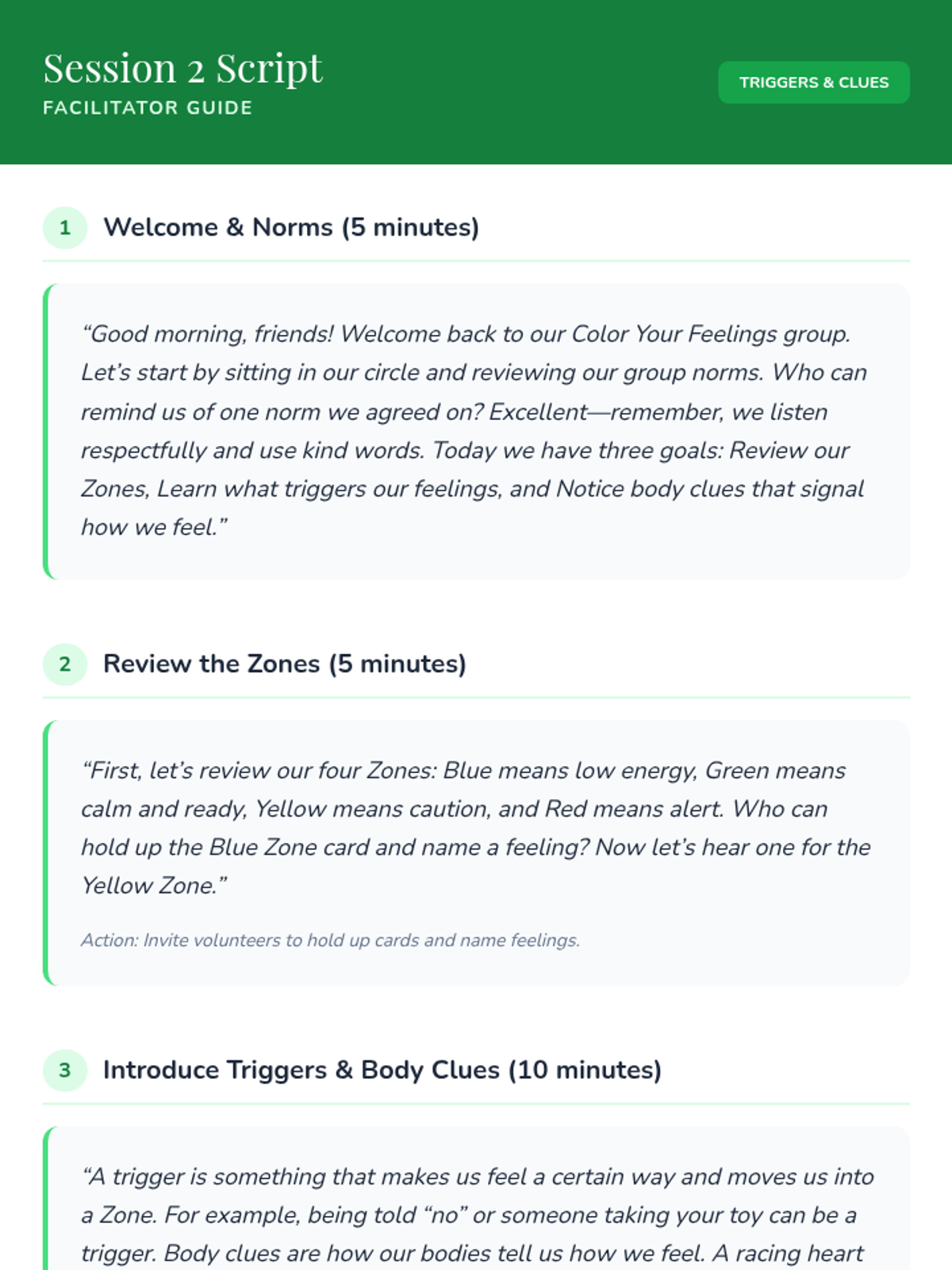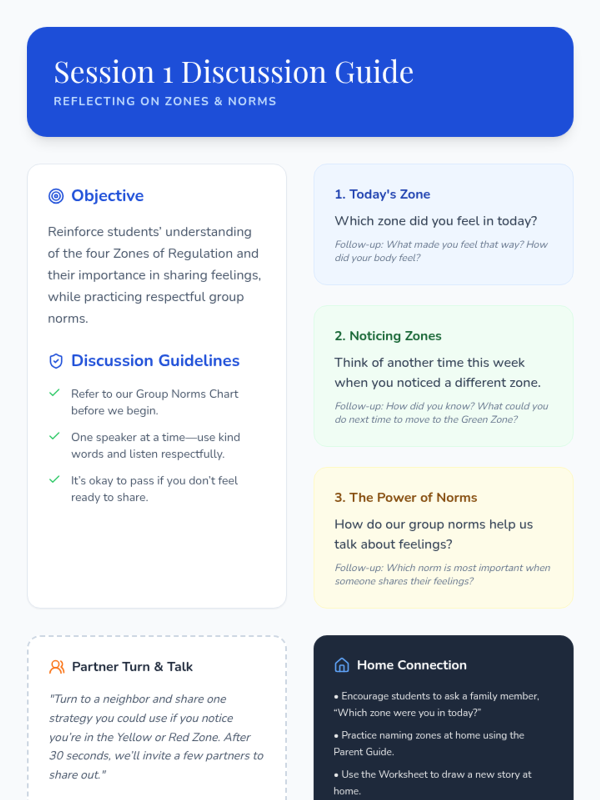 An 8-session Zones of Regulation group intervention for K–3 students focusing on identifying emotions, understanding zones, and developing self-regulation skills. This Tier 2 small-group series builds emotional vocabulary, teaches coping strategies, and fosters peer support.