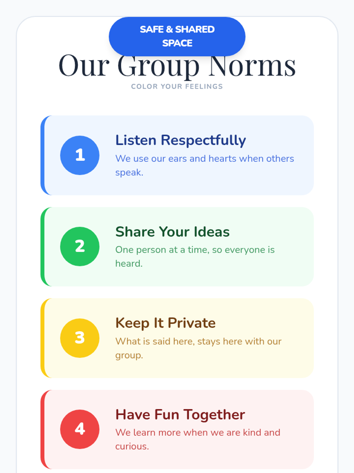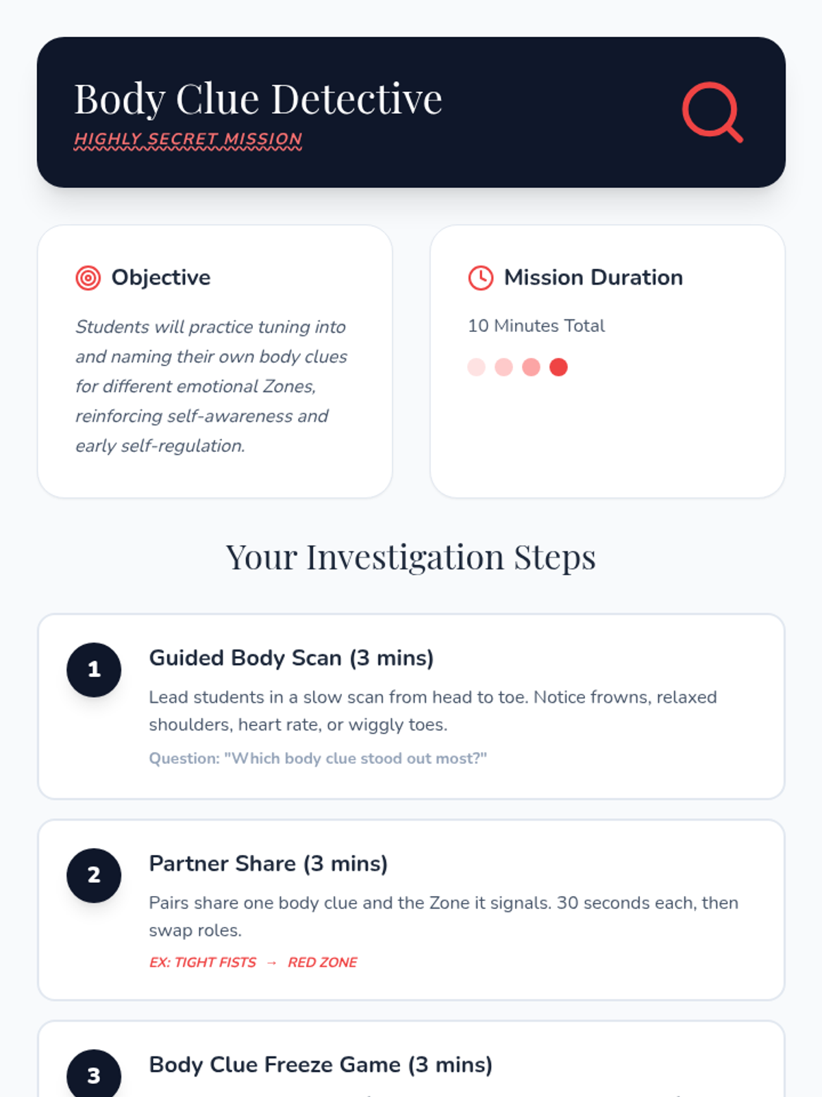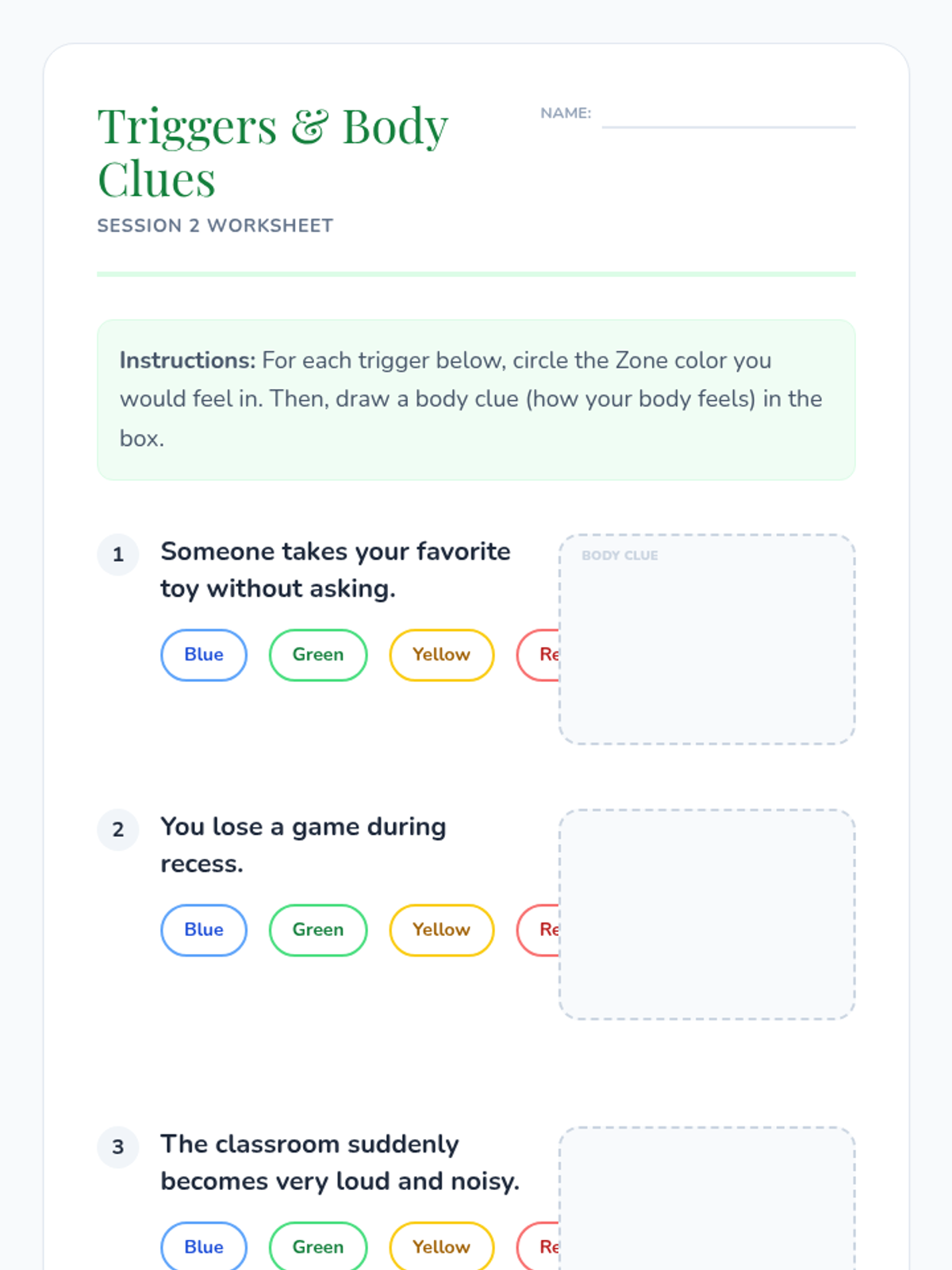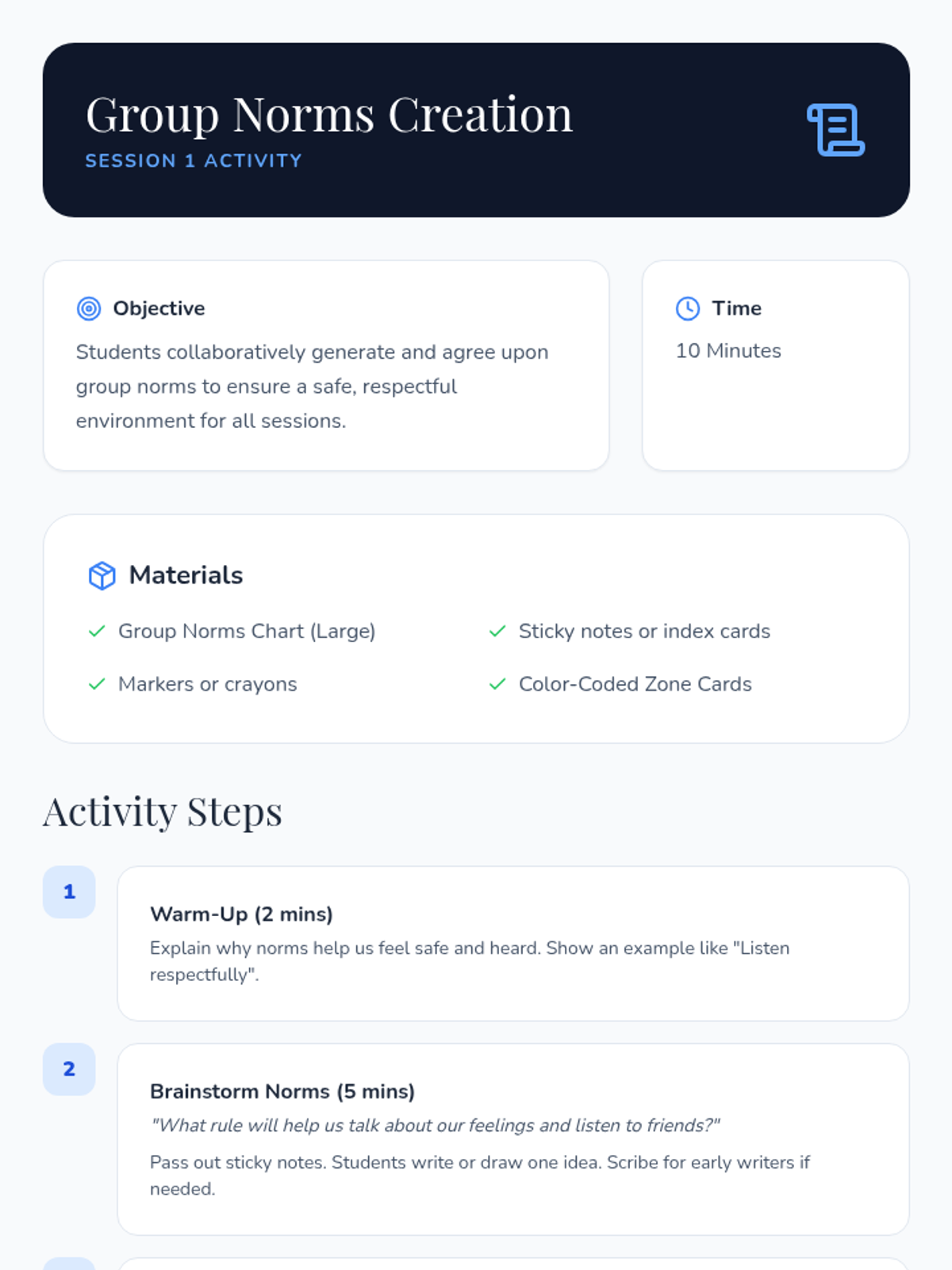 An 8-session Zones of Regulation group intervention for K–3 students focusing on identifying emotions, understanding zones, and developing self-regulation skills. This Tier 2 small-group series builds emotional vocabulary, teaches coping strategies, and fosters peer support.
