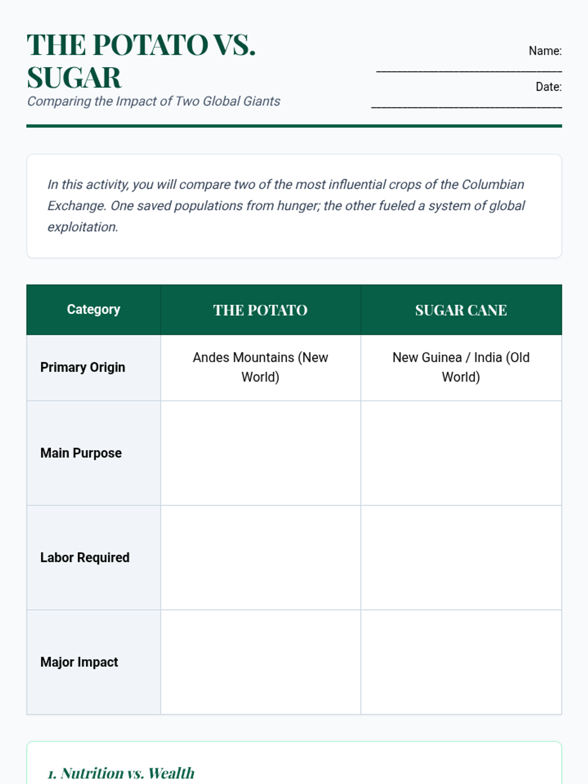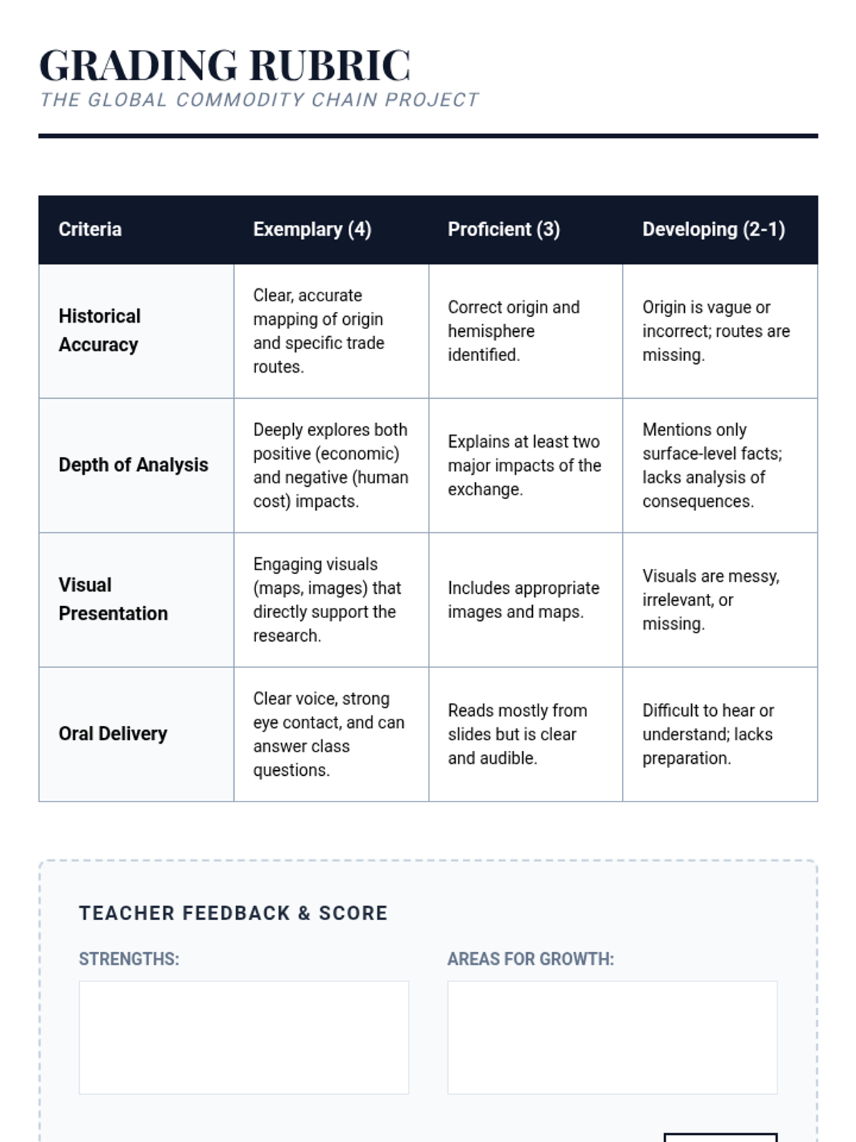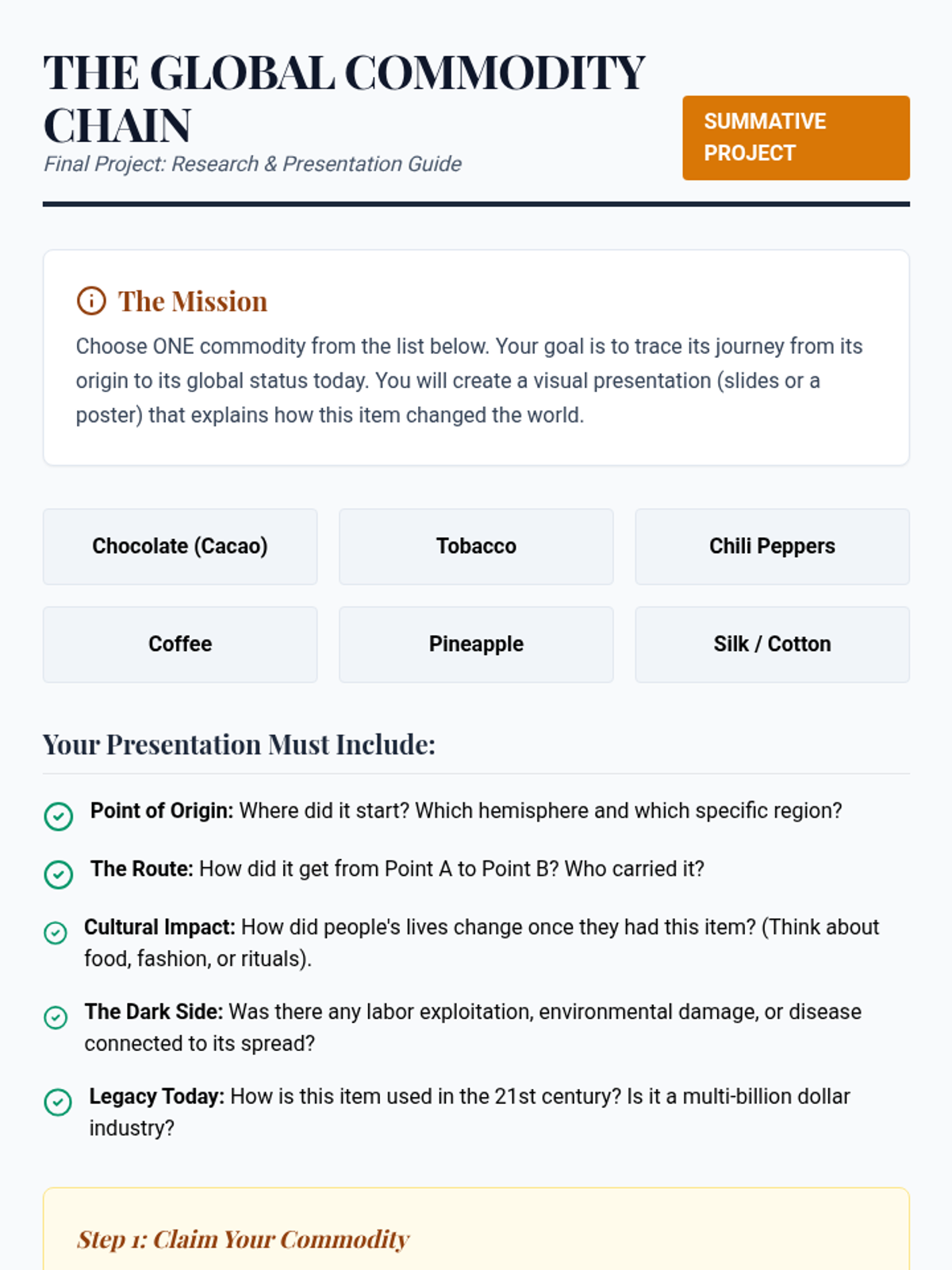 This project-based sequence explores the biological and cultural transfers of the Columbian Exchange, investigating how the movement of plants, animals, diseases, and ideas transformed global ecosystems and human societies. Students analyze demographic shifts, agricultural changes, and ecological transformations before concluding with a research project on a specific global commodity.
