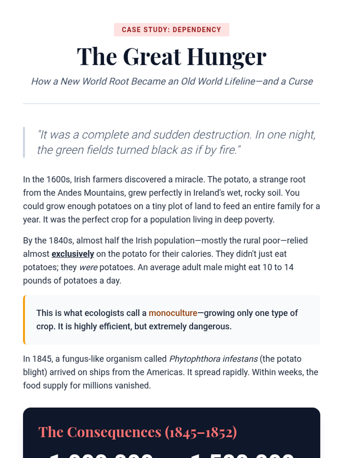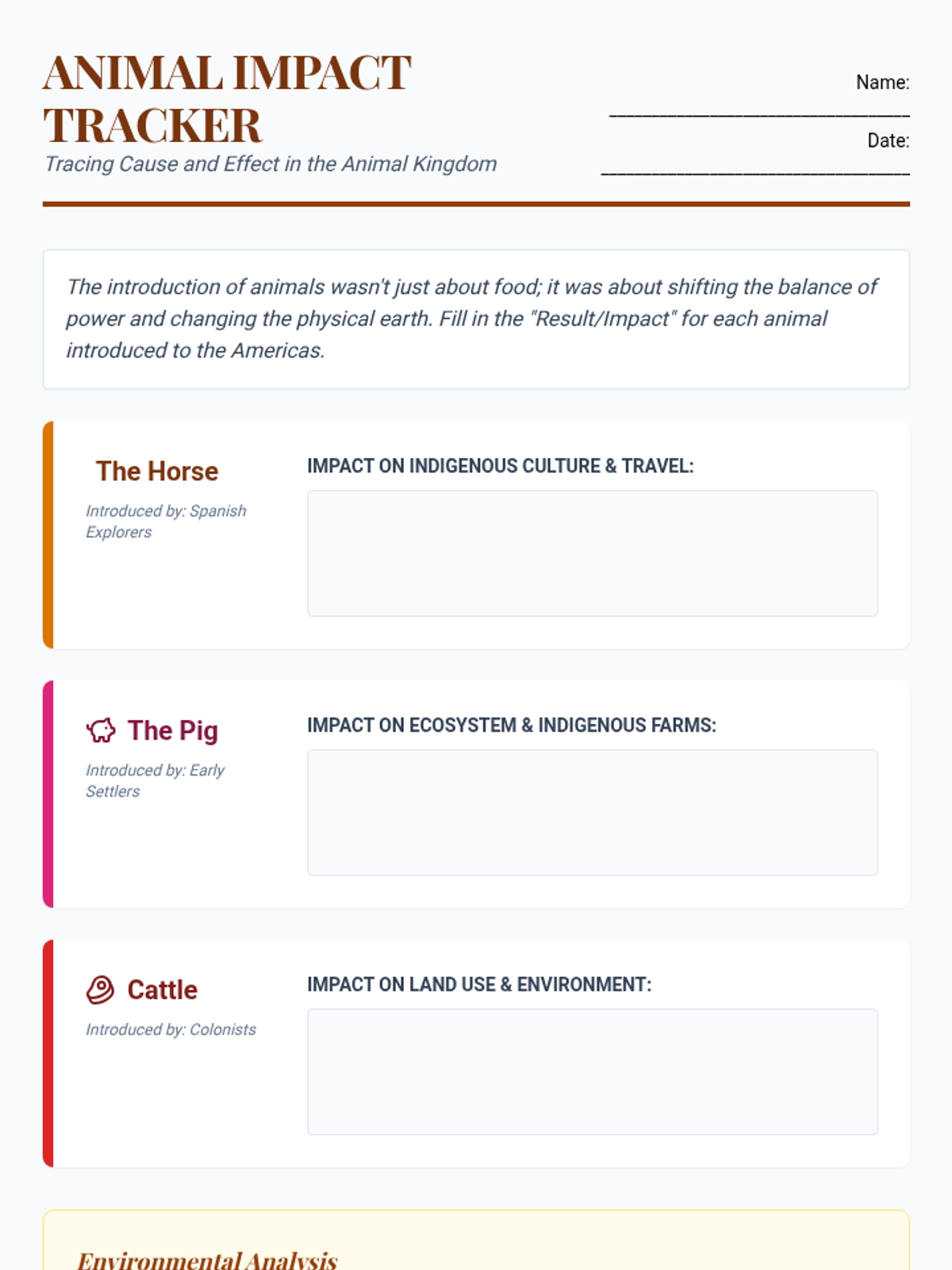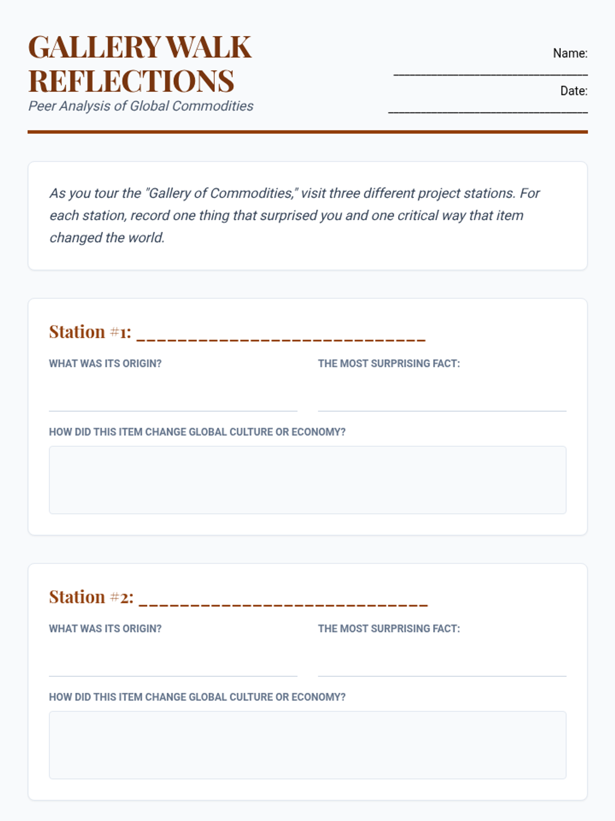 This project-based sequence explores the biological and cultural transfers of the Columbian Exchange, investigating how the movement of plants, animals, diseases, and ideas transformed global ecosystems and human societies. Students analyze demographic shifts, agricultural changes, and ecological transformations before concluding with a research project on a specific global commodity.