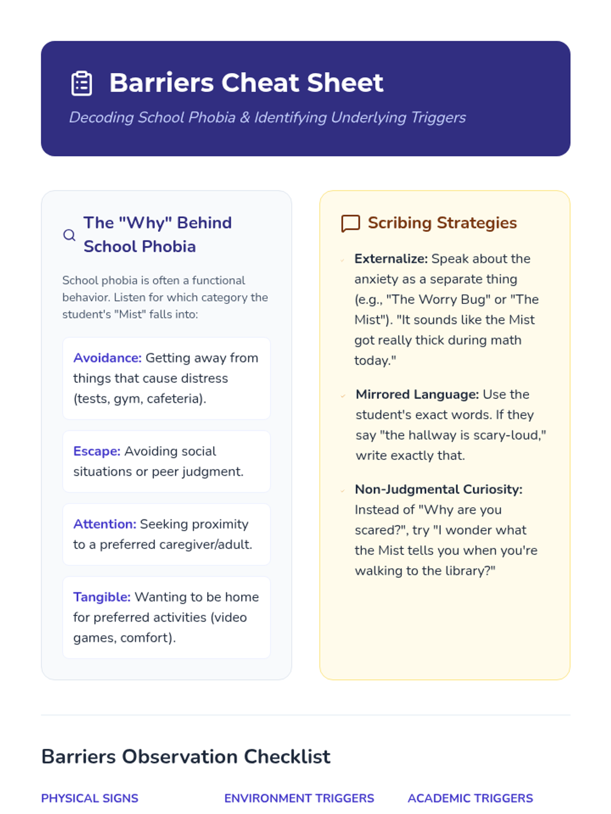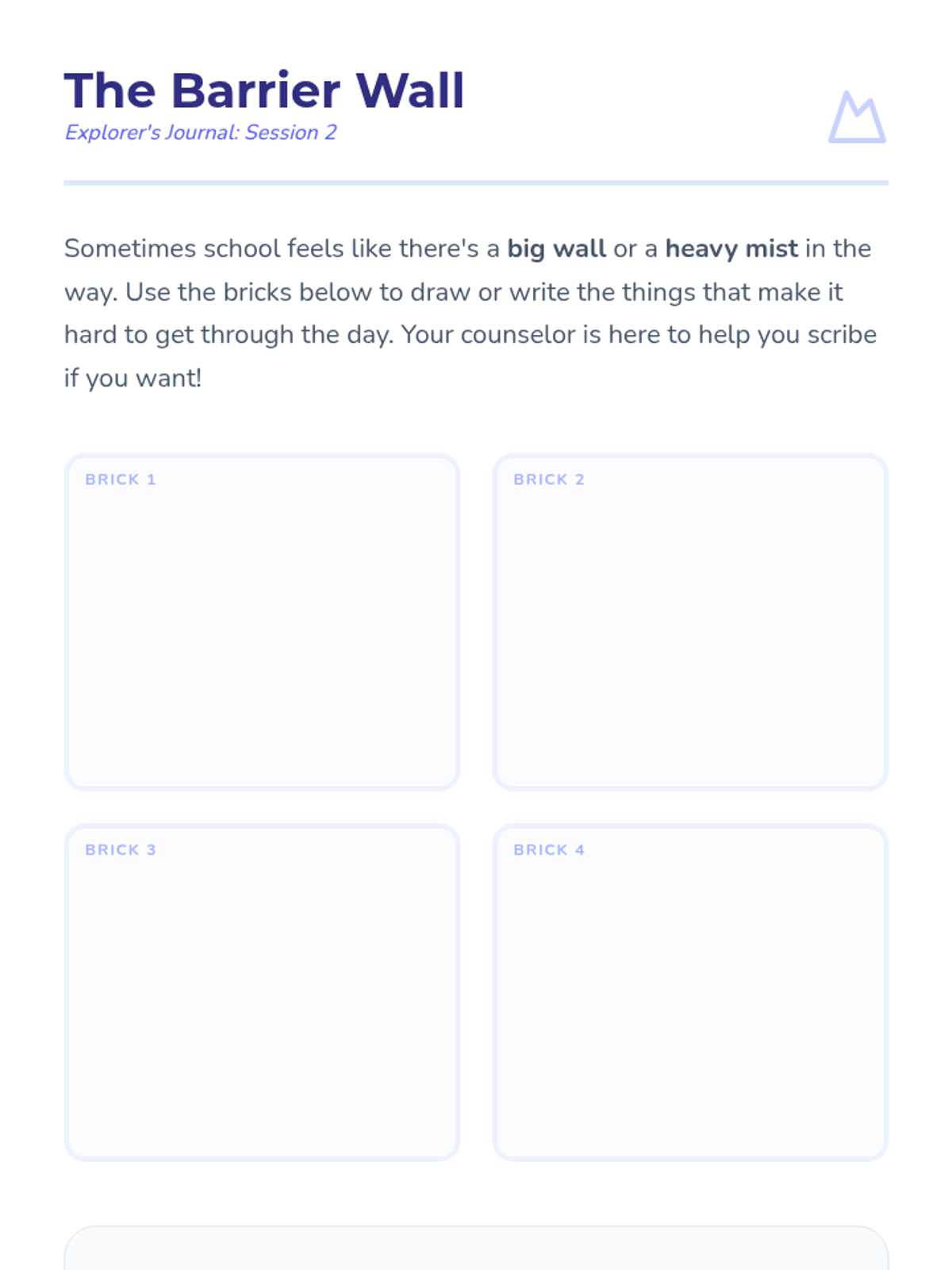 A specialized counseling sequence for 4th-grade students experiencing school phobia and anxiety. This Tier 3 1:1 intervention focuses on rapport building, identifying specific barriers to school attendance, and developing personal coping strategies to increase the student's sense of safety in diverse environments.