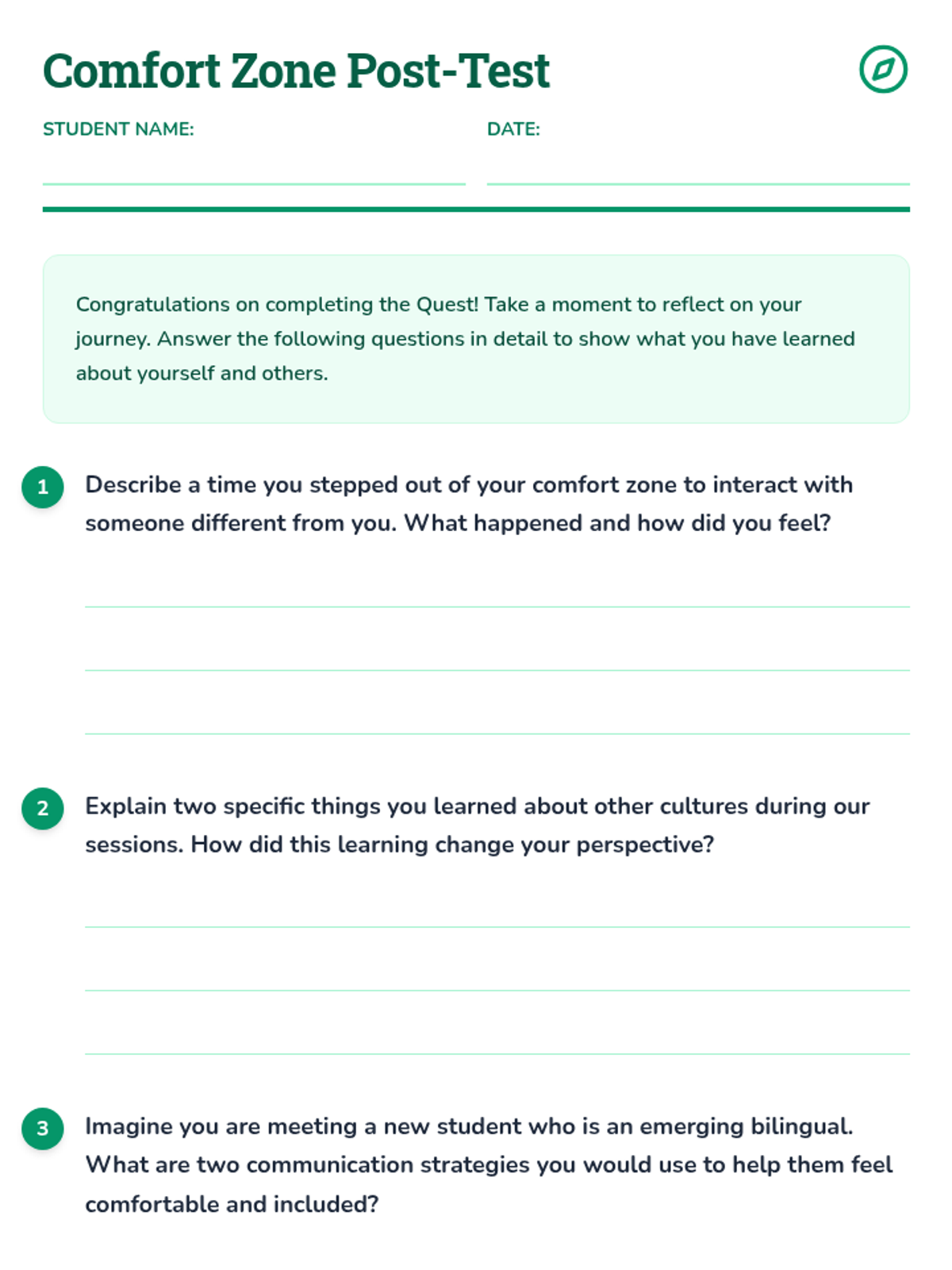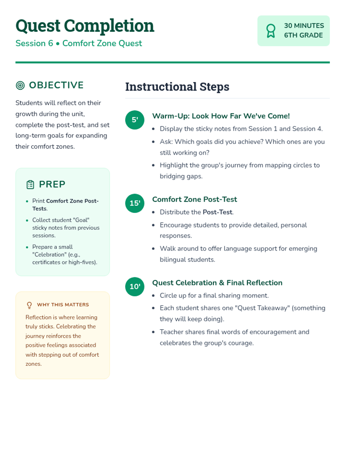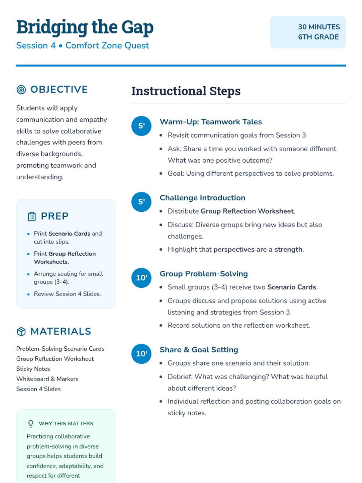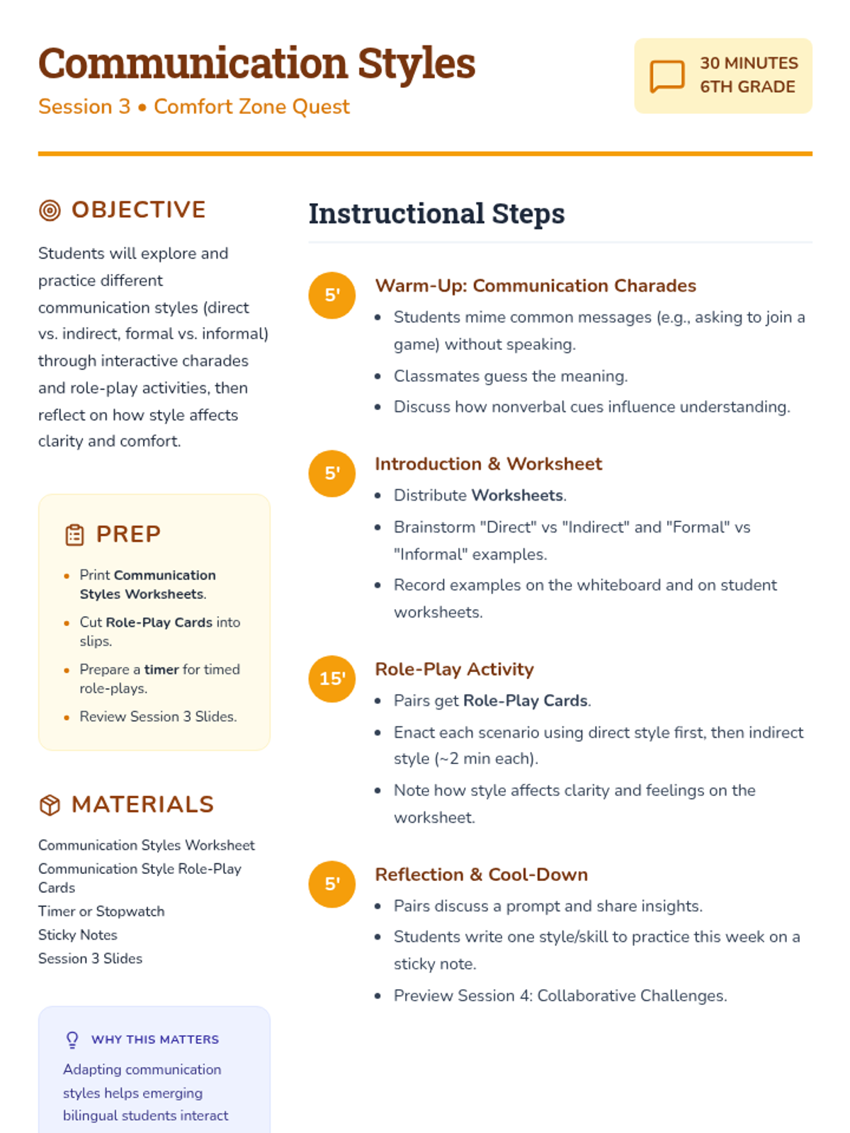 A six-session unit for 6th grade emerging bilingual students to explore comfort zones, cultural awareness, and communication skills through collaborative activities.