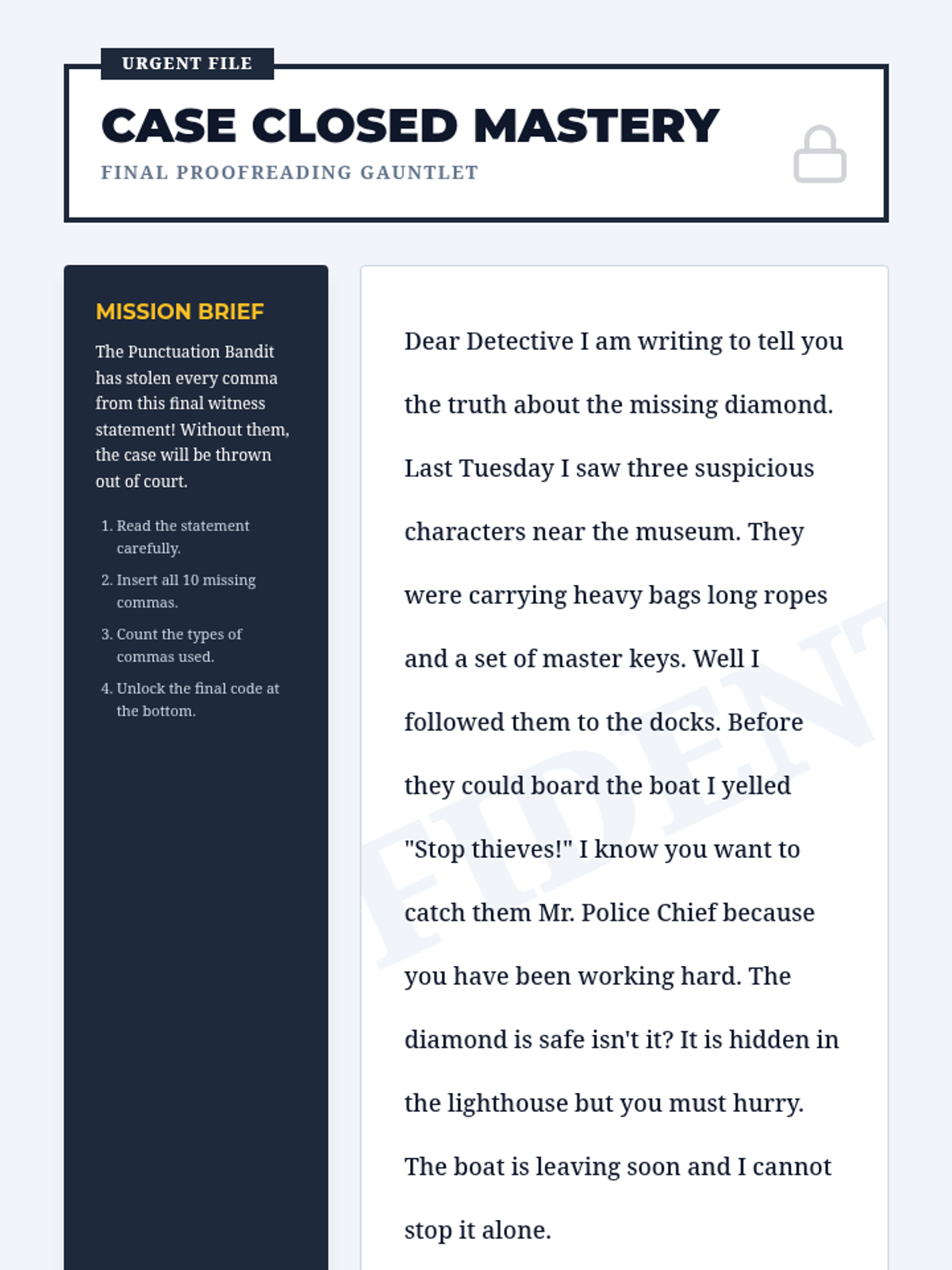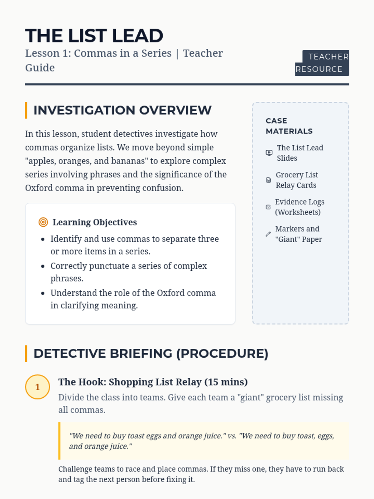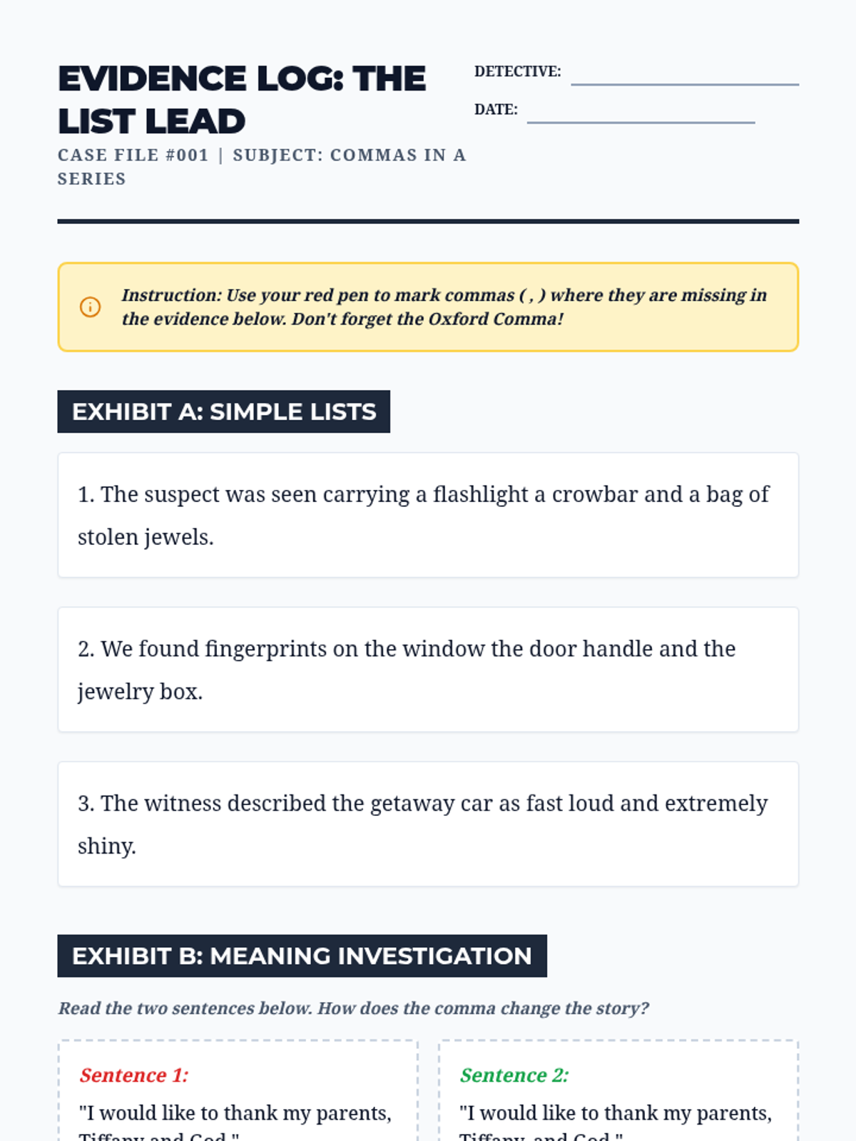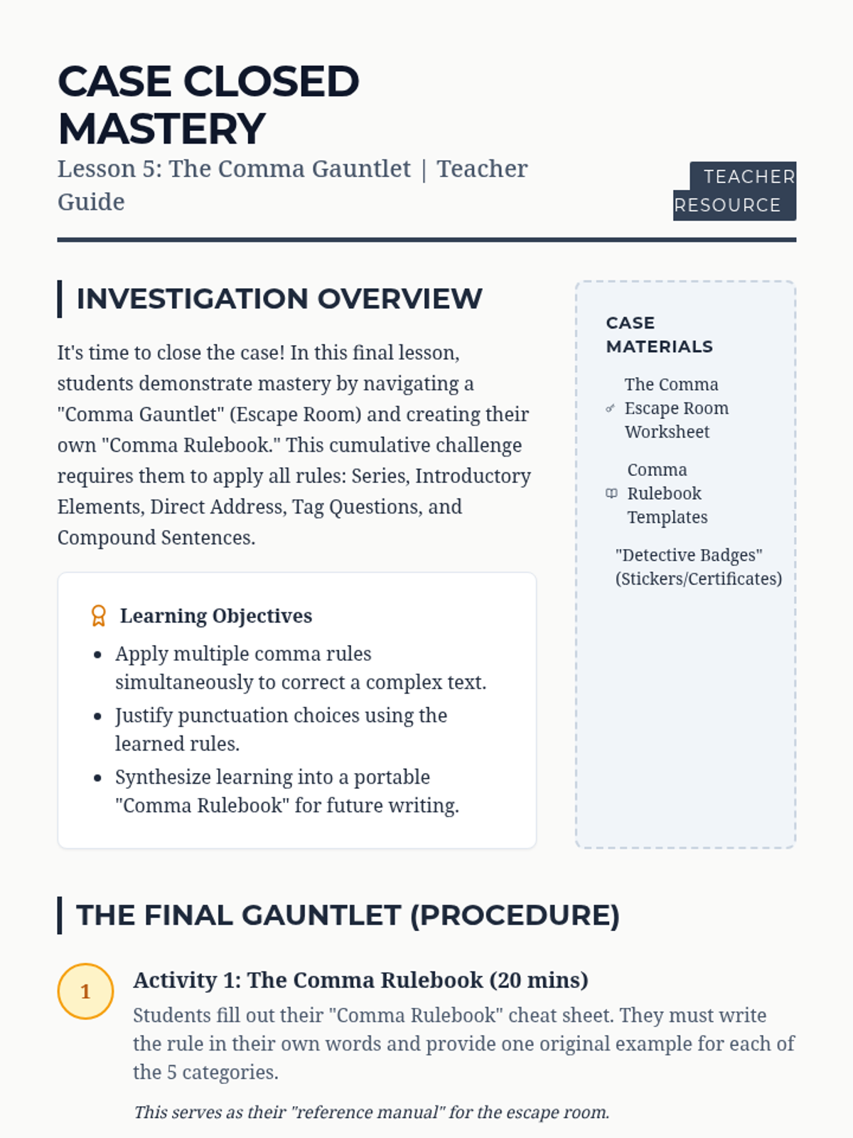 A detective-themed grammar unit where 5th graders solve 'Comma Case Files'. Students master advanced comma usage—including series, introductory elements, direct address, and compound sentences—through gamified challenges to create a final 'Comma Rulebook' for clear communication.