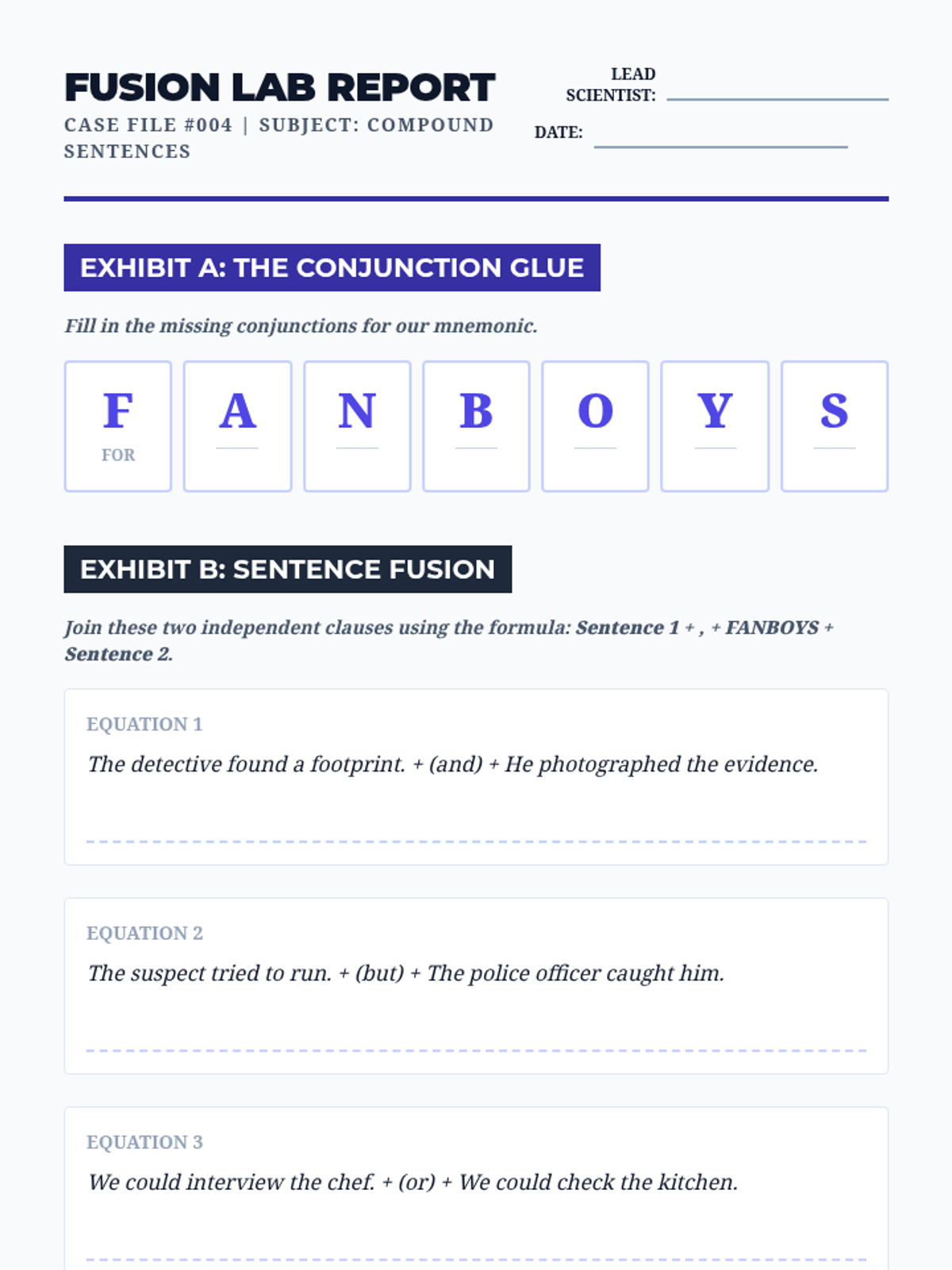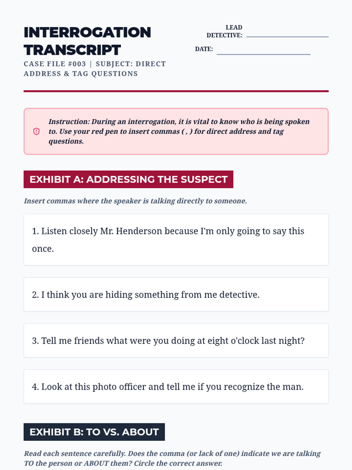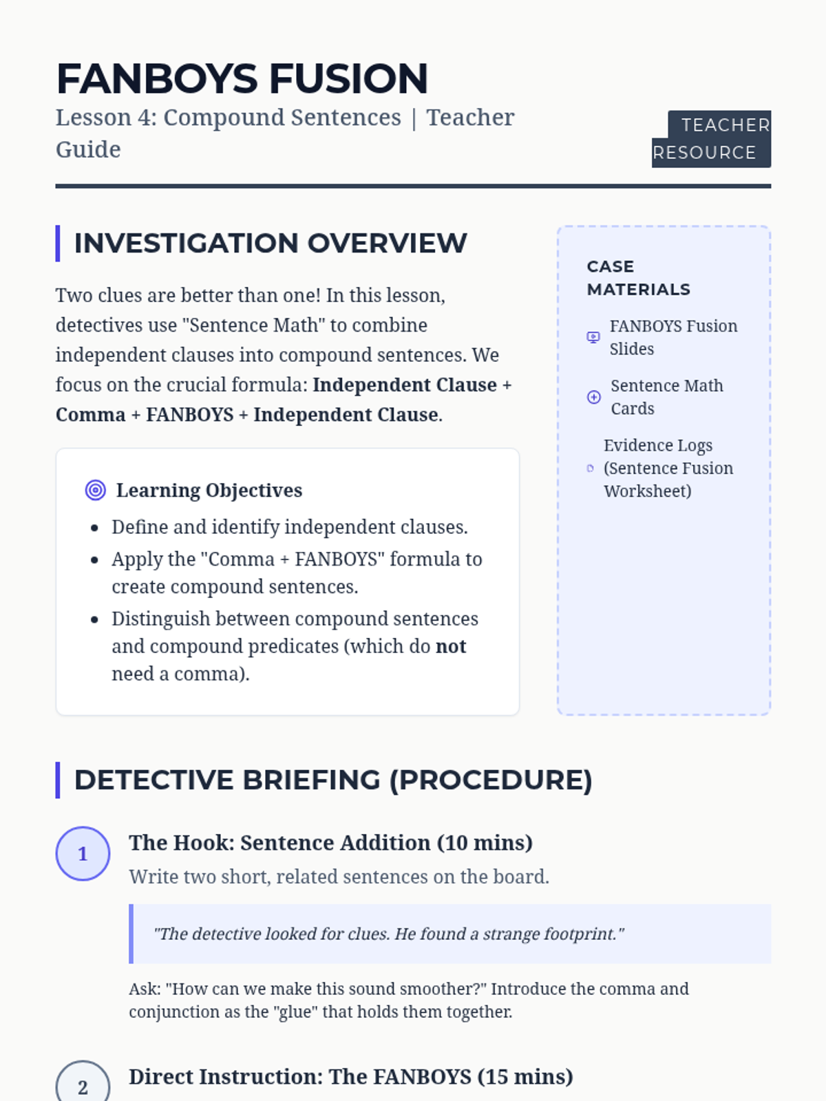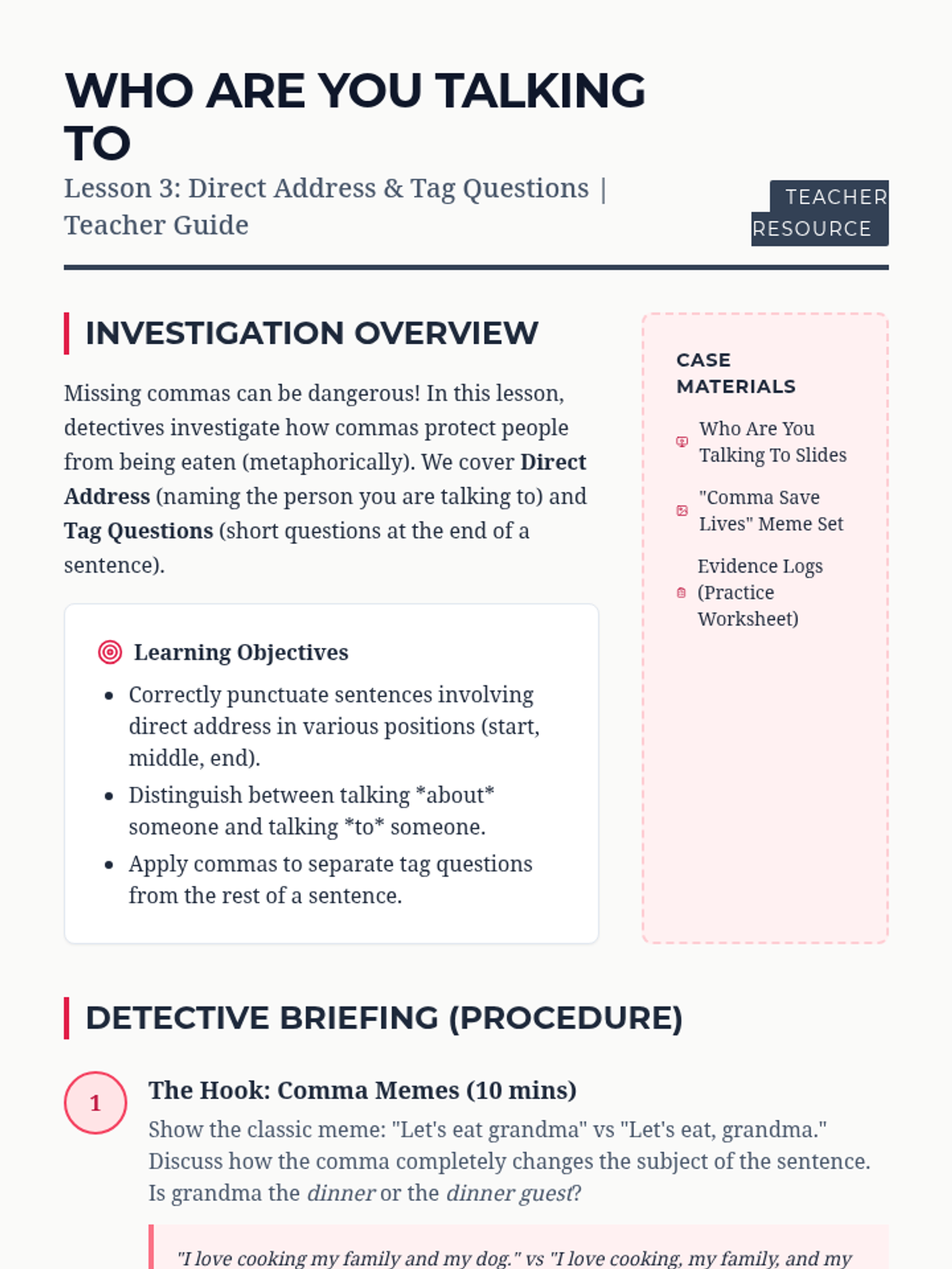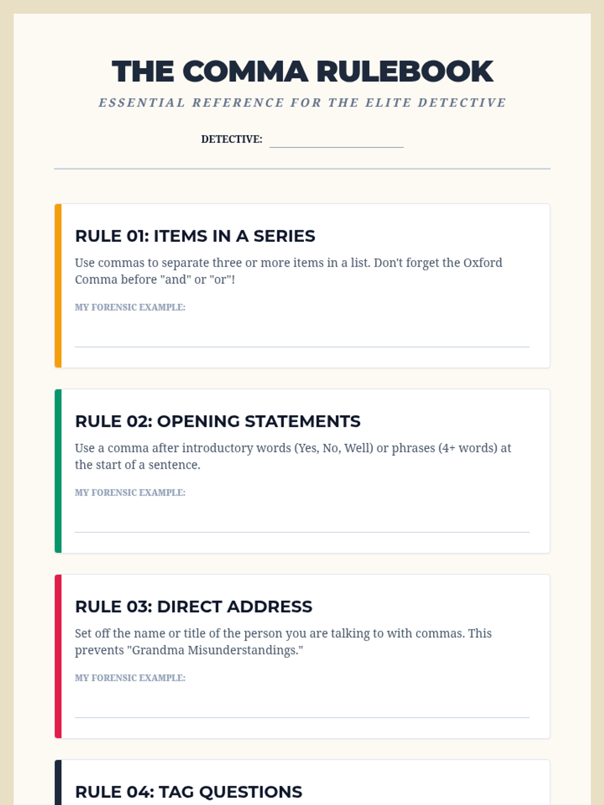 A detective-themed grammar unit where 5th graders solve 'Comma Case Files'. Students master advanced comma usage—including series, introductory elements, direct address, and compound sentences—through gamified challenges to create a final 'Comma Rulebook' for clear communication.